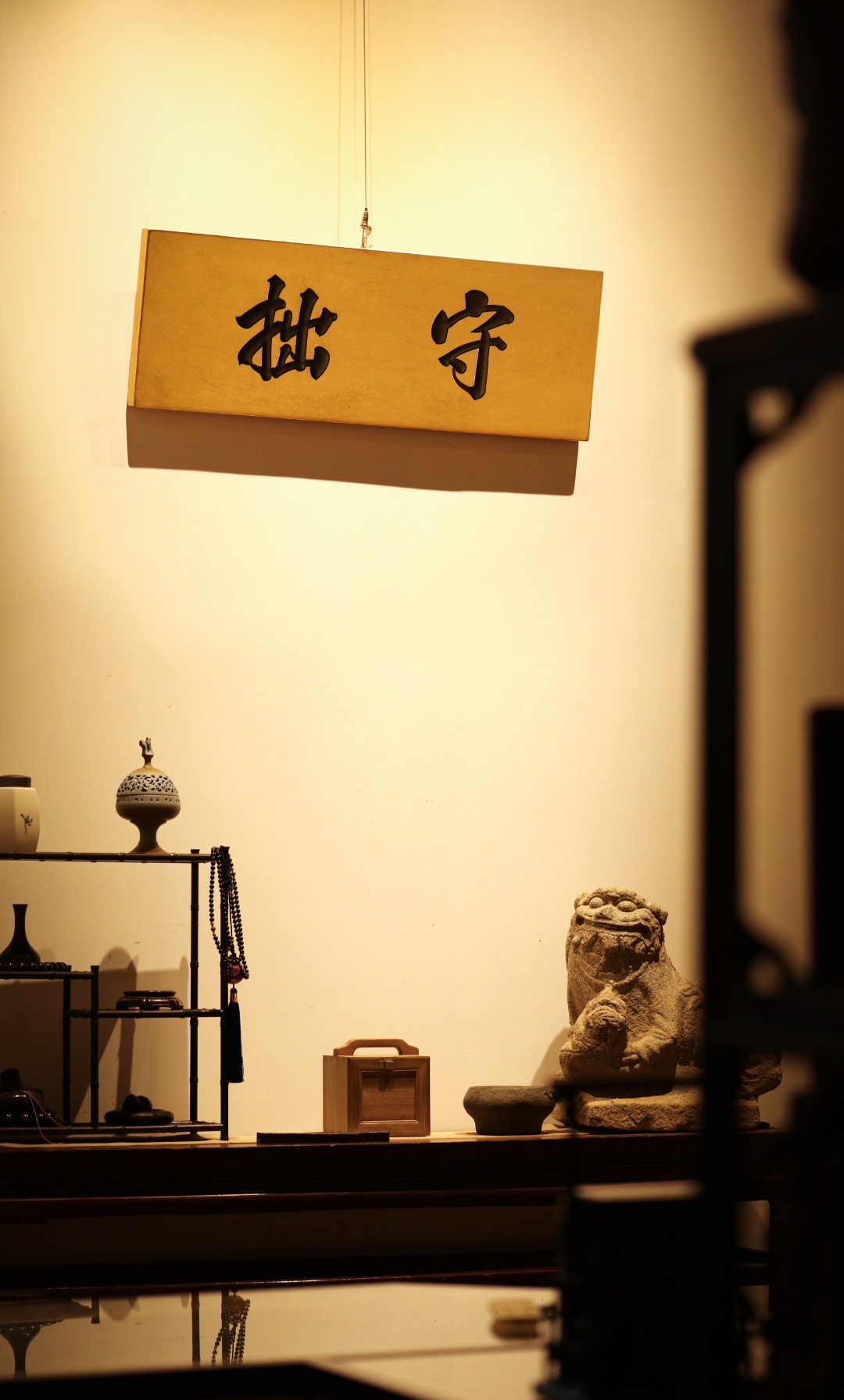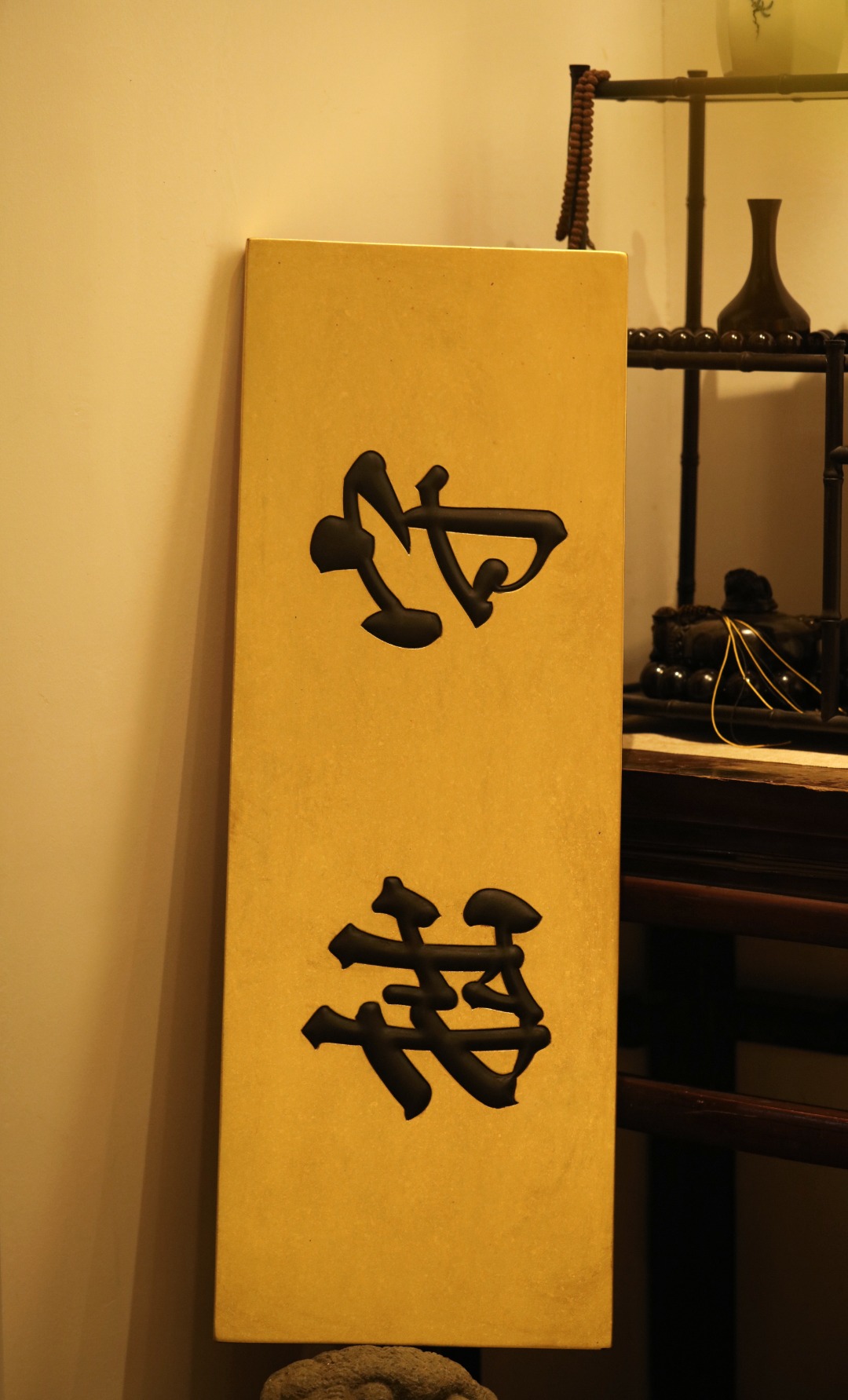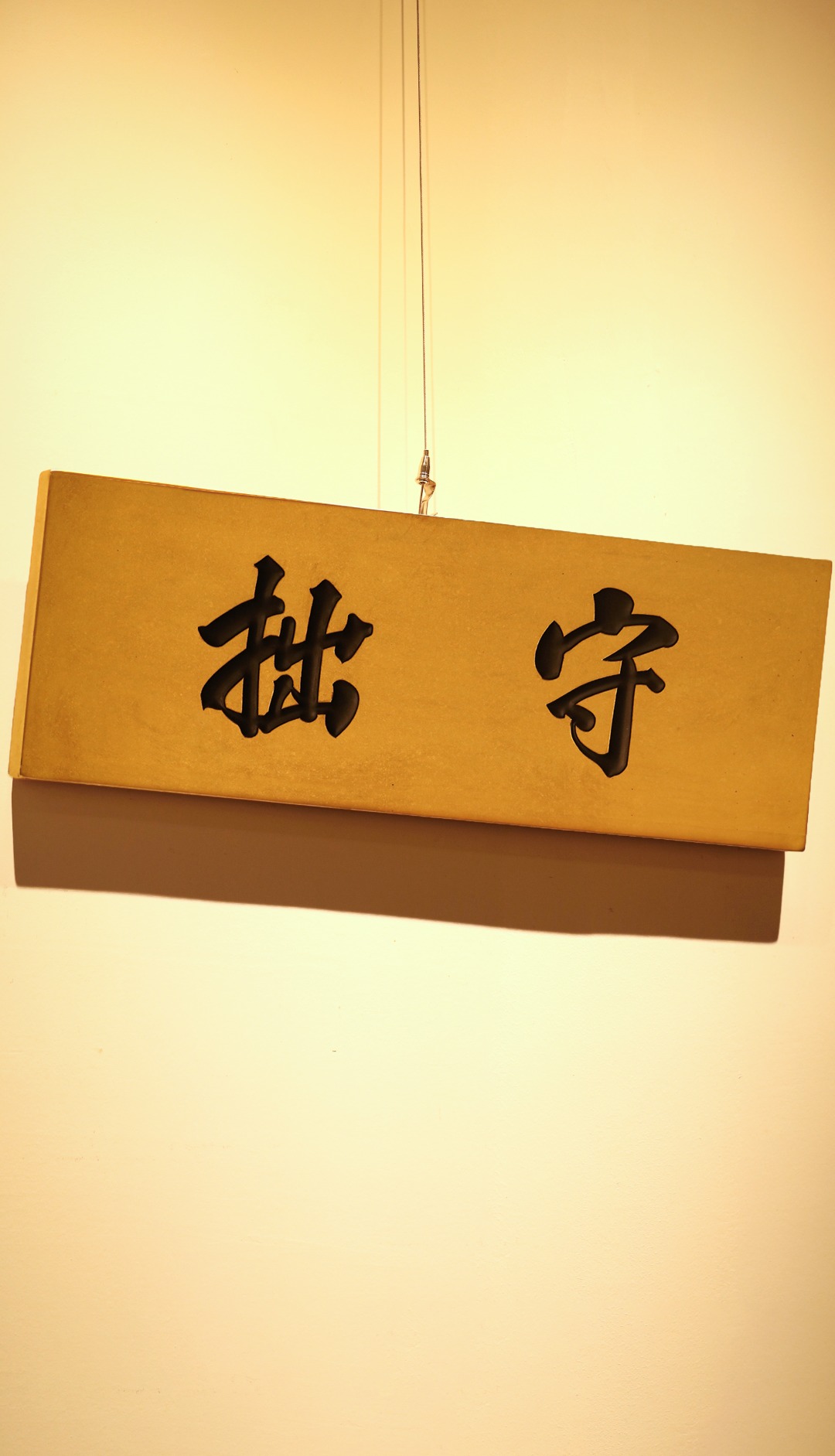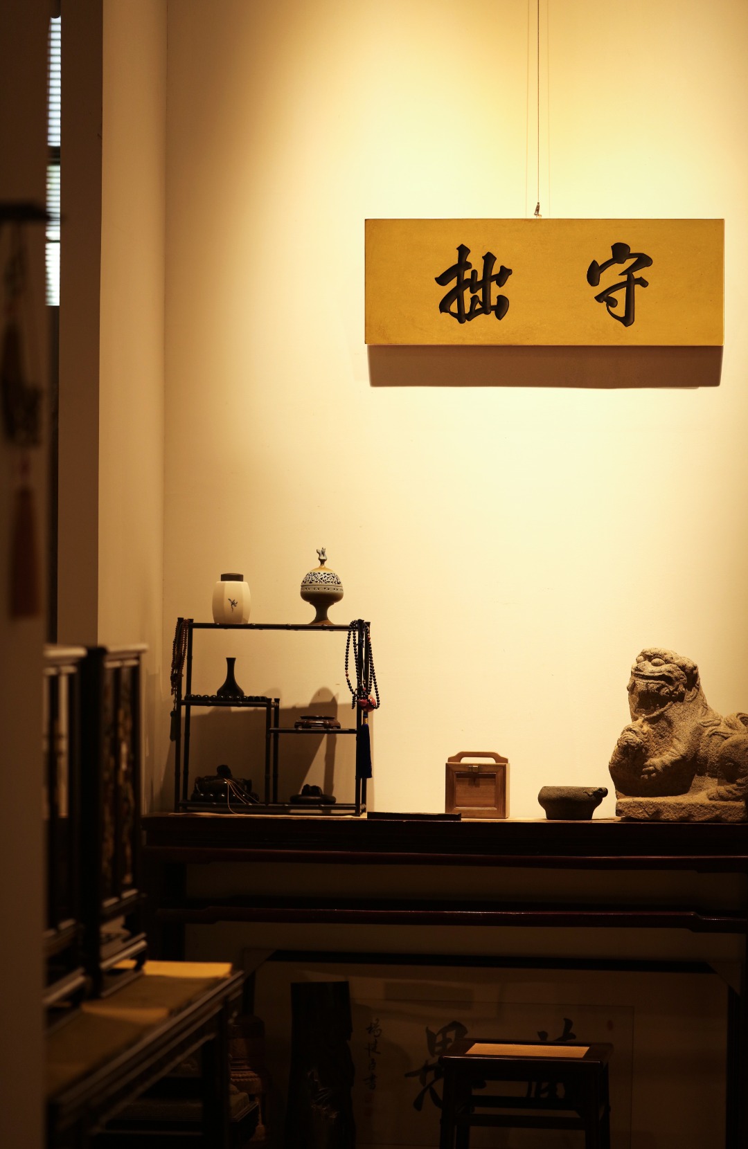 老楠木板新工,手工刻画,题字:"守拙,"面饰金箔。几字体酣畅浑厚,苍劲有力,悬于厅堂文房,可添文史雅蕴。