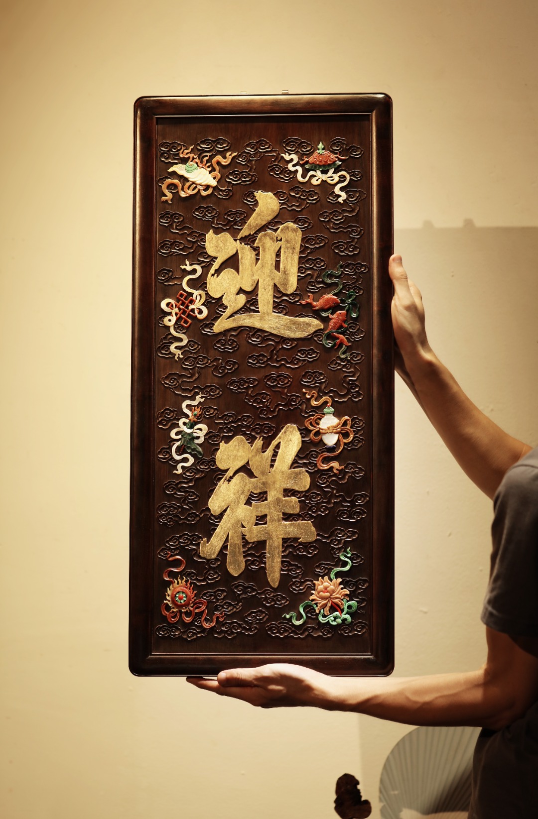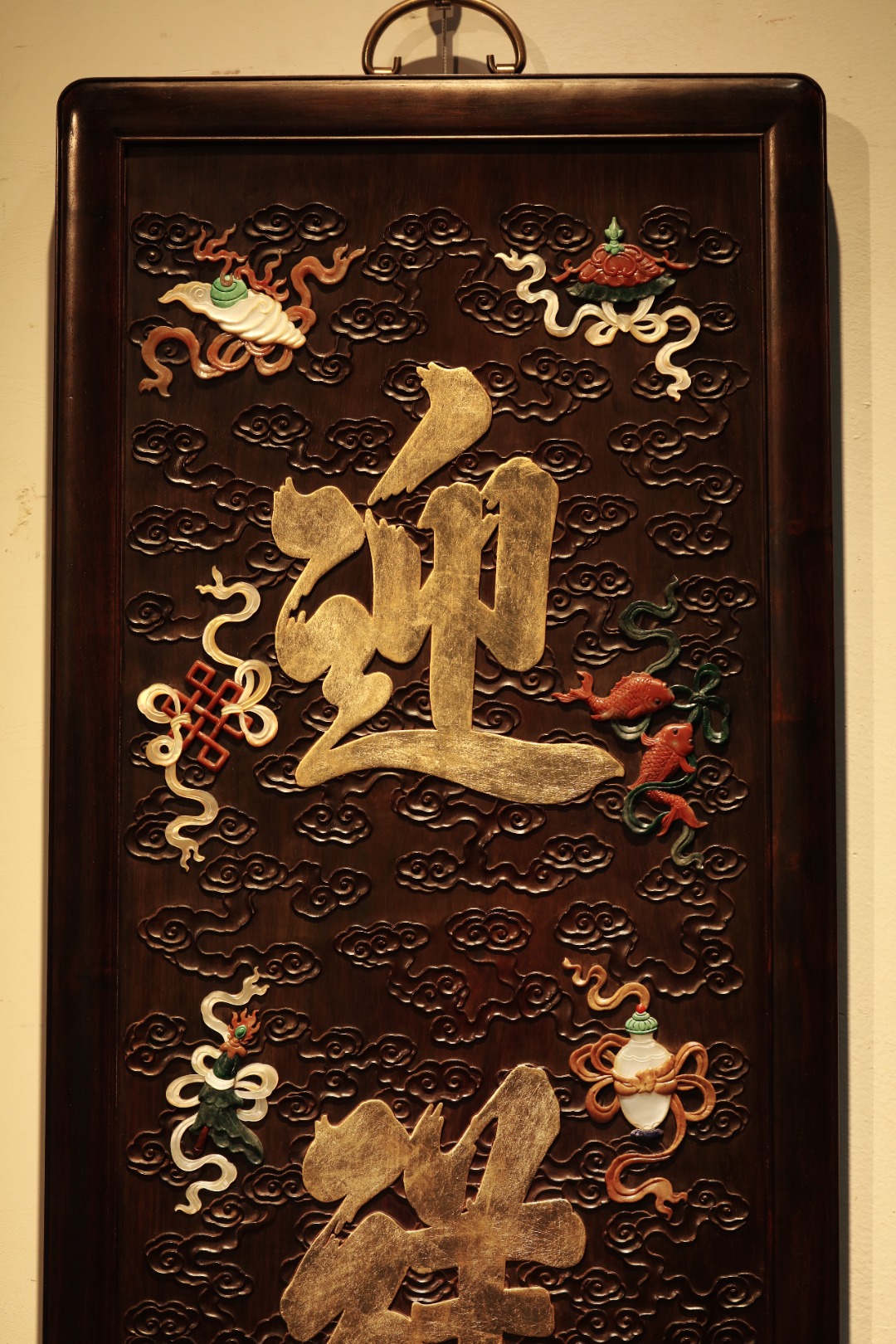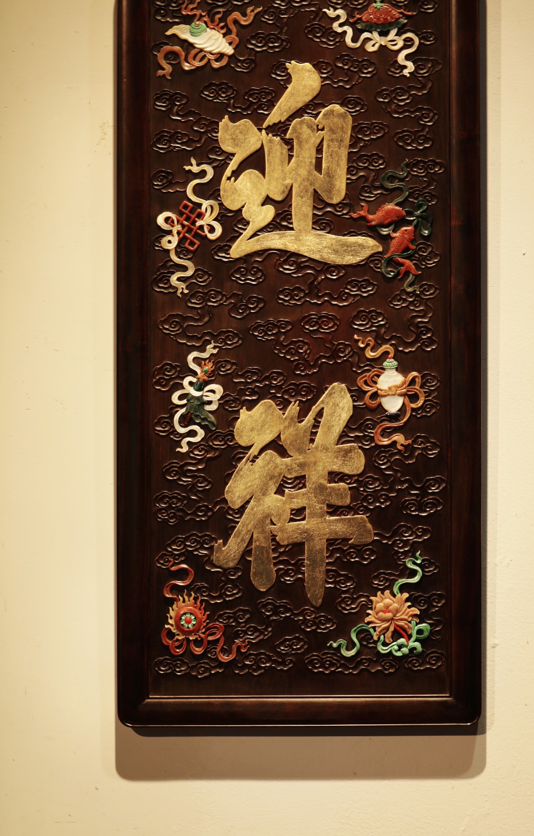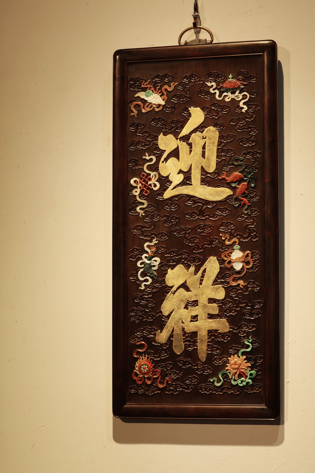 大红酸枝独板老料制,题字“迎祥”贴就金箔。祥云纹样为底纹,百宝嵌蕴玉集珍、配色清雅,寓多子、多寿、多福。悬于文房雅室,富庆有余富贵古典。