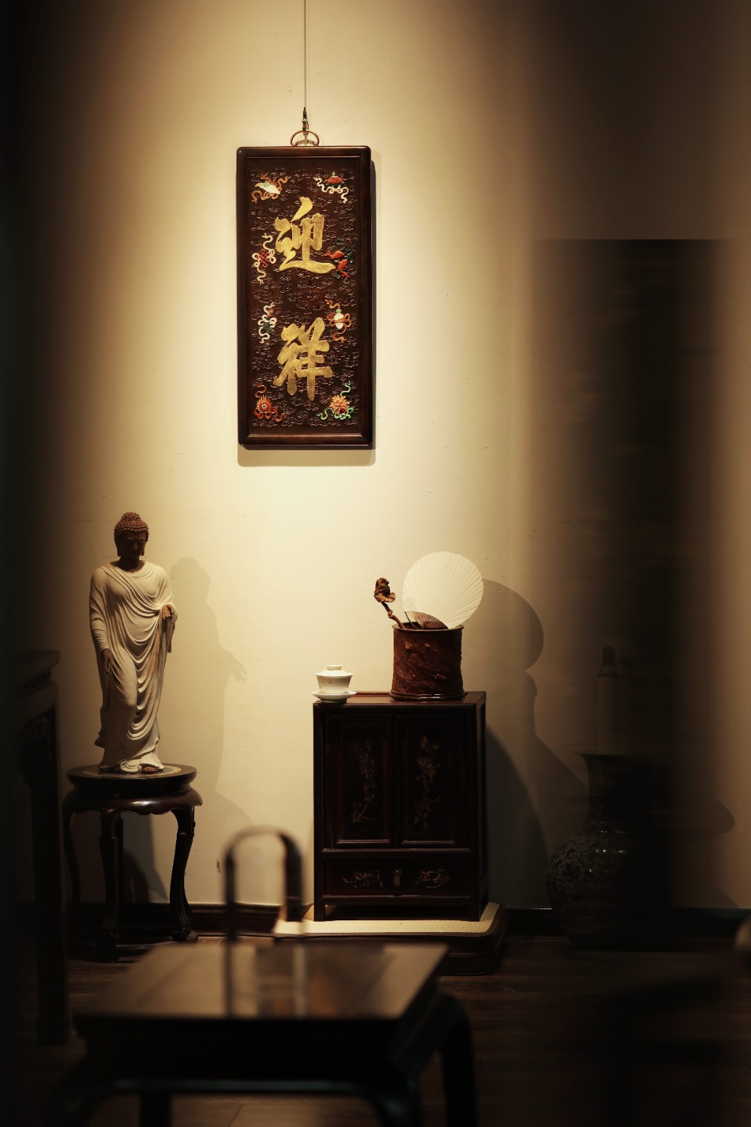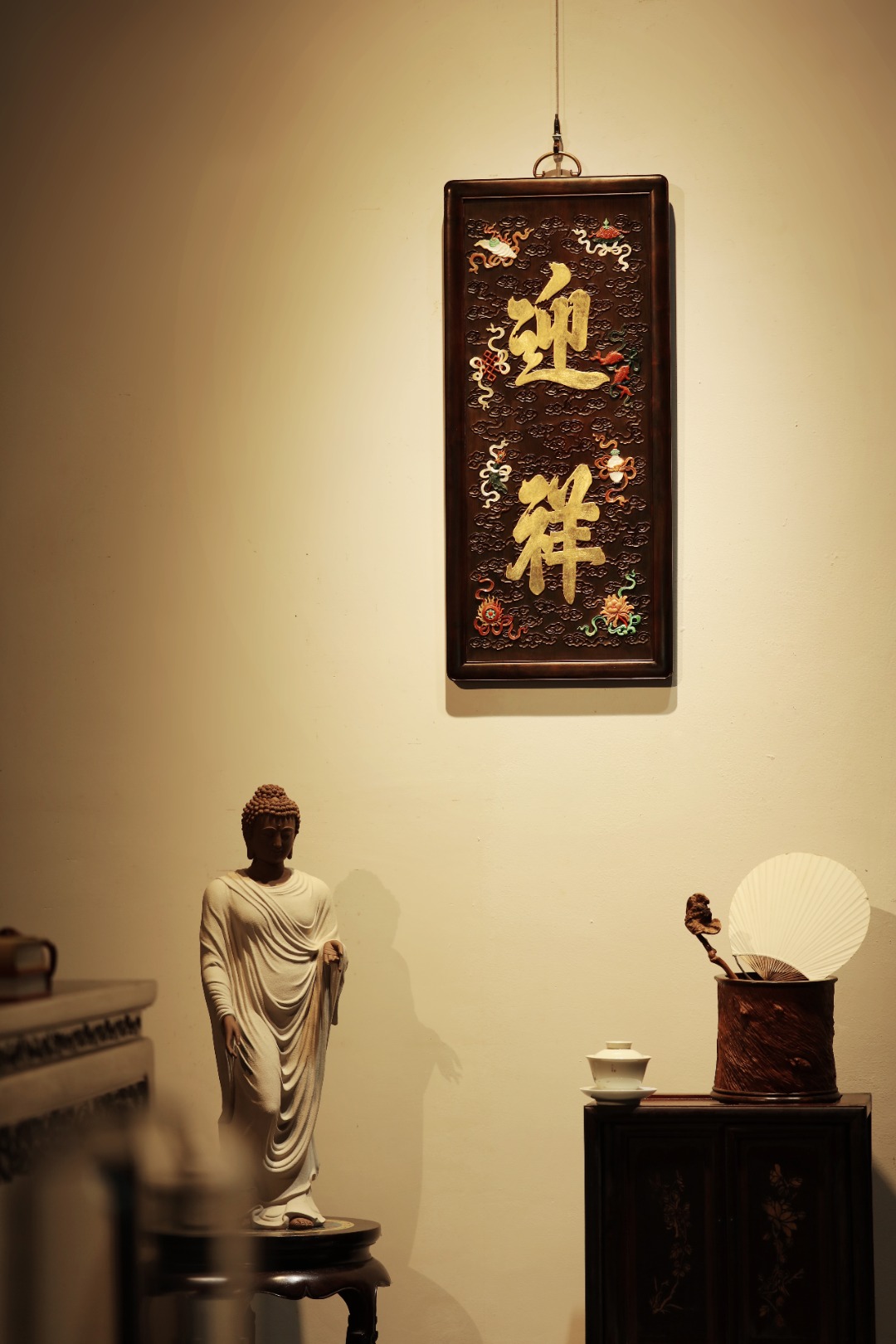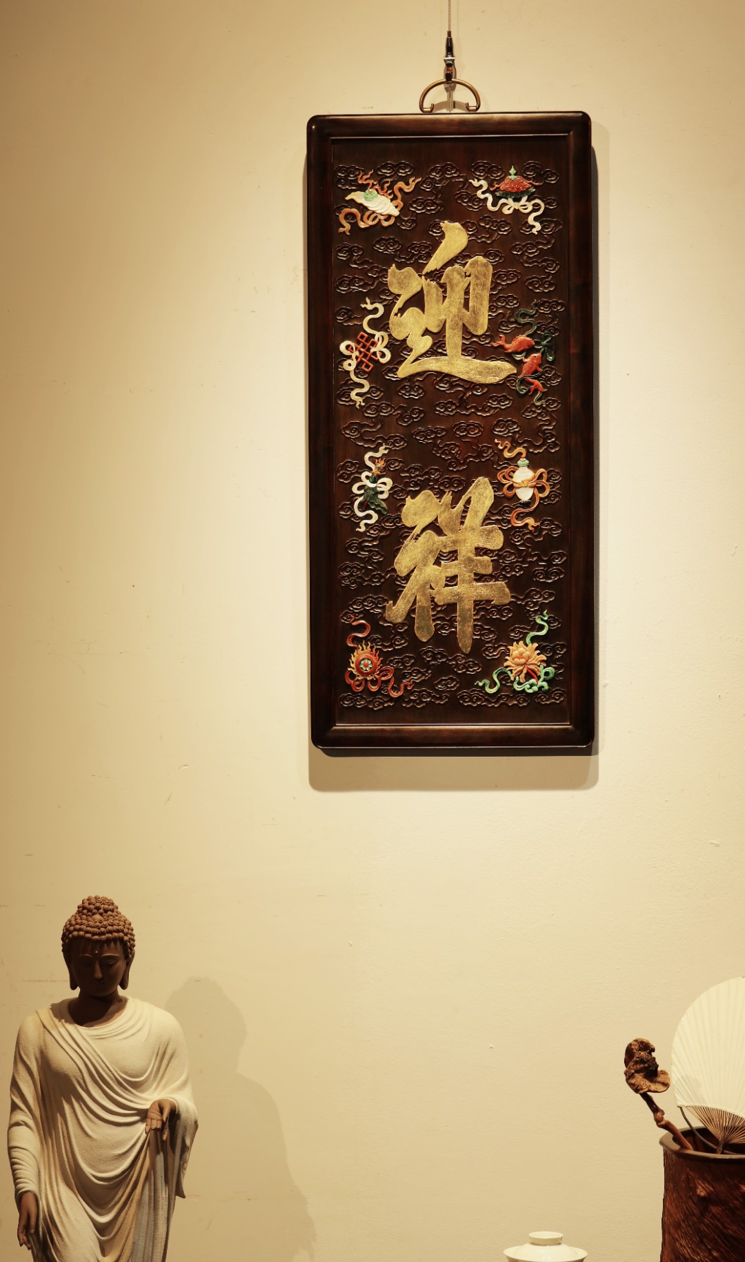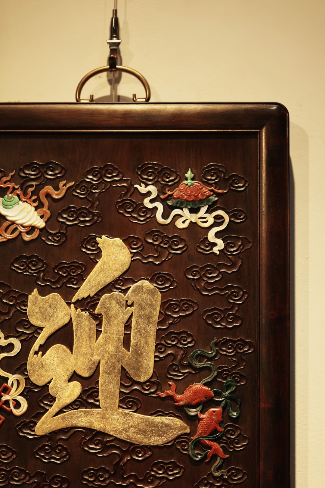 大红酸枝独板老料制,题字“迎祥”贴就金箔。祥云纹样为底纹,百宝嵌蕴玉集珍、配色清雅,寓多子、多寿、多福。悬于文房雅室,富庆有余富贵古典。