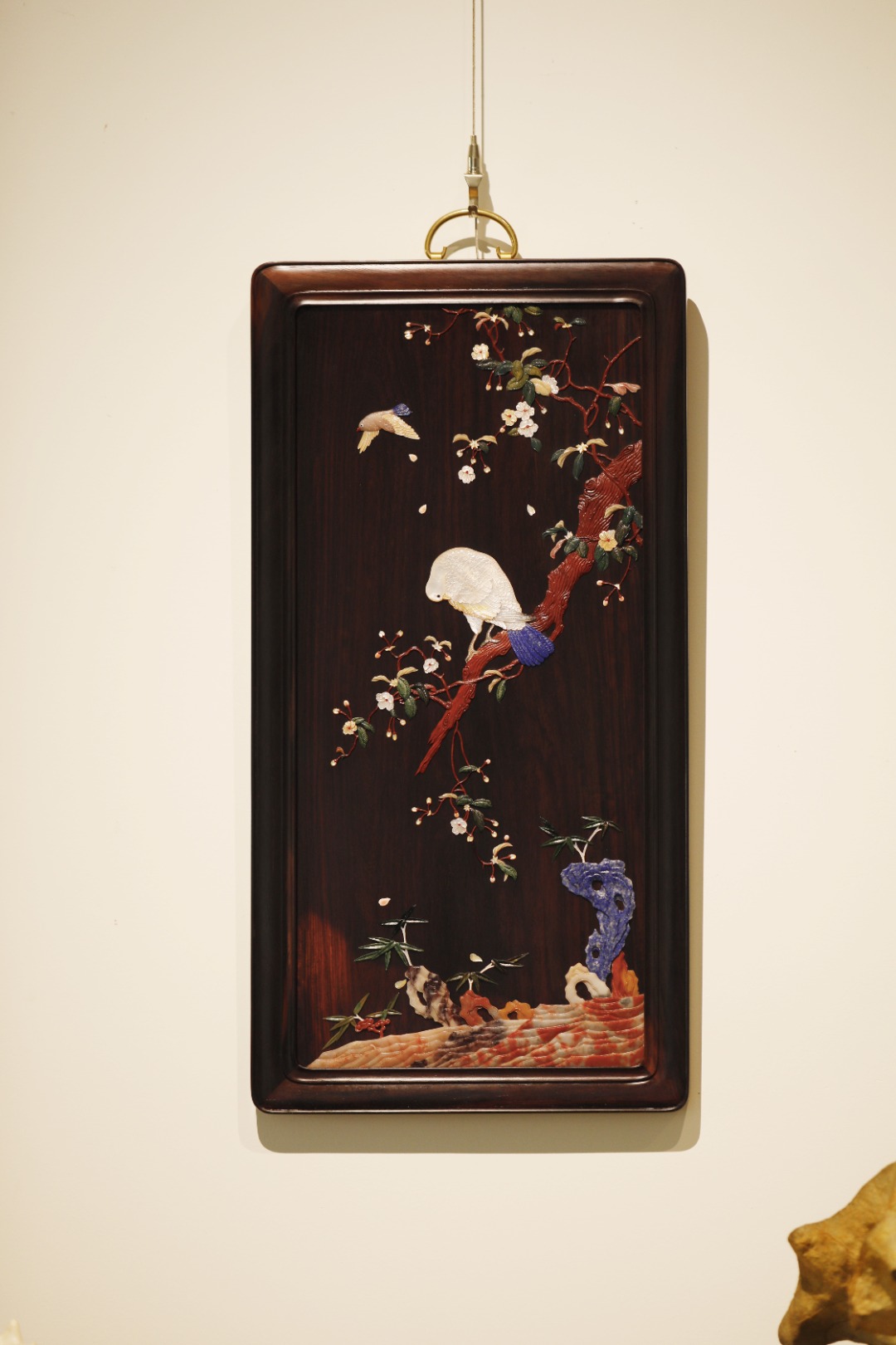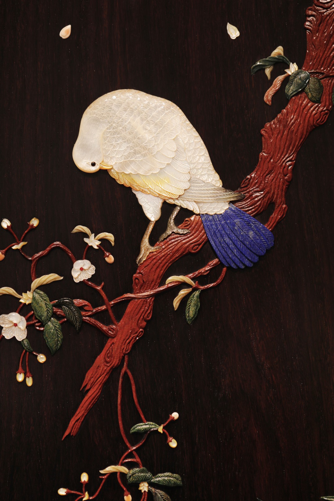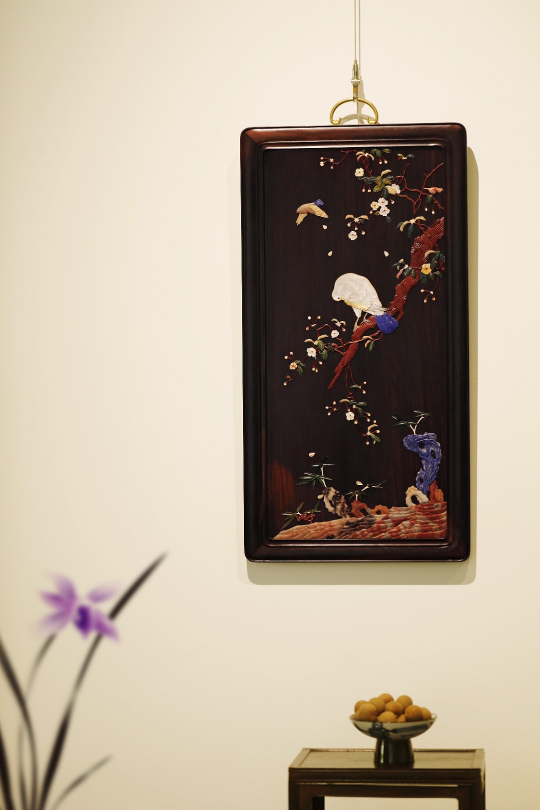 屏心百宝嵌作花鸟图, 集多材质于一体,