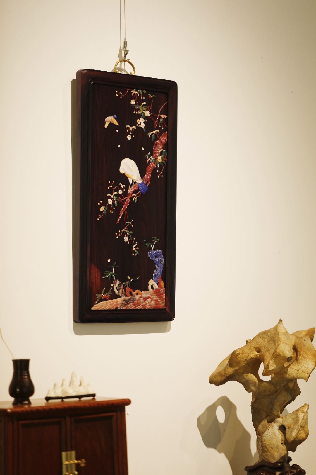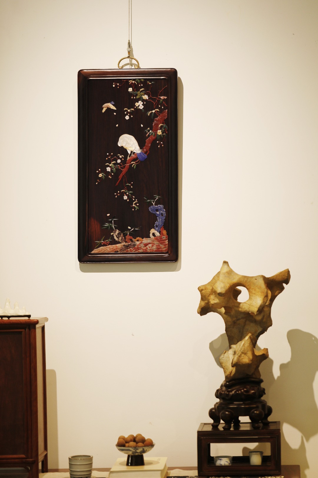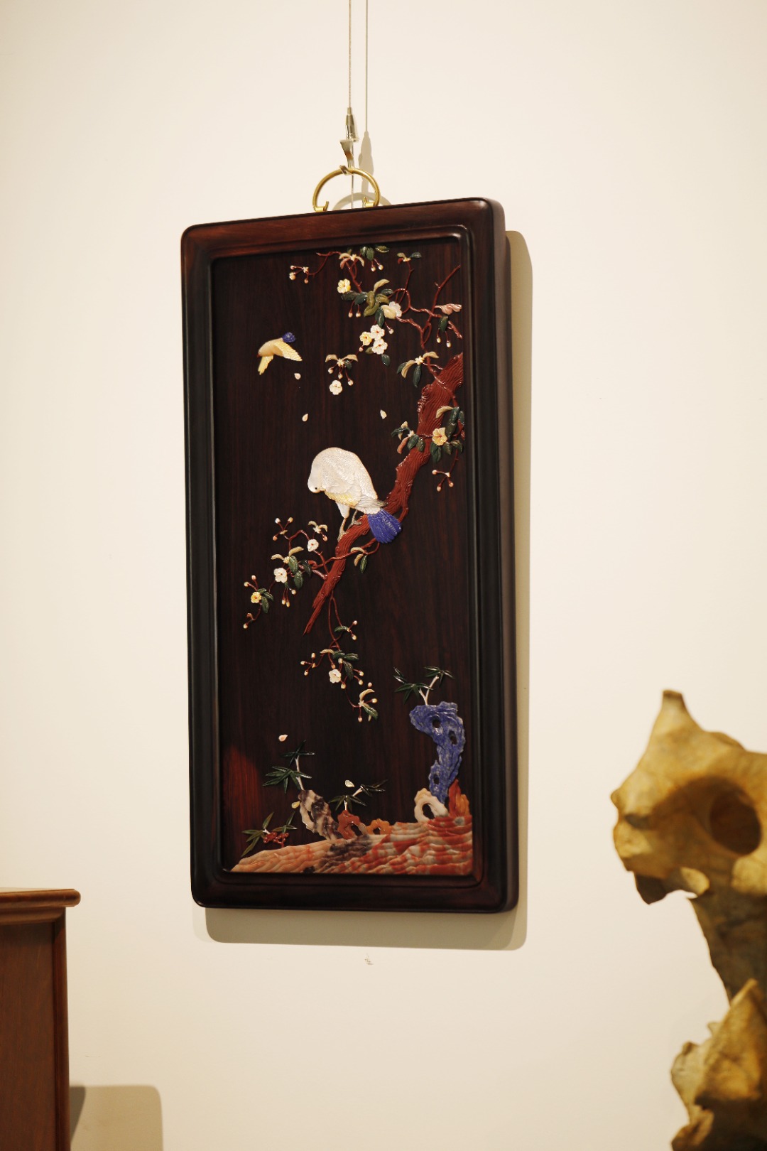 屏心百宝嵌作花鸟图, 集多材质于一体,