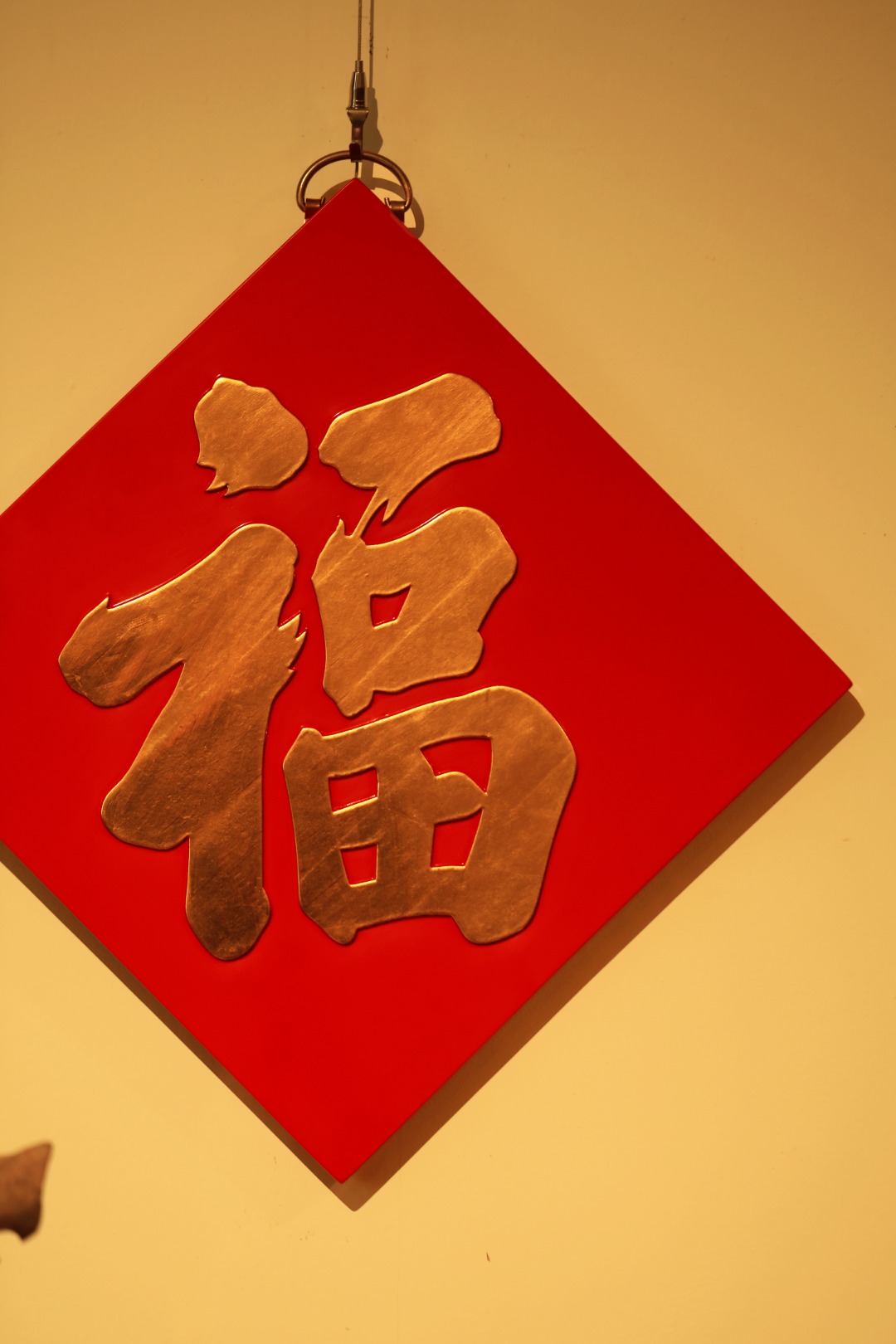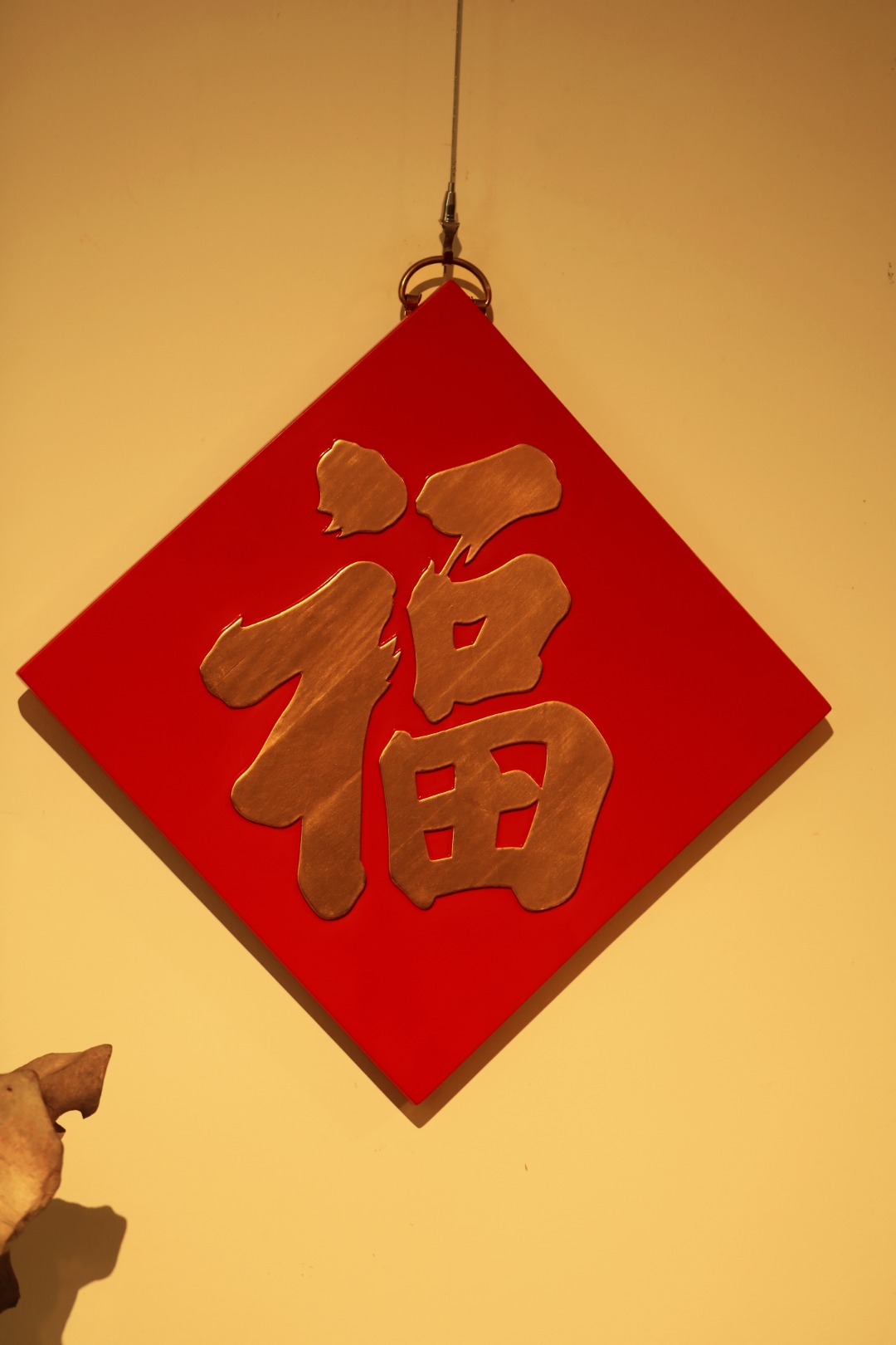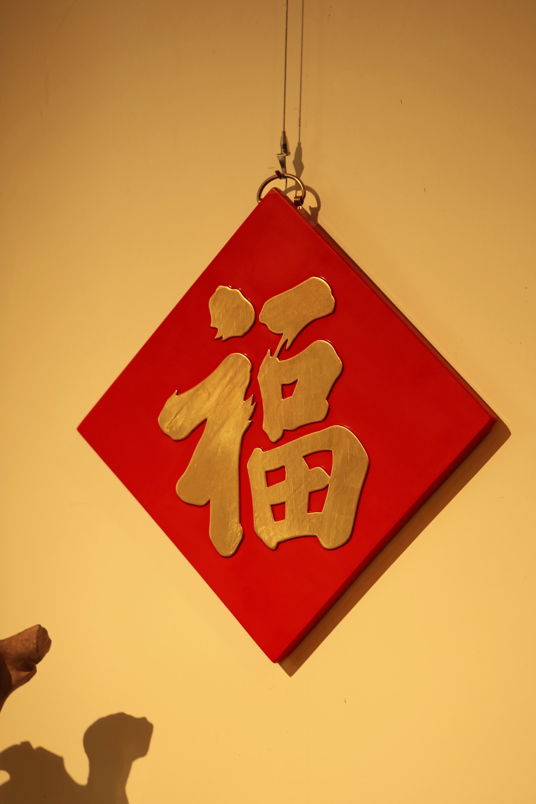 老楠木手刻,朱红漆打底,贴真金箔题字,空间造景,添文史底蕴。意为洪福、大福、多子多福。