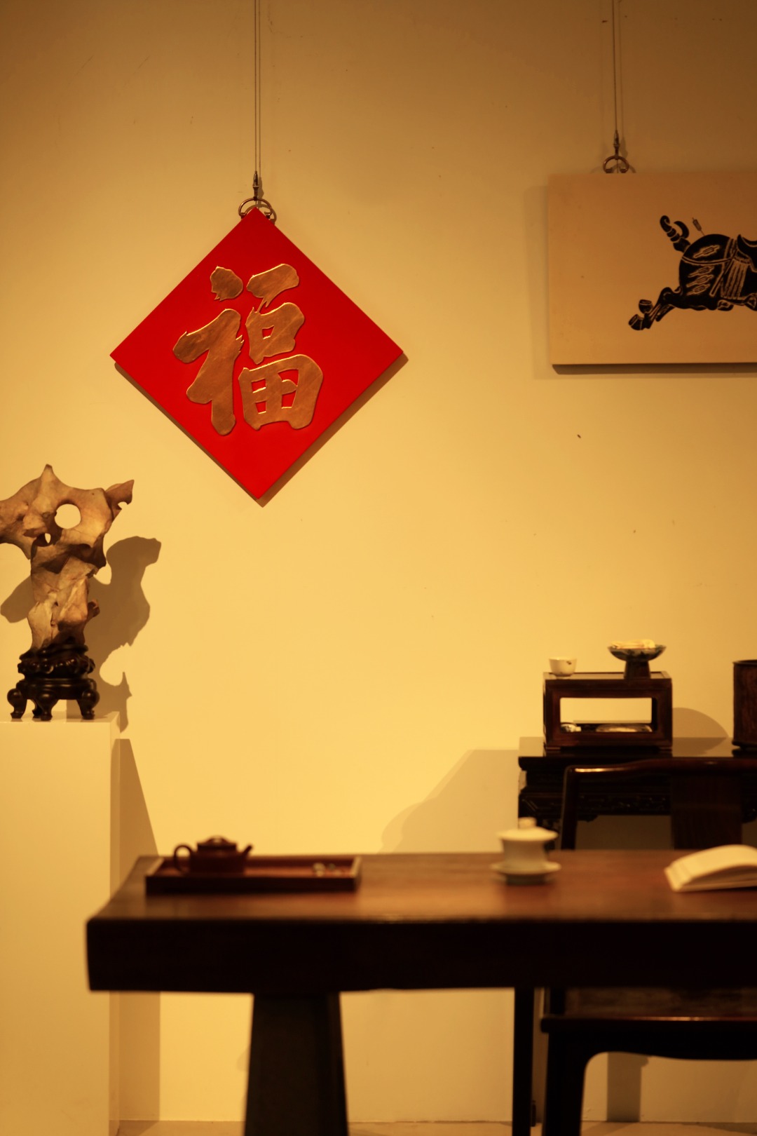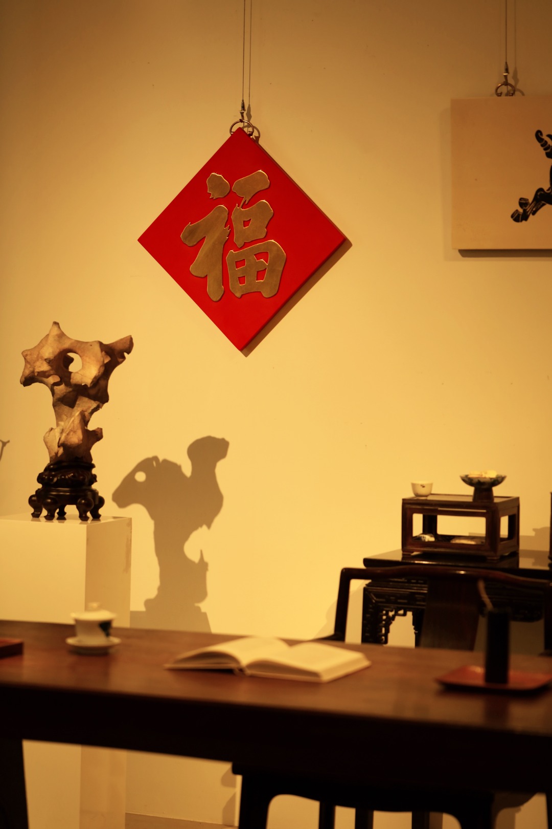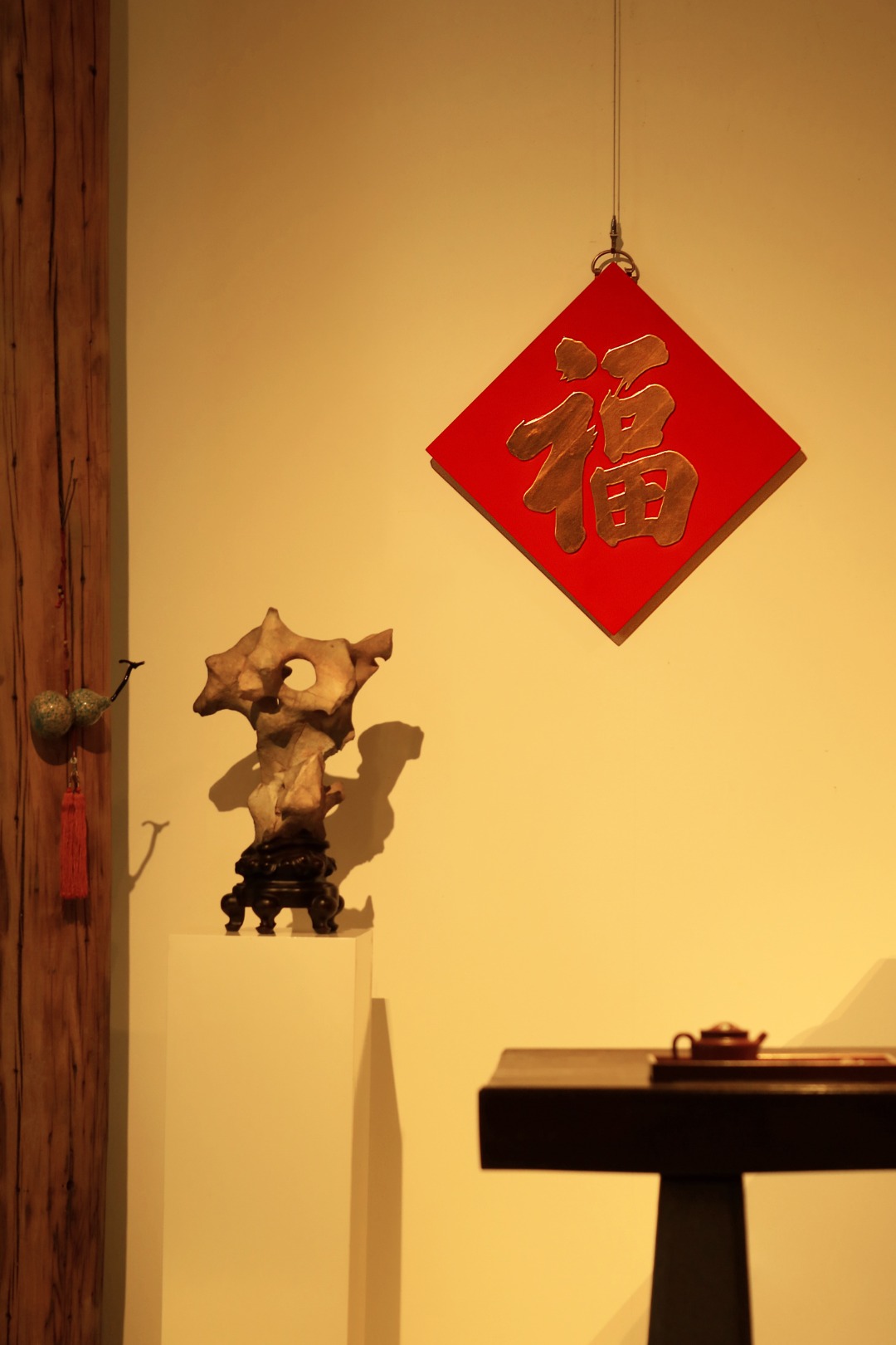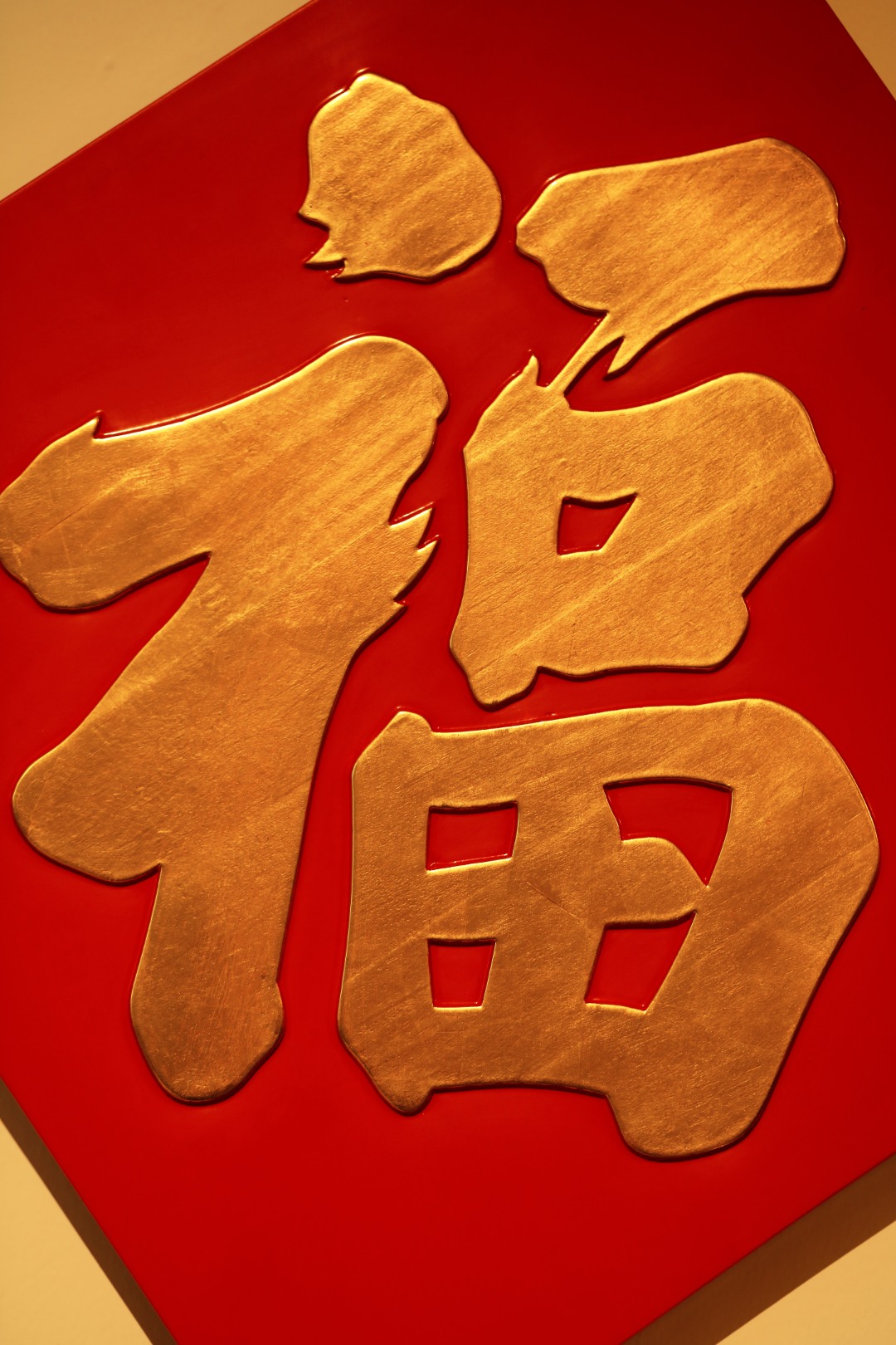 老楠木手刻,朱红漆打底,贴真金箔题字,空间造景,添文史底蕴。意为洪福、大福、多子多福。