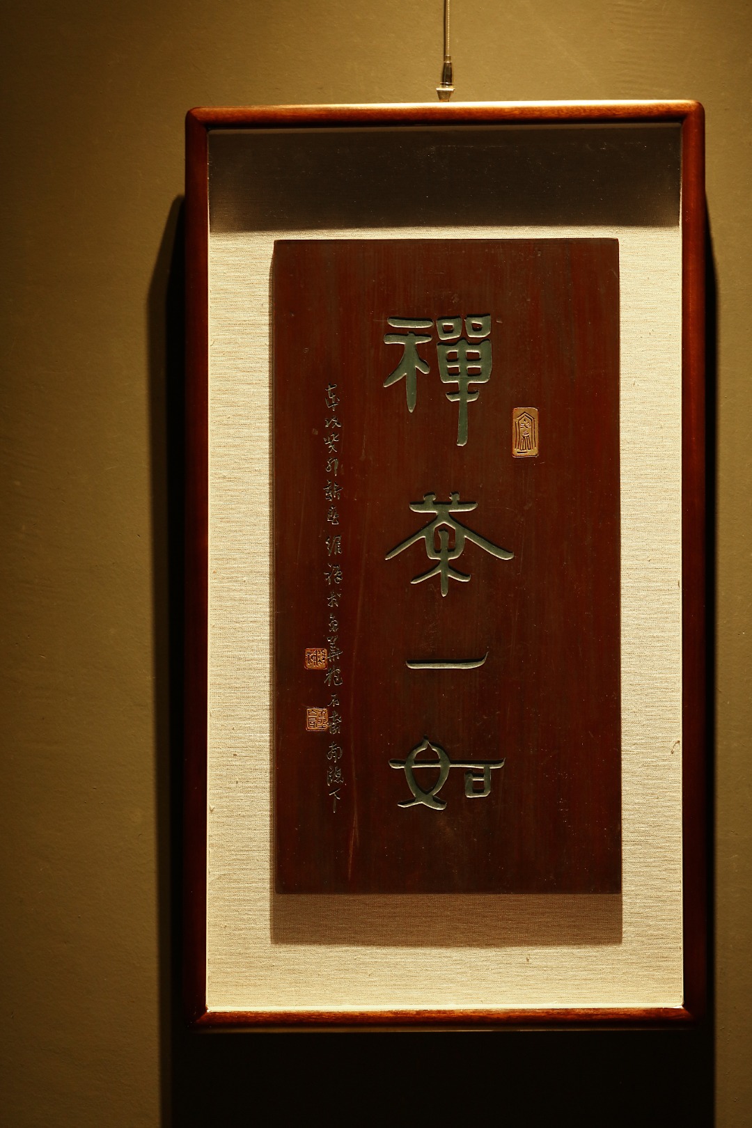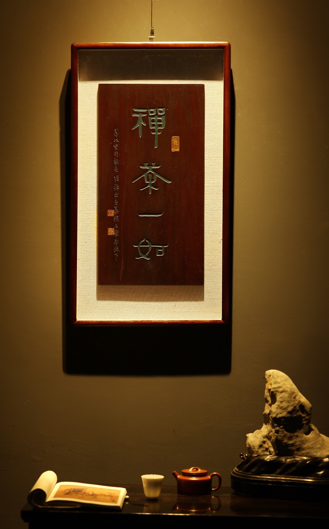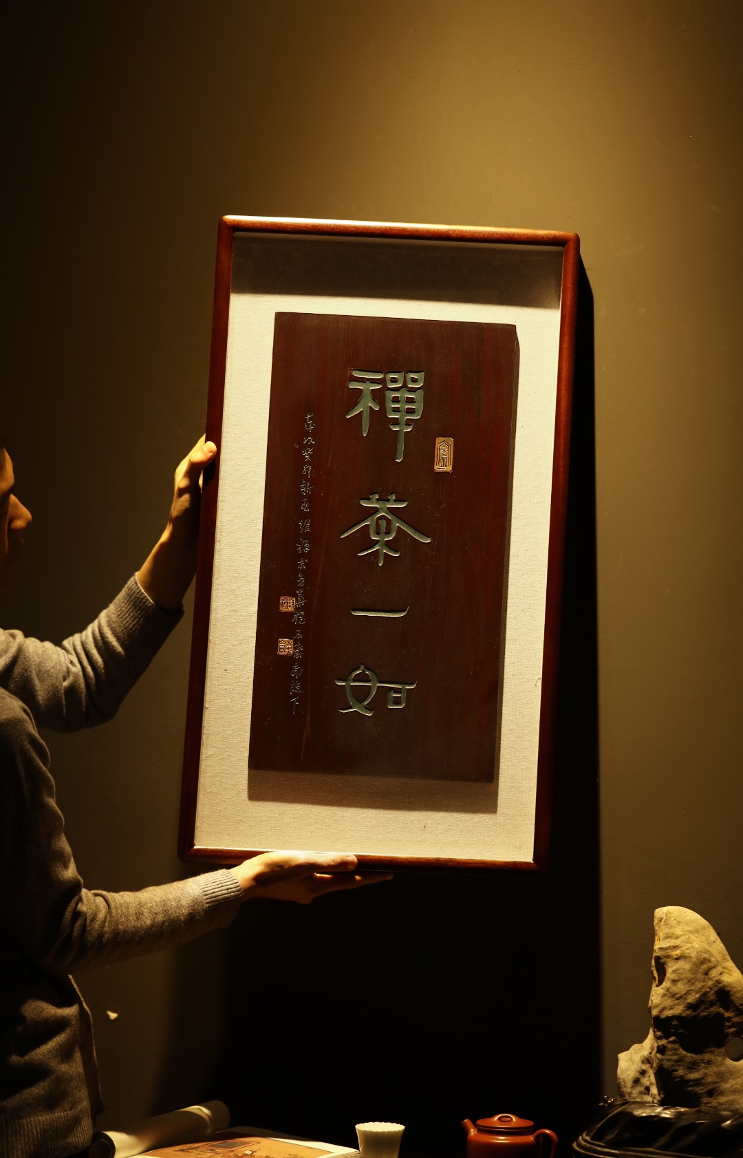 取旧时老板料,表框作画,手刻字画、大漆描绘,原皮壳沉着古朴,悬于空间,深得意象真趣,人生理趣,为文房雅室佳选。