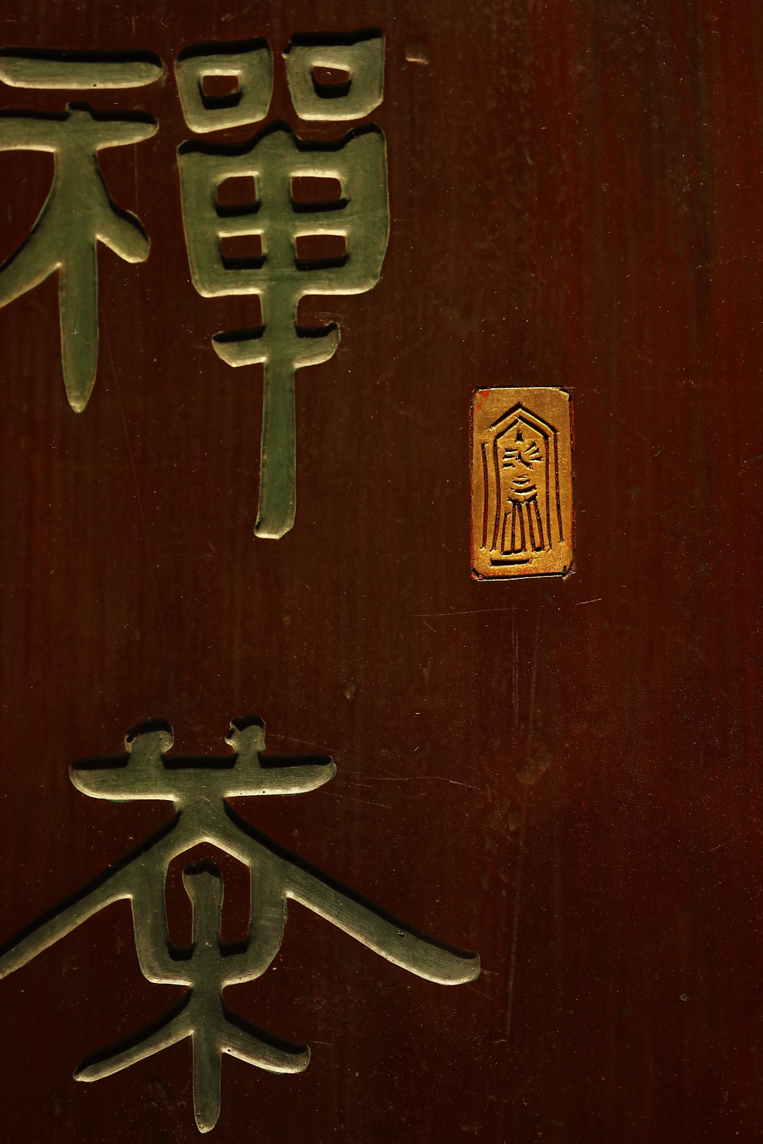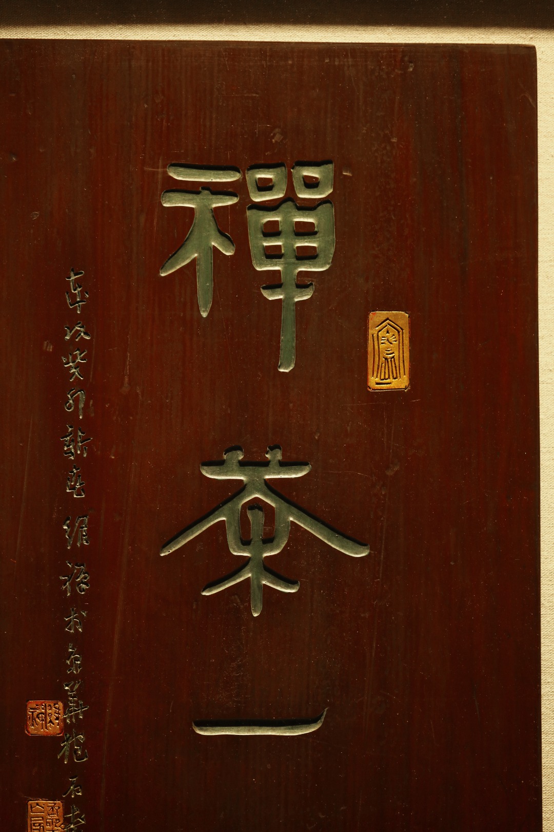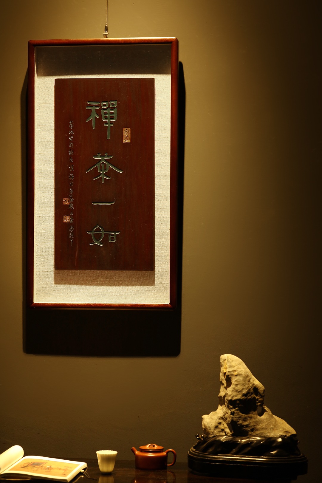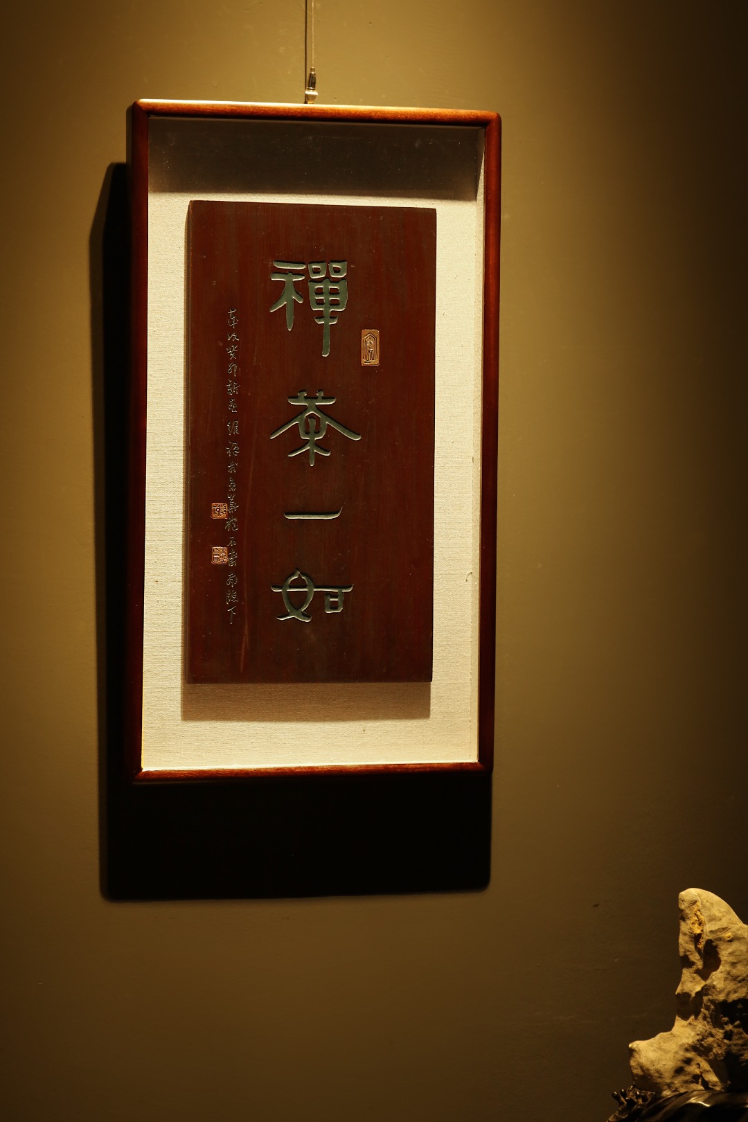 取旧时老板料,表框作画,手刻字画、大漆描绘,原皮壳沉着古朴,悬于空间,深得意象真趣,人生理趣,为文房雅室佳选。