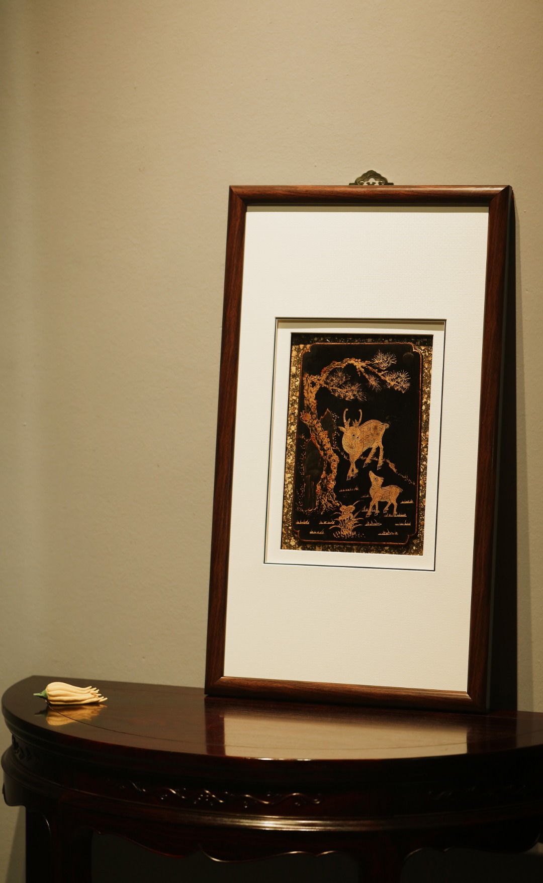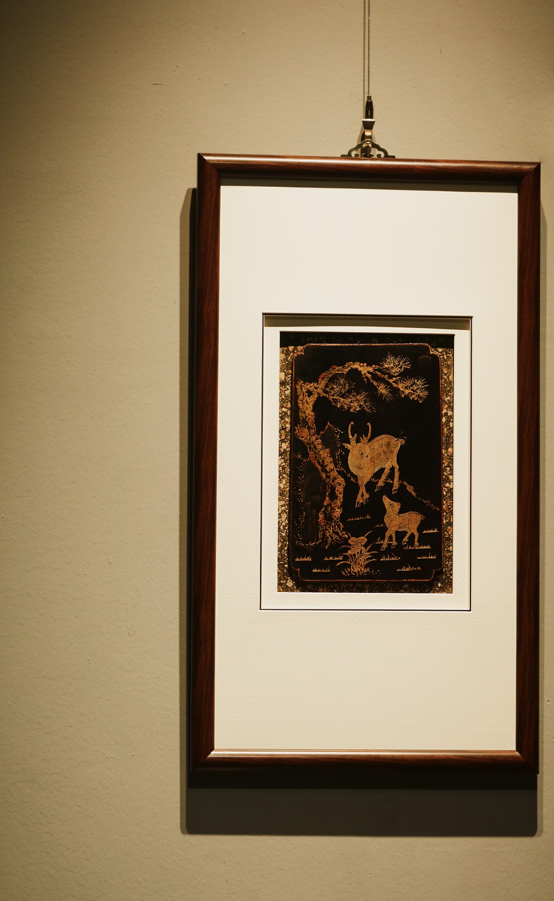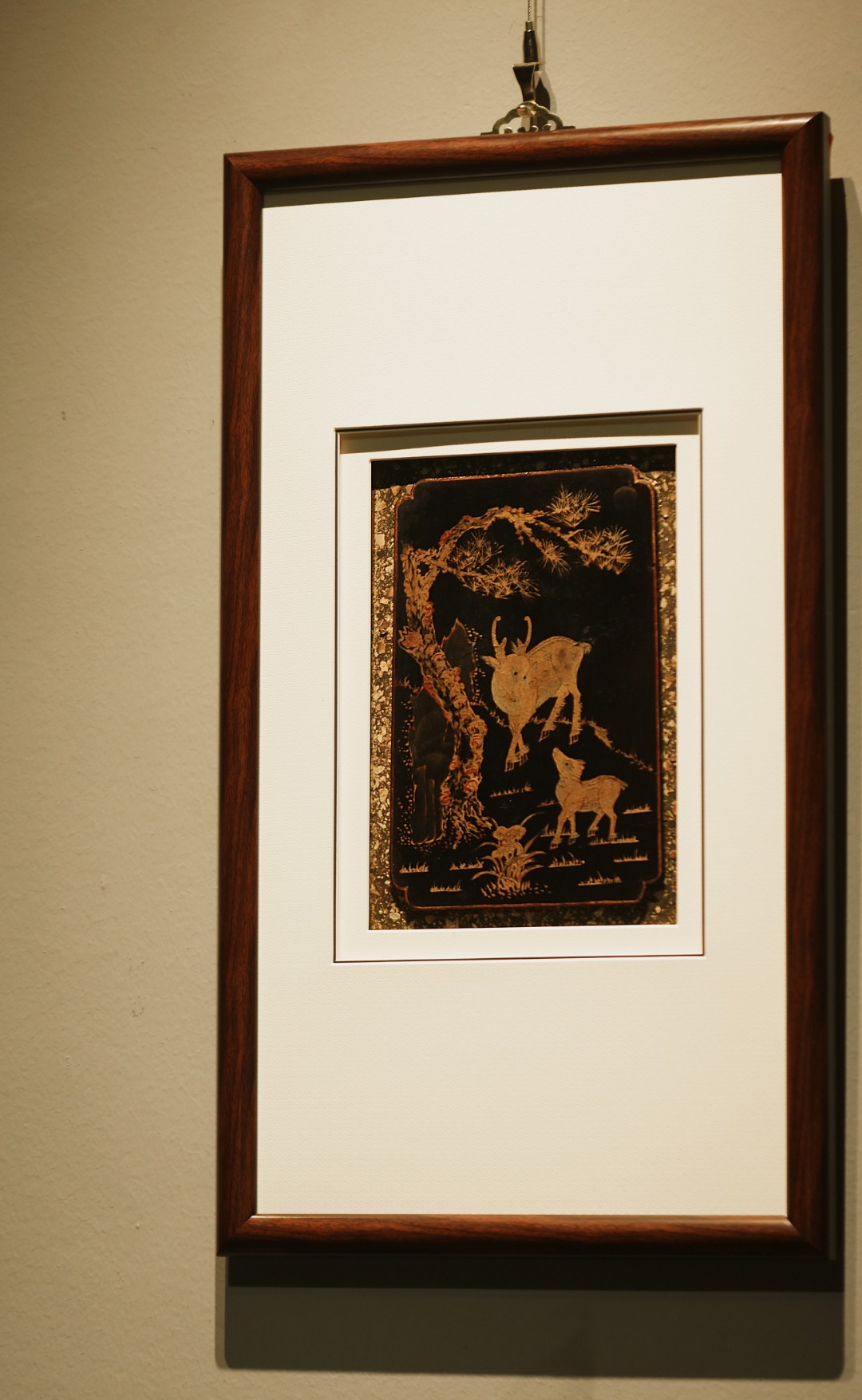 清代楠木漆画,琢刻古朴精妙,漆画作就「松鹿同春」图、。雅室、空间悬挂,祥和静谧,气韵生动,古意历久弥深。