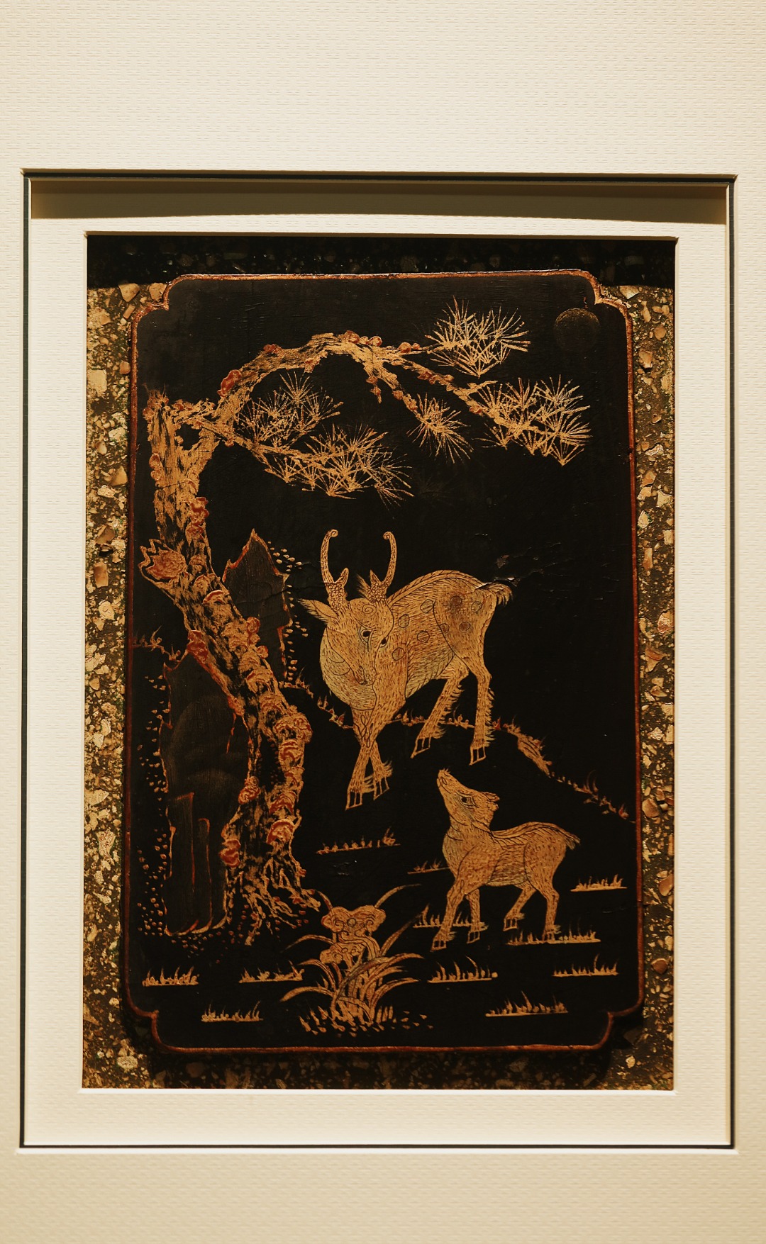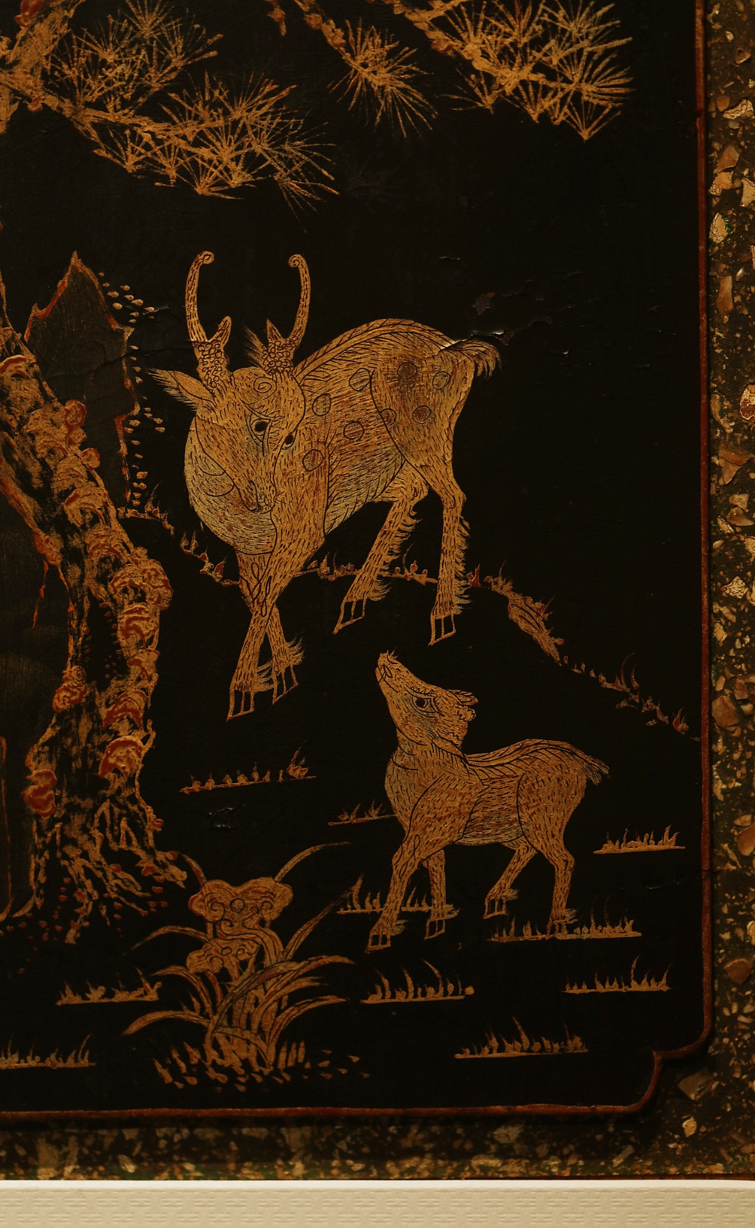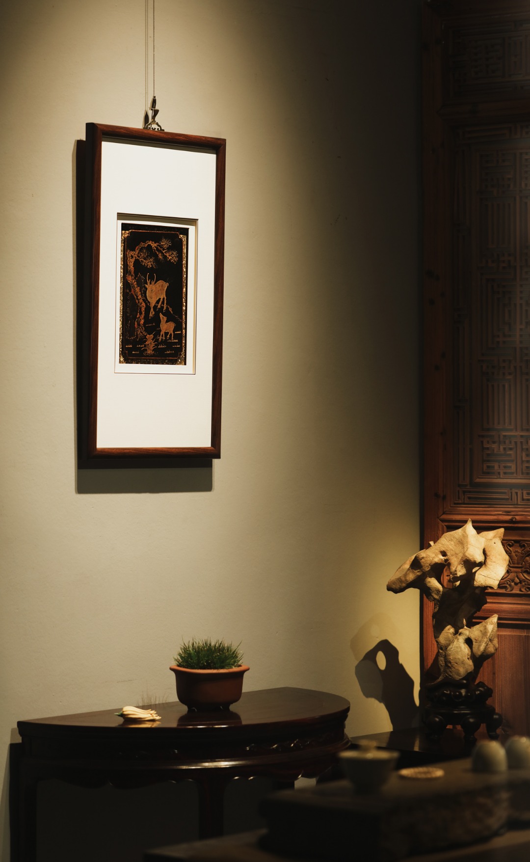 清代楠木漆画,琢刻古朴精妙,漆画作就「松鹿同春」图、。雅室、空间悬挂,祥和静谧,气韵生动,古意历久弥深。
