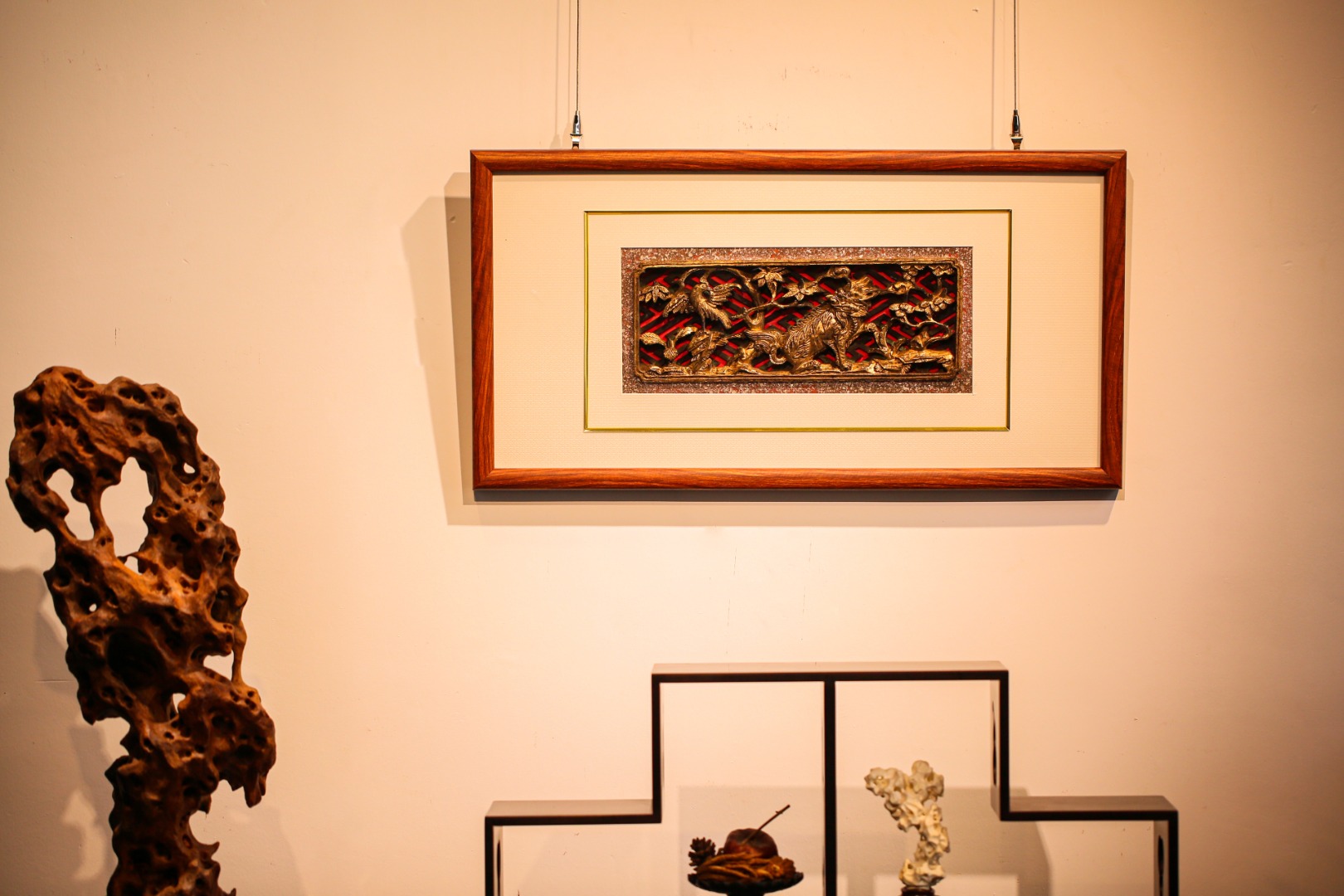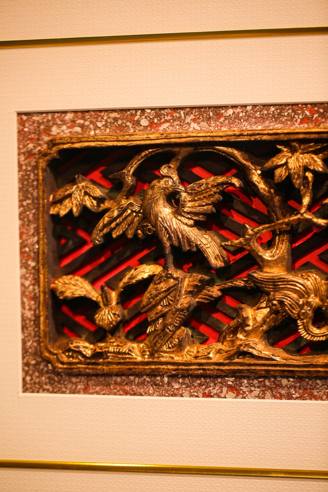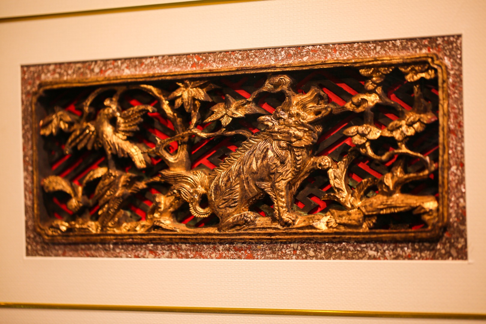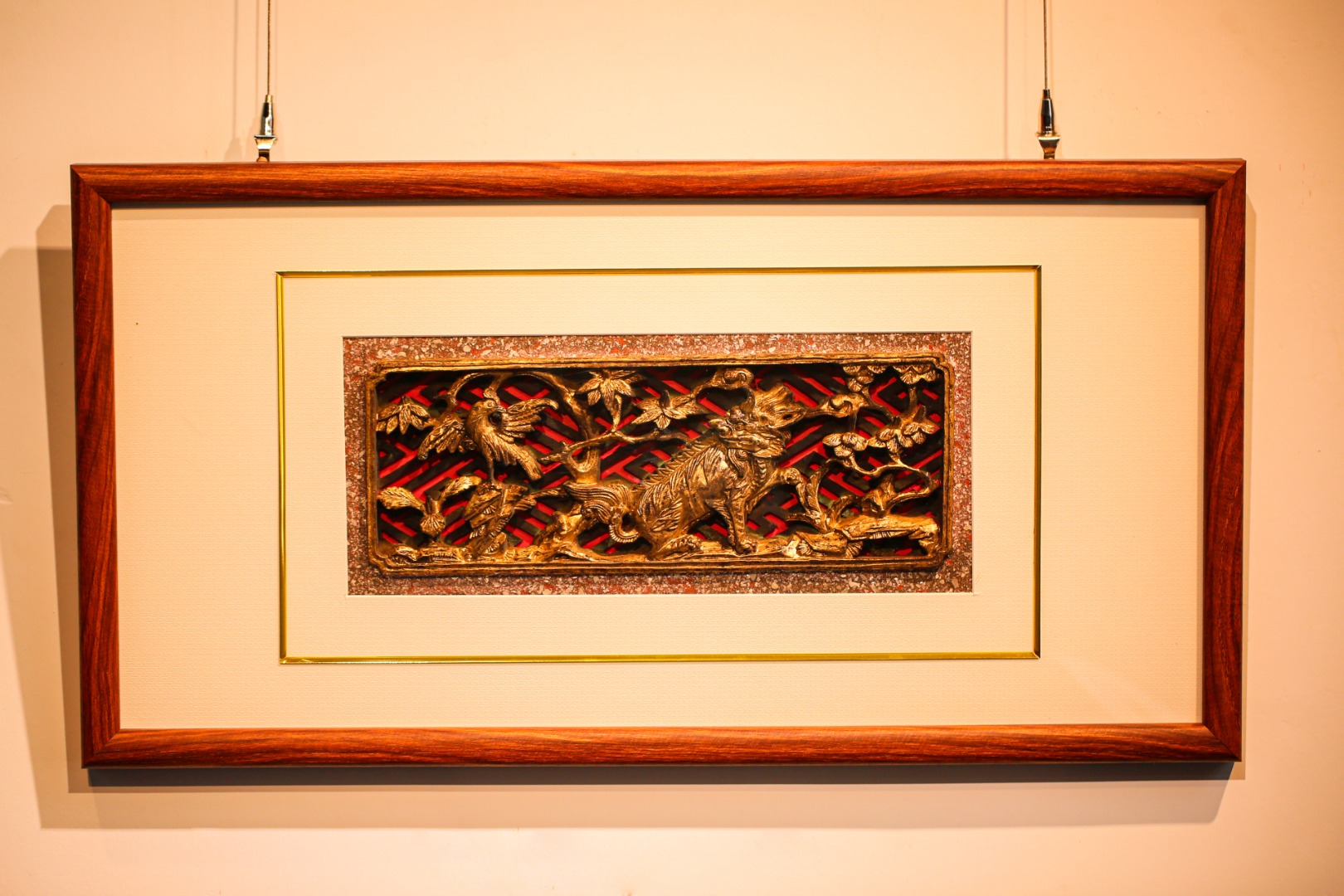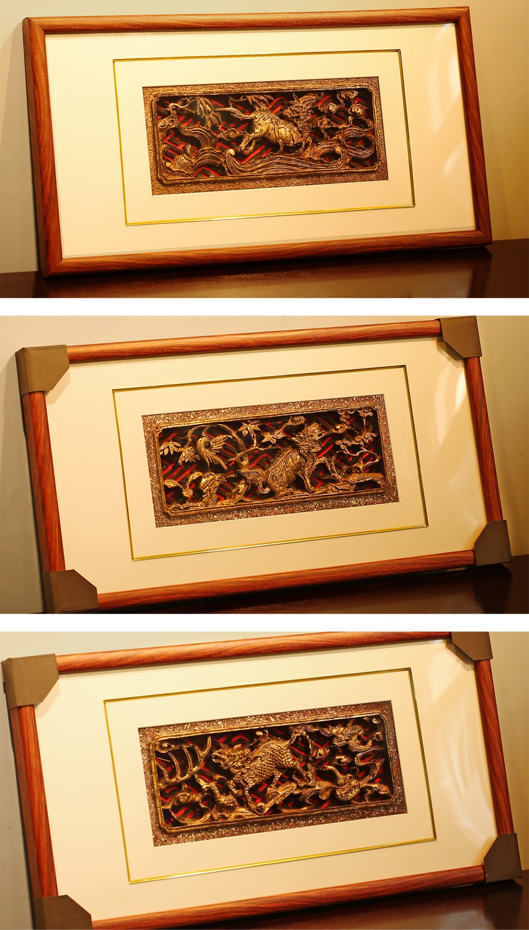 老木板镂雕,雕制麒麟,花卉,喜鹊