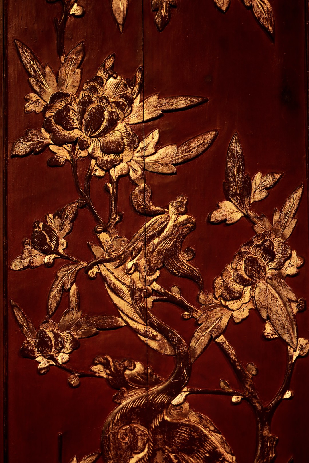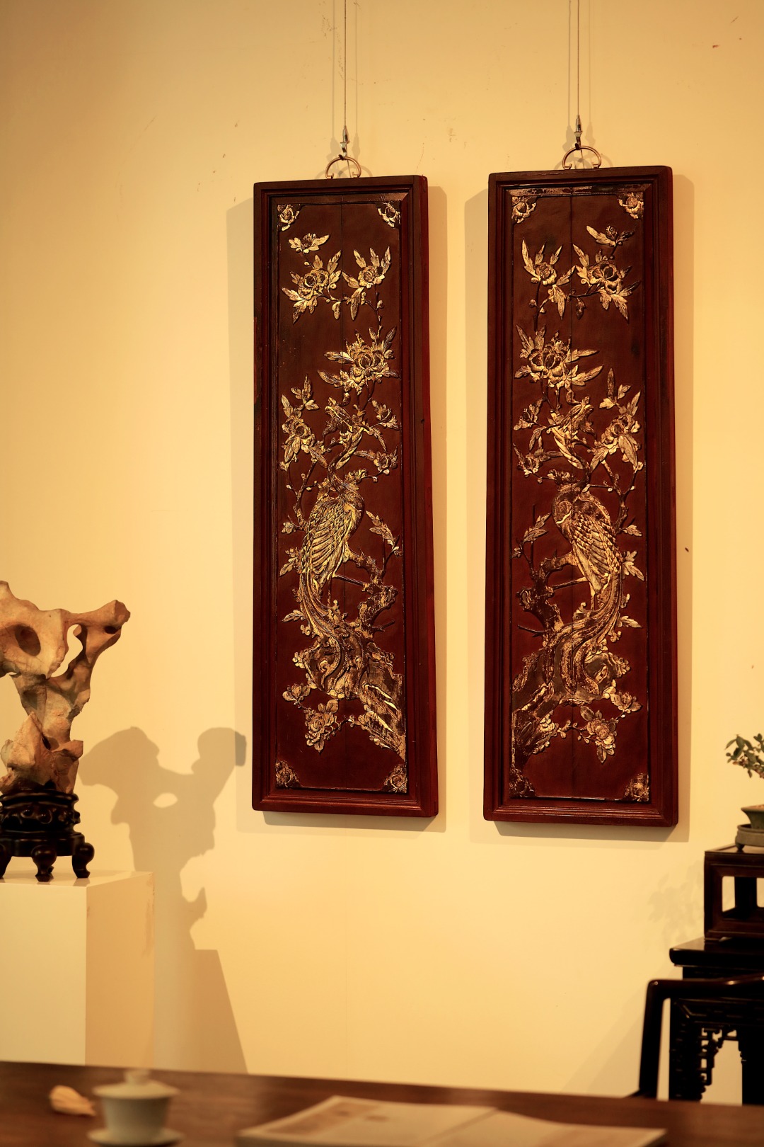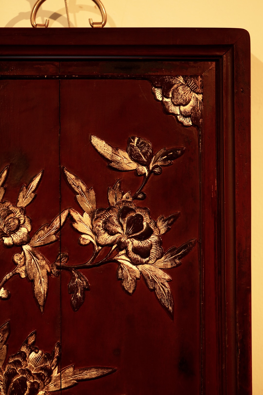 取材清代老老花板拆件,技法精湛,皮壳熟日古朴,朱红漆、浮雕鎏金工艺,图案优美不俗。悬于厅堂雅室,寓意富贵、繁荣,两者结合,象征着吉祥如意、富贵安康、荣华永驻。