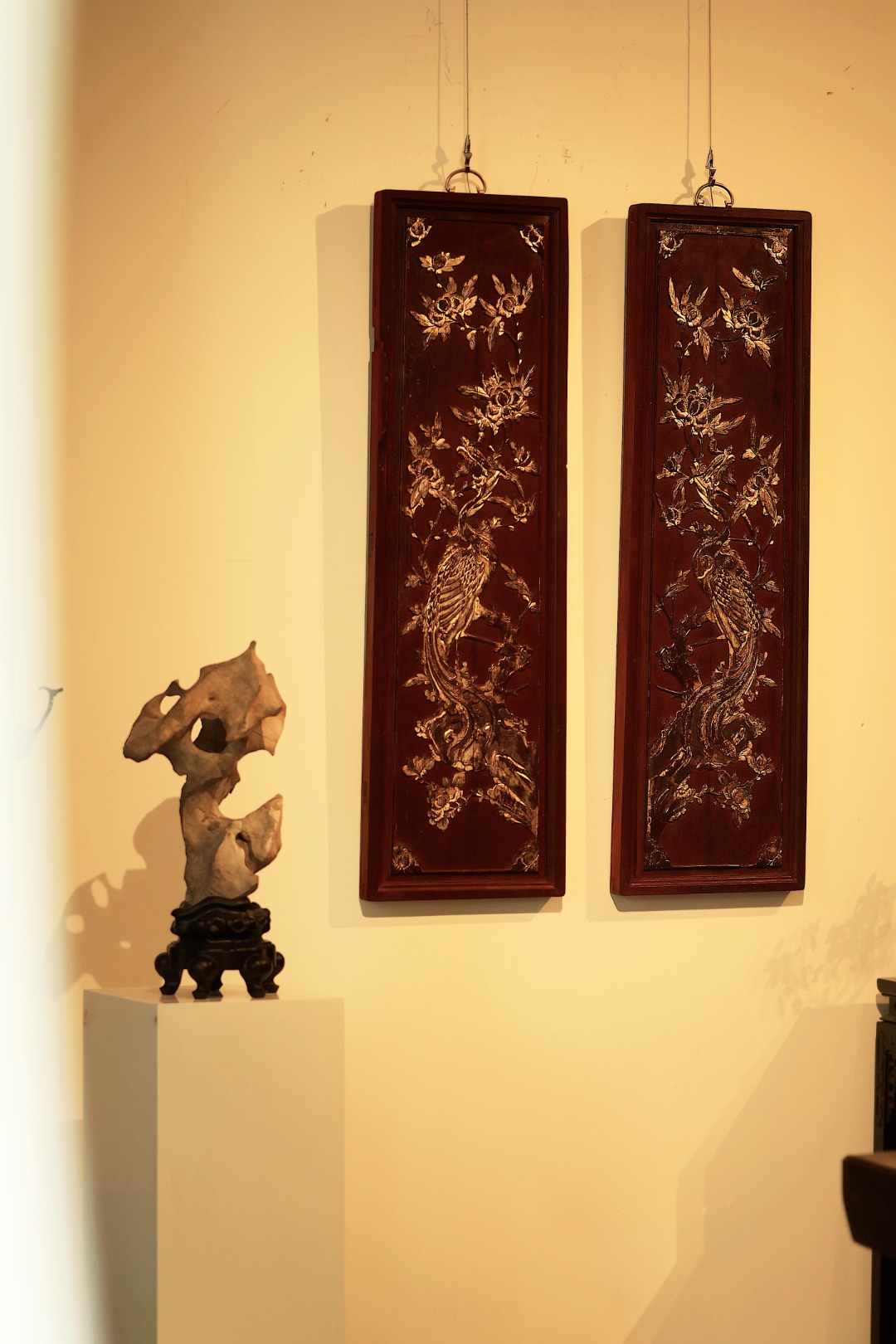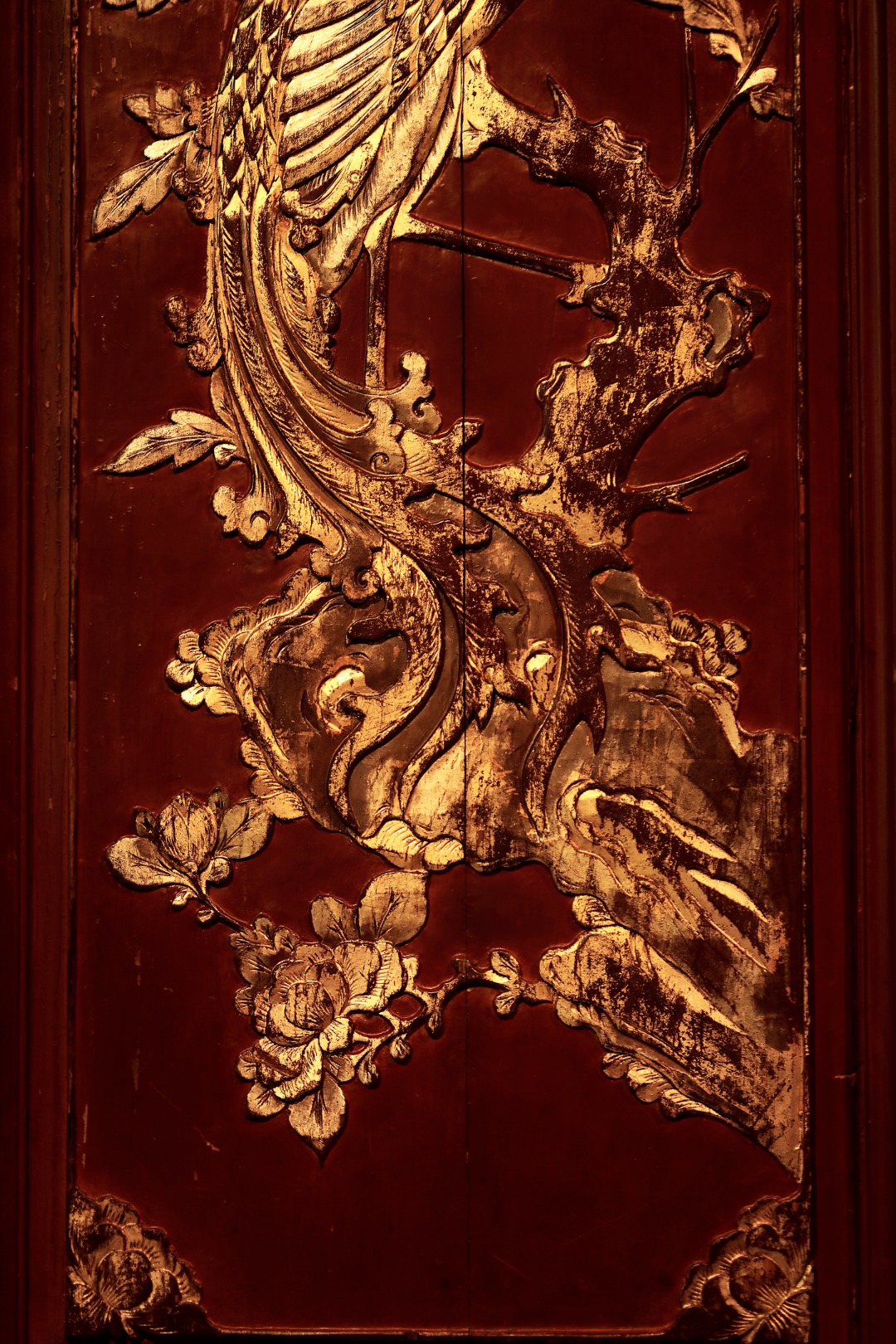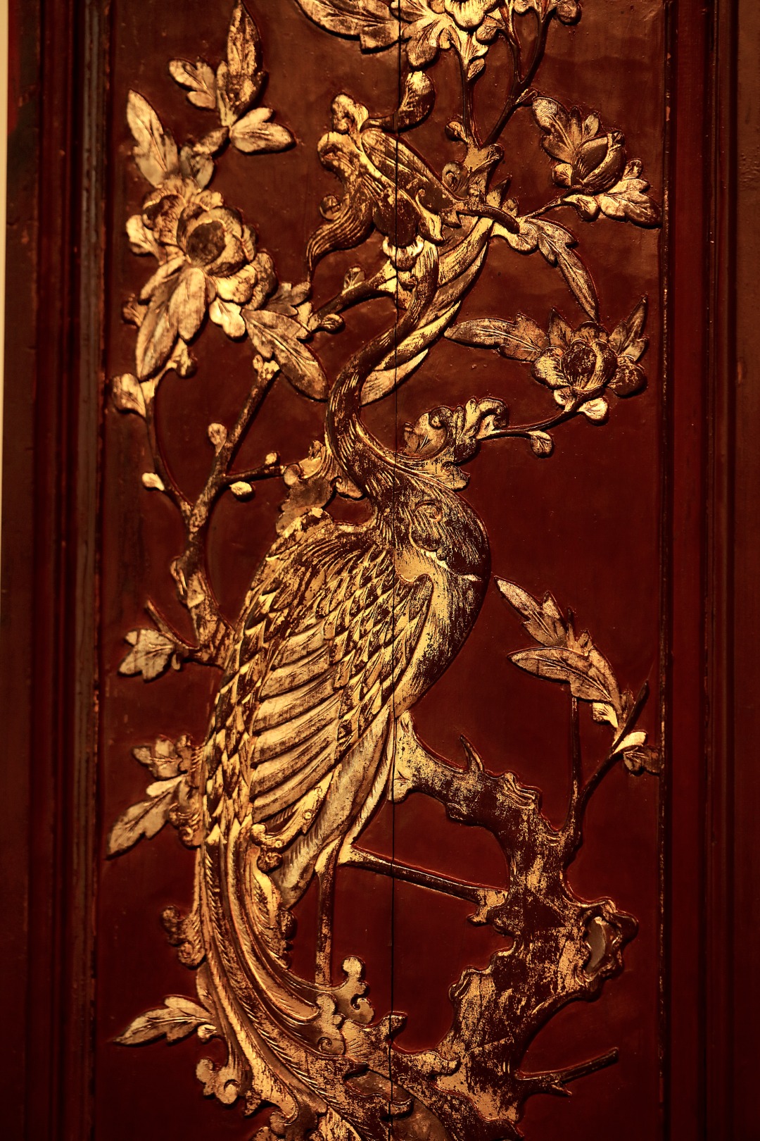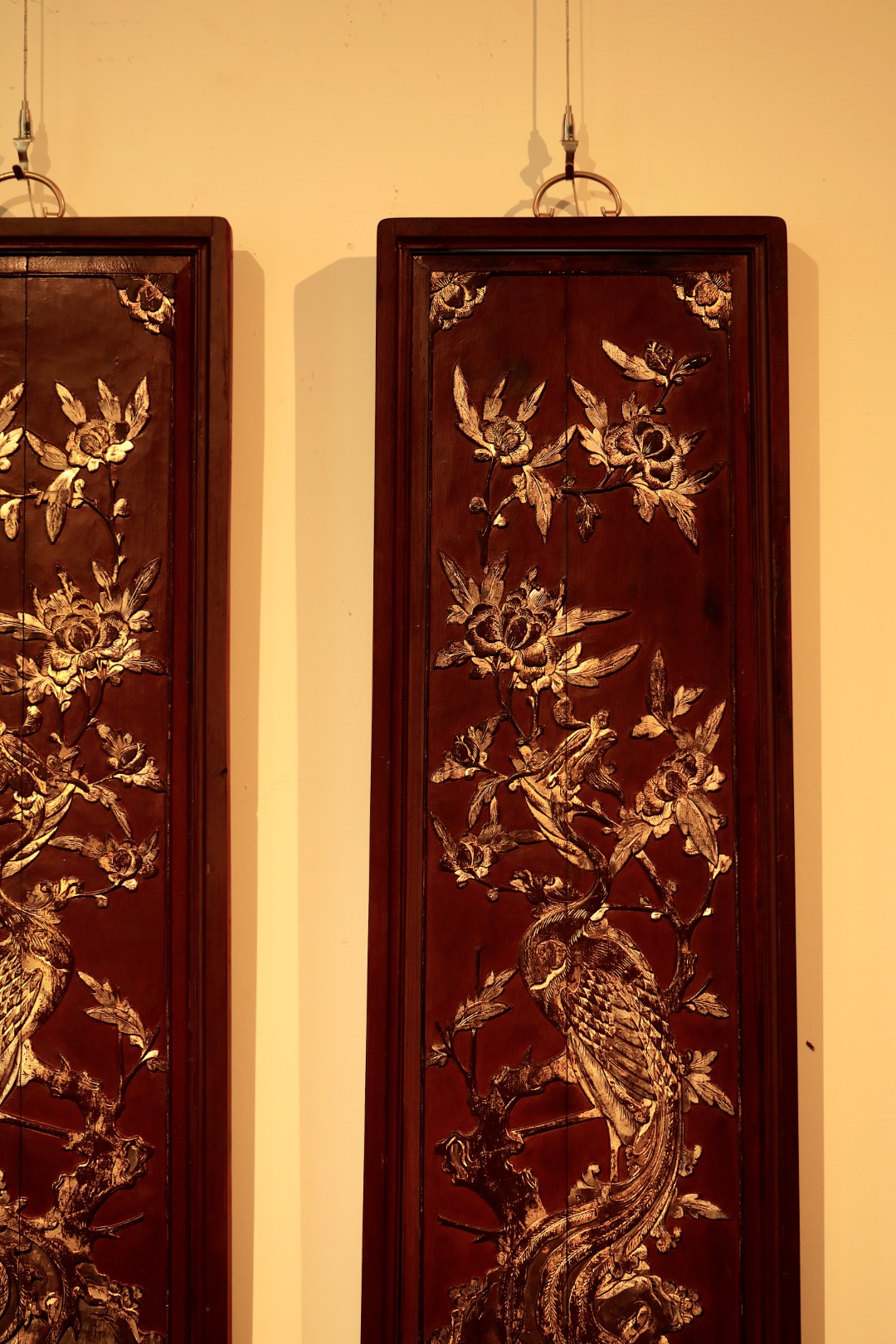 取材清代老老花板拆件,技法精湛,皮壳熟日古朴,朱红漆、浮雕鎏金工艺,图案优美不俗。悬于厅堂雅室,寓意富贵、繁荣,两者结合,象征着吉祥如意、富贵安康、荣华永驻。