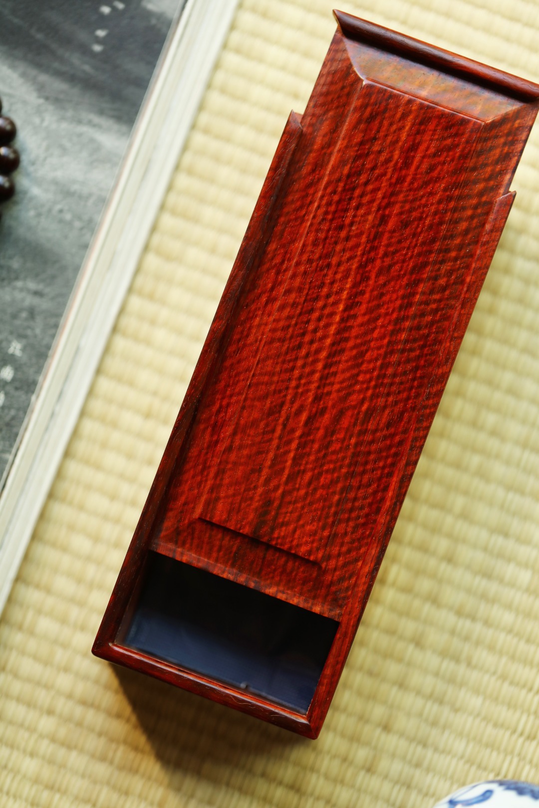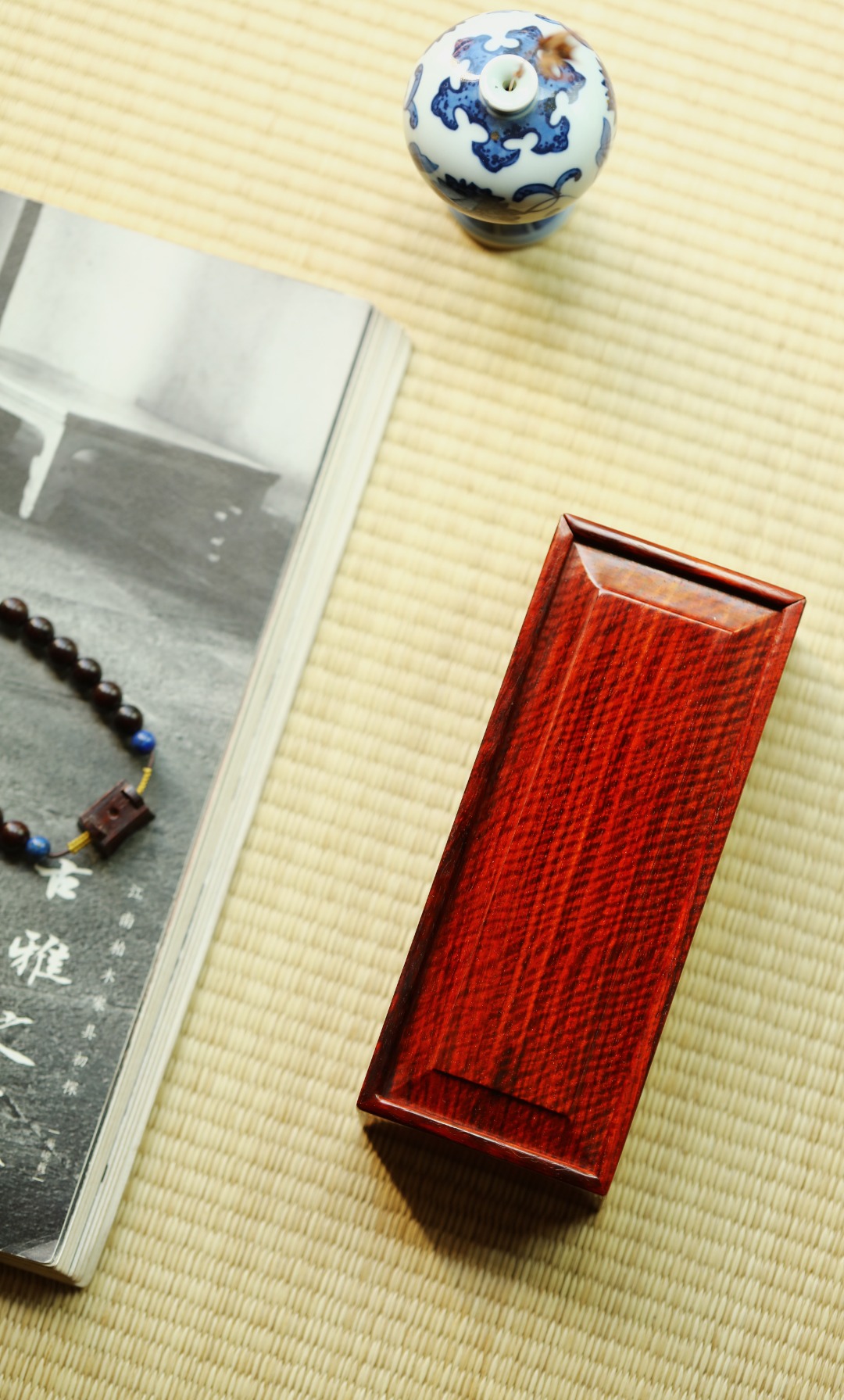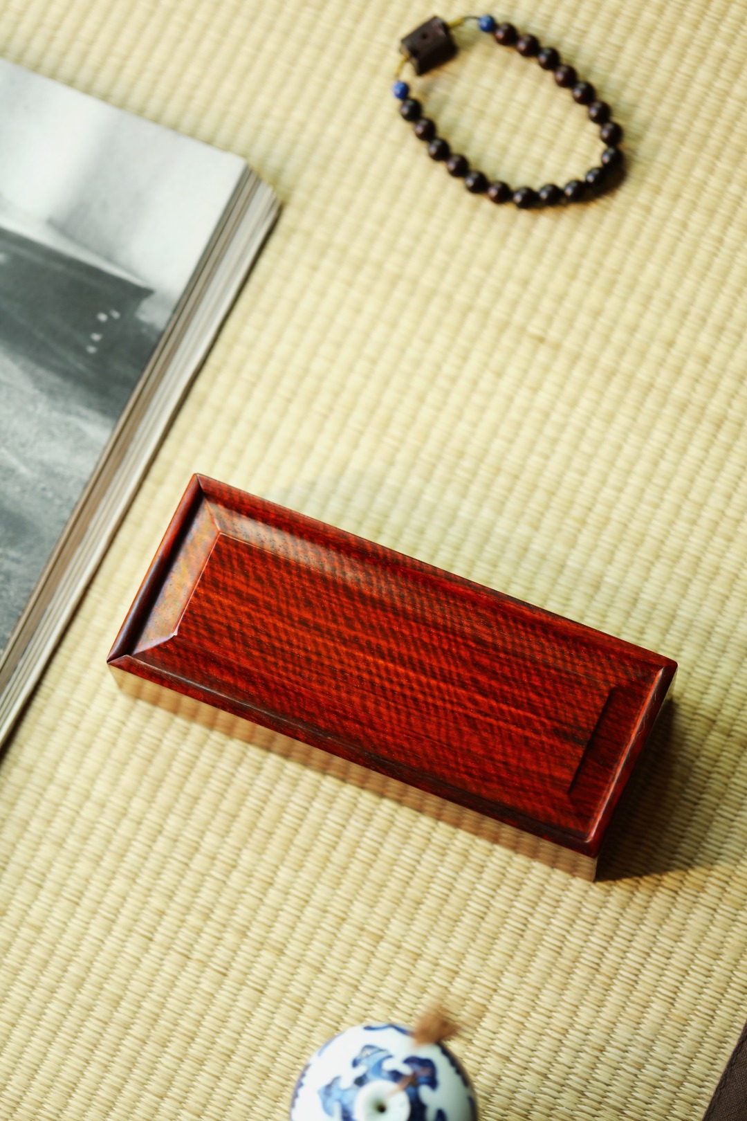 小叶紫檀全独板制,榫卯精工,珍稀水波纹理,行云流水,制型讲究。可做香盒,茶盒,储物之用。