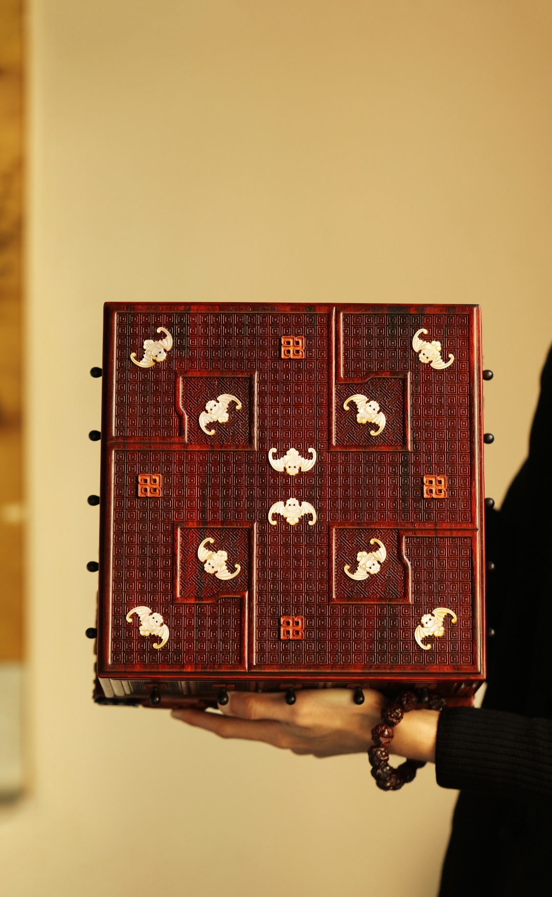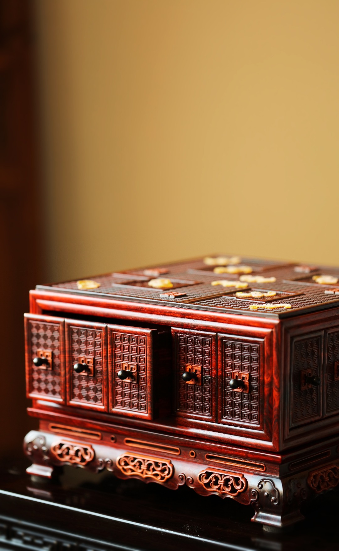 紫檀老料制器,四屉收纳,满雕不断回纹,盒面嵌螺钿作蝙蝠纹,寓万子有福。文房清供陈设博古,典雅大气!
