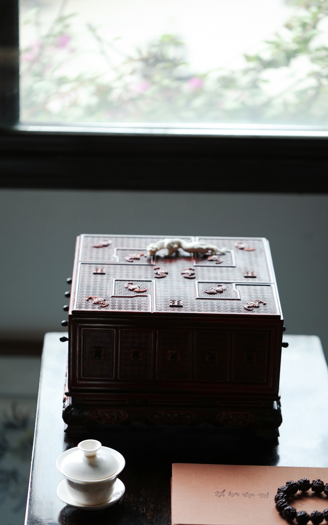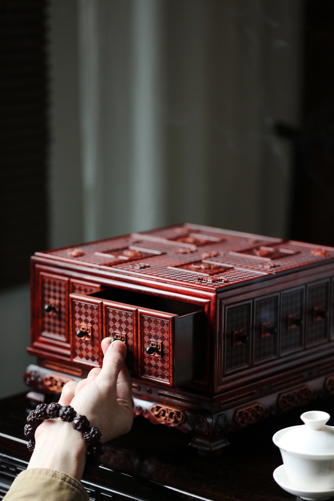 小叶紫檀制,四屉收纳,满雕不断回纹,镶嵌寿山石蝙蝠纹,寓万子有福。文房清供陈设博古,典雅大气!
