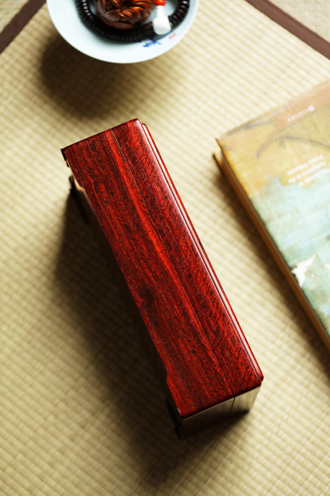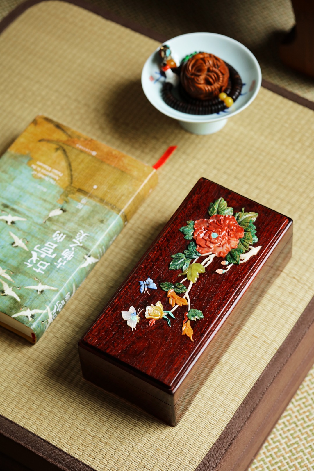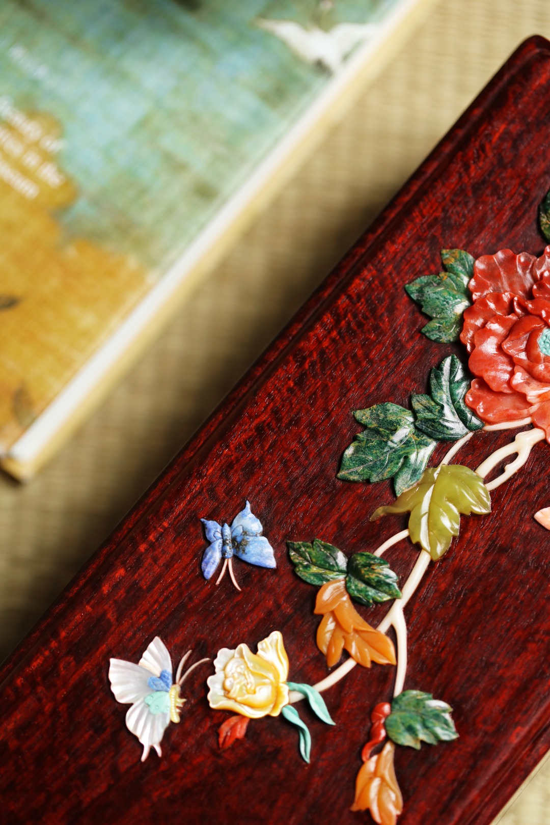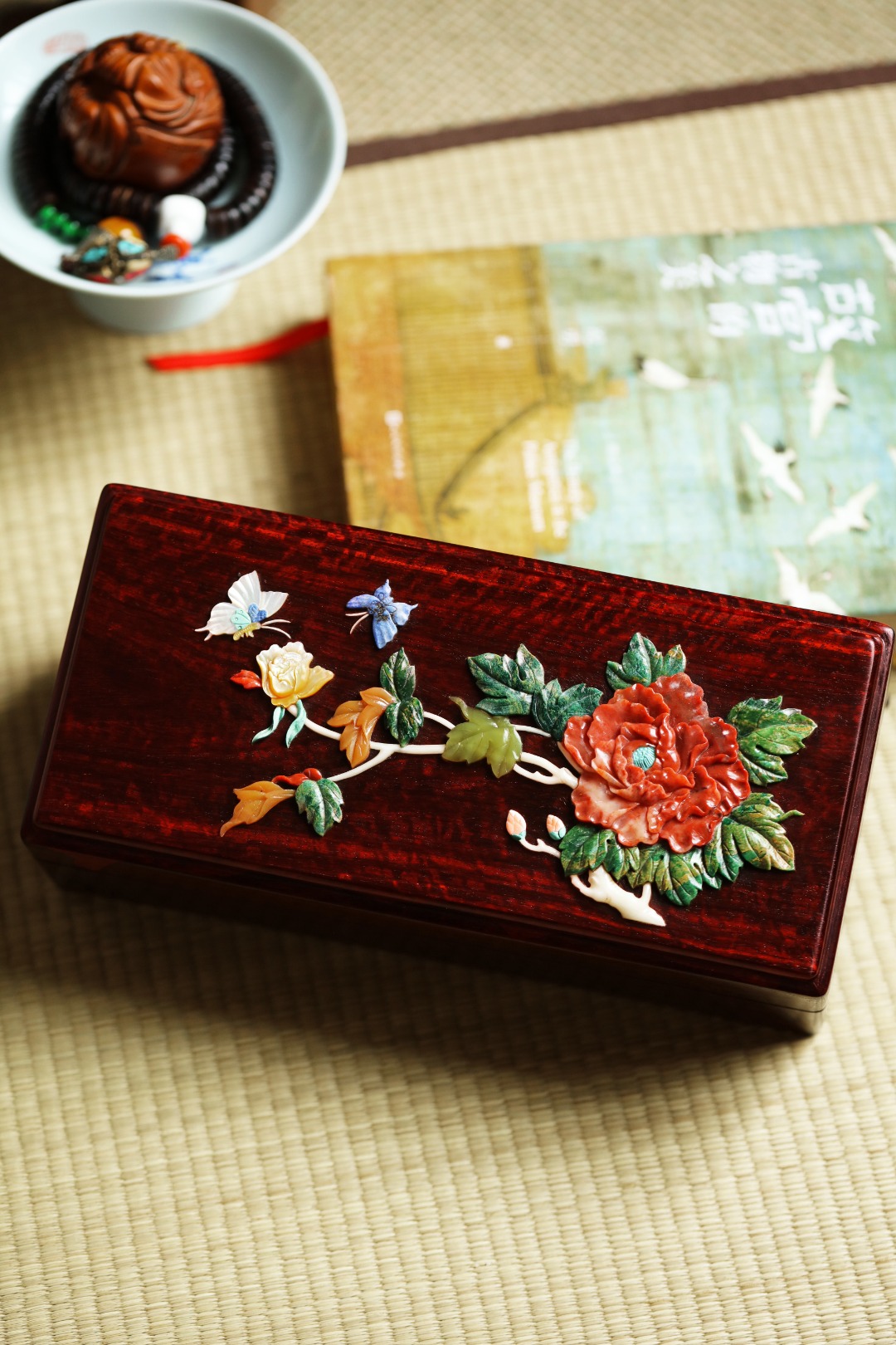 紫檀满水波老料,全独板制,榫卯结构。盒面百宝镶嵌牡丹彩蝶,整体精美华贵,收纳珍宝雅玩,赏心悦目!