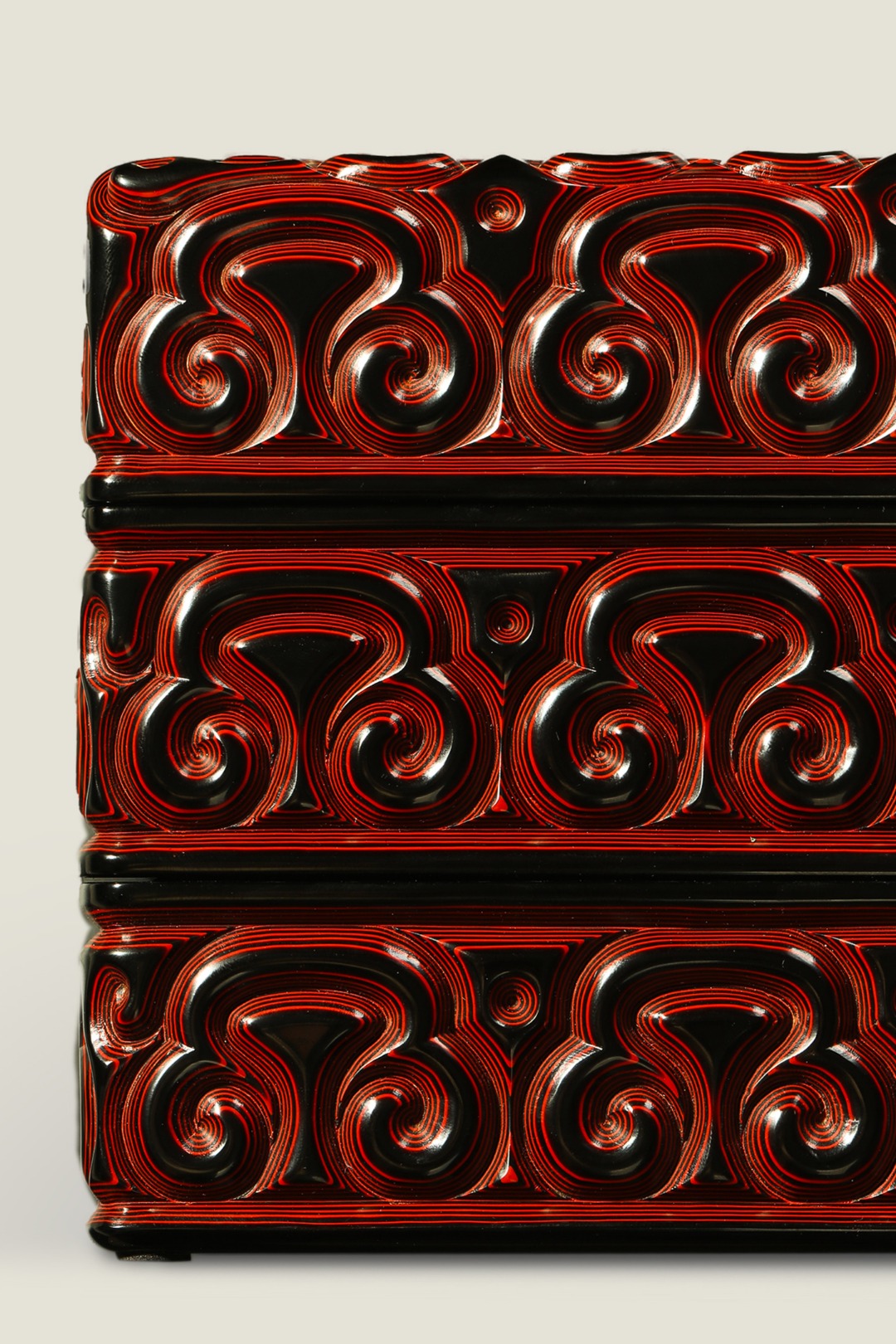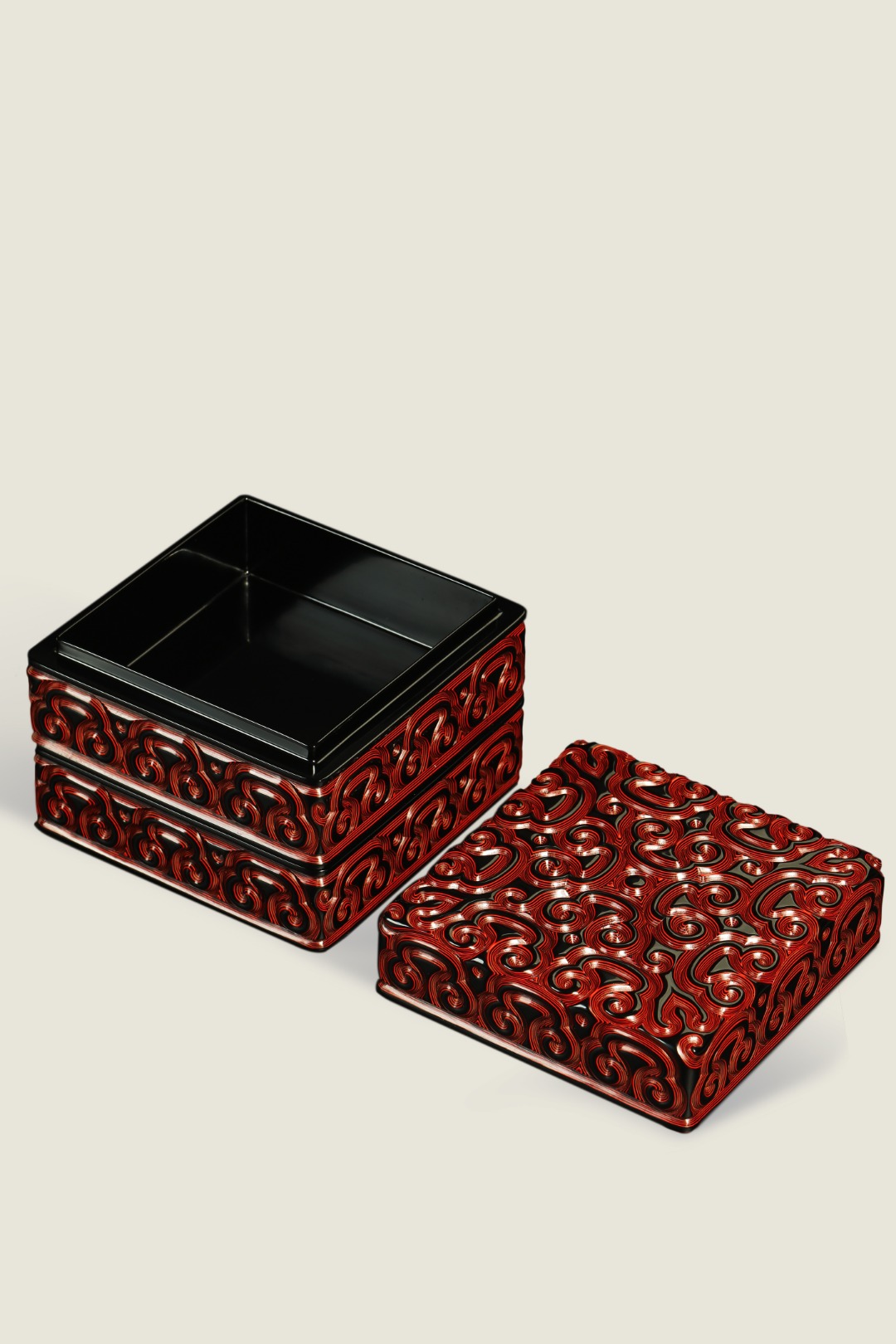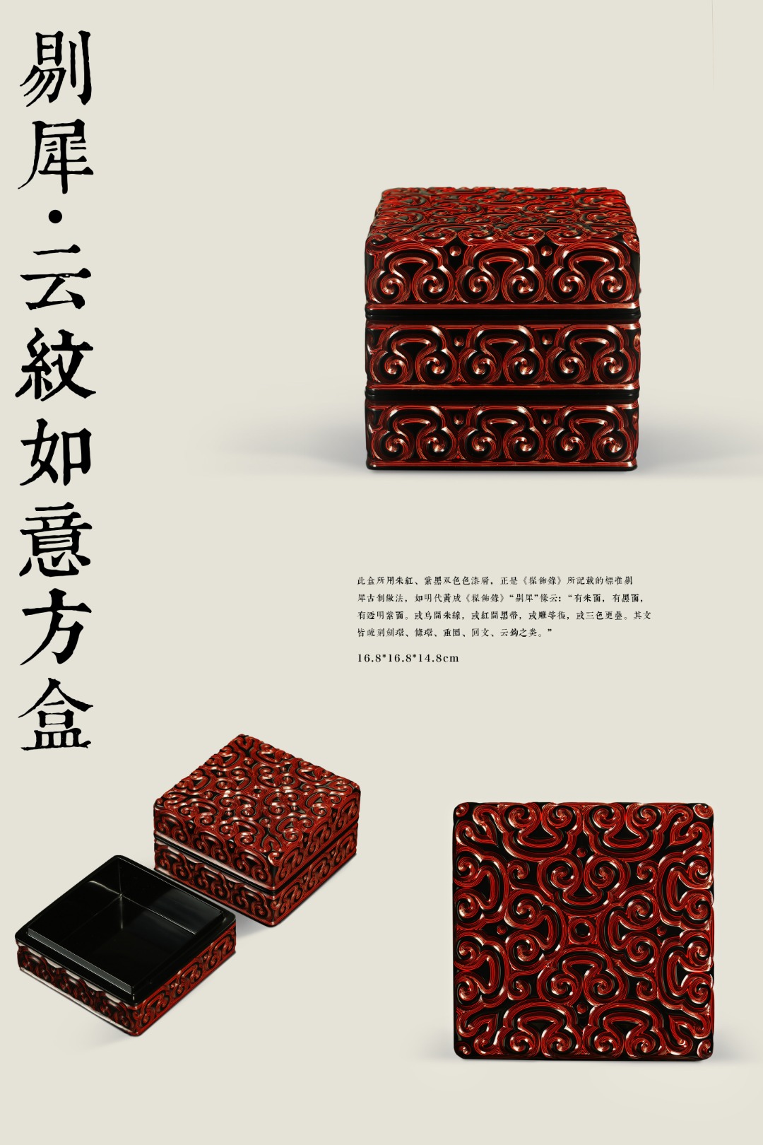 非遗手作,剔犀工艺复杂,工期漫长。层层漆纹大都以回旋生动、流转自如的云纹组成,又俗称“云雕”。主要分为制漆、制胎、灰胎、髹漆、绘图、剔刻、打磨、推光八大道工序,每道工序又可细分为若干小工序,历时数月之久。