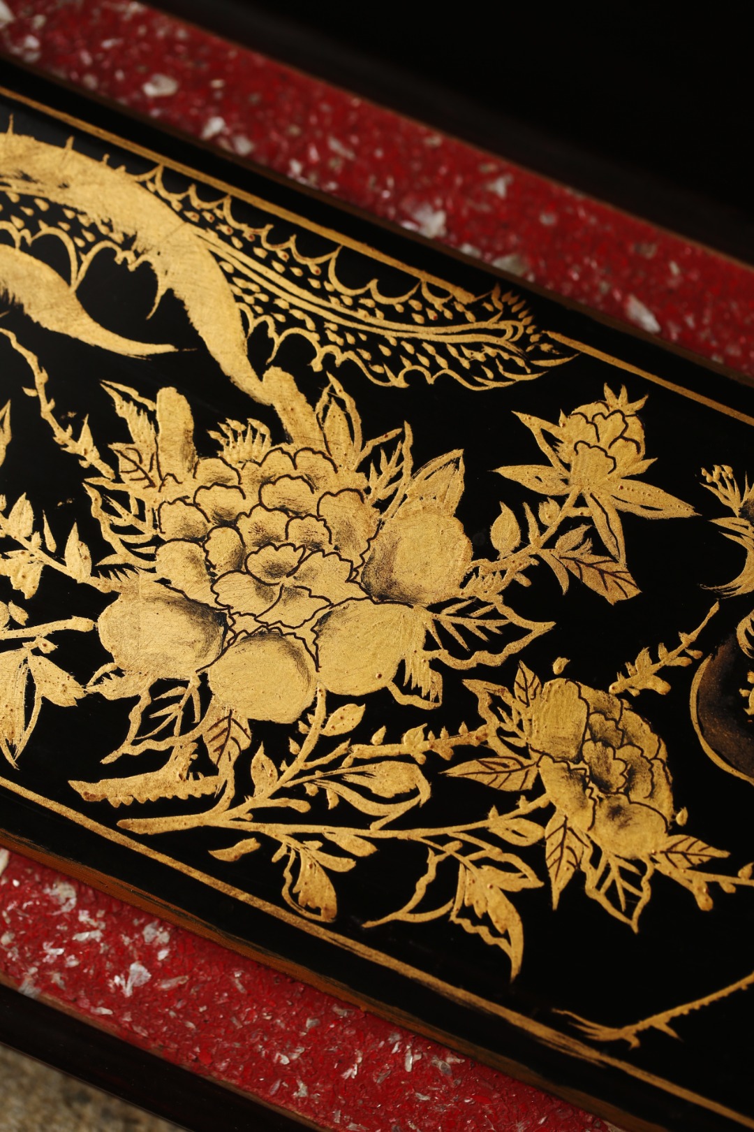 施以非遗传承描金工艺勾画,锦鸡牡丹纹