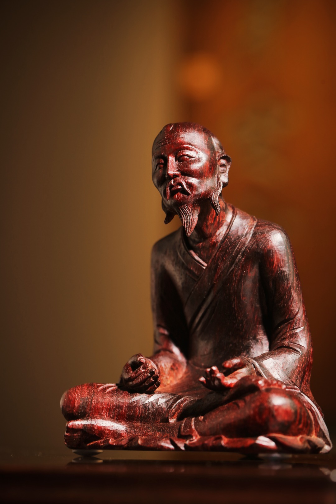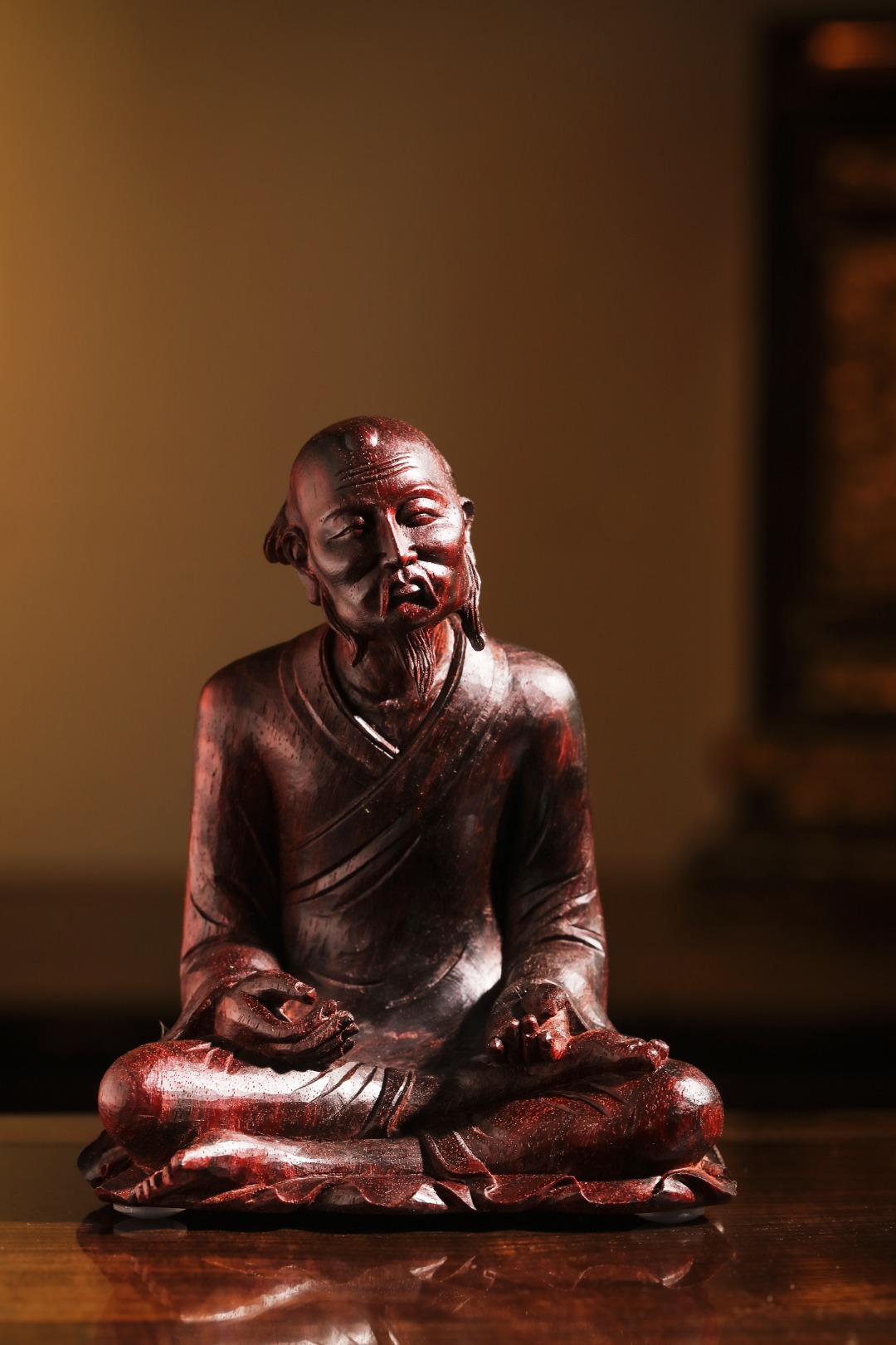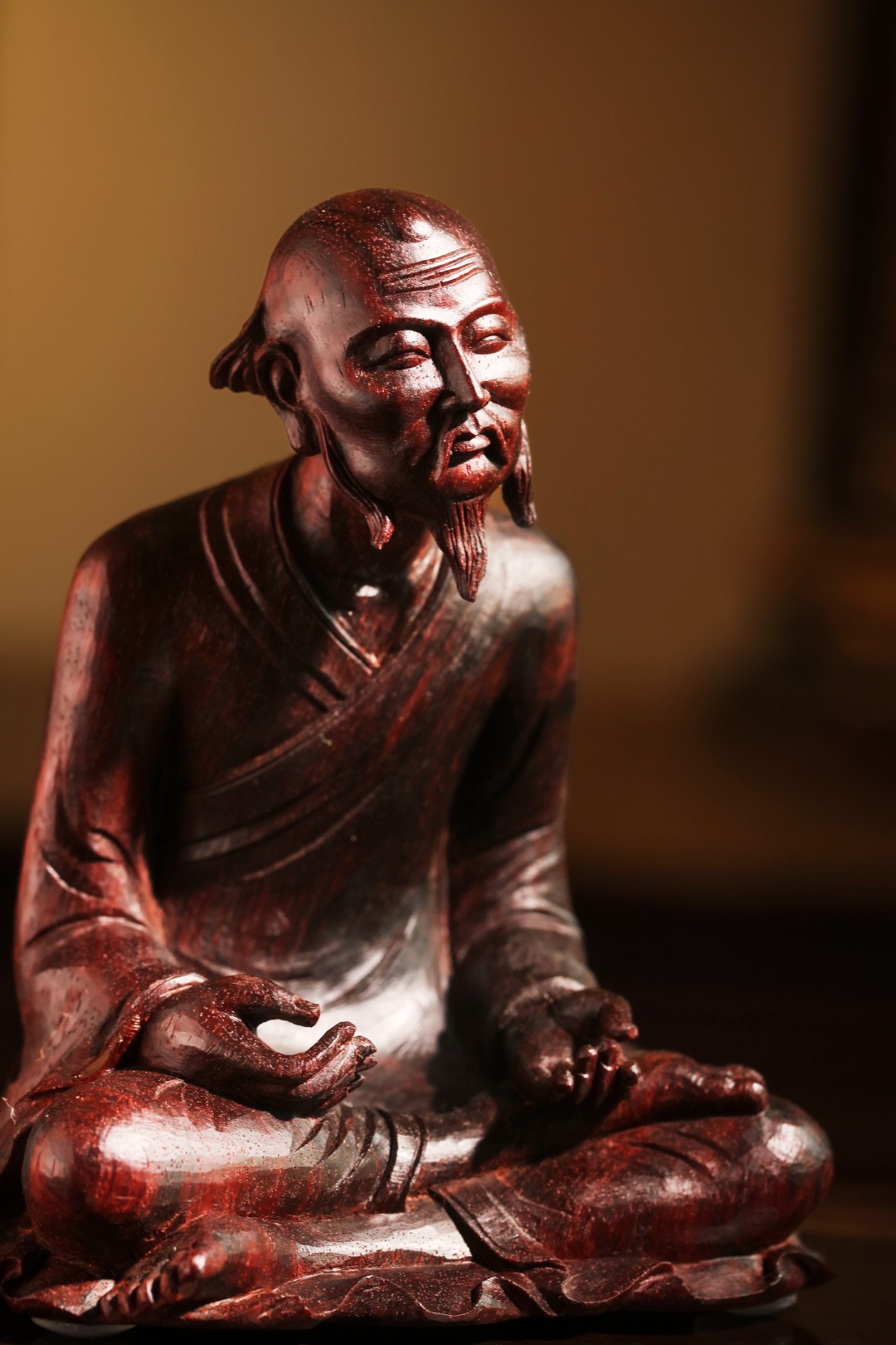 紫檀老料一木手工雕刻,达摩·禅宗呈盘腿坐姿,神态祥和,气貌如生。其禅法以“二入四行”为中心,强调“心”的清净。坚韧不拔的修行精神、直指人心见性成佛的禅法理。