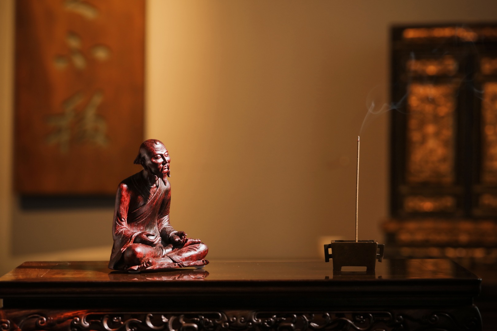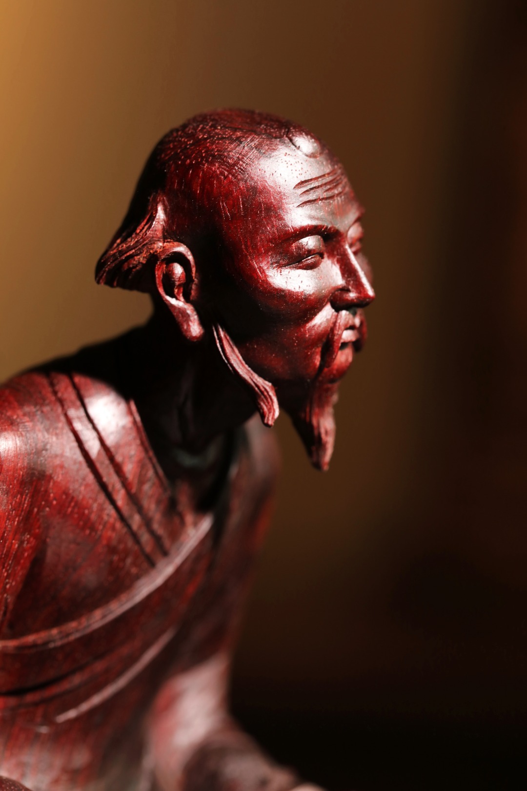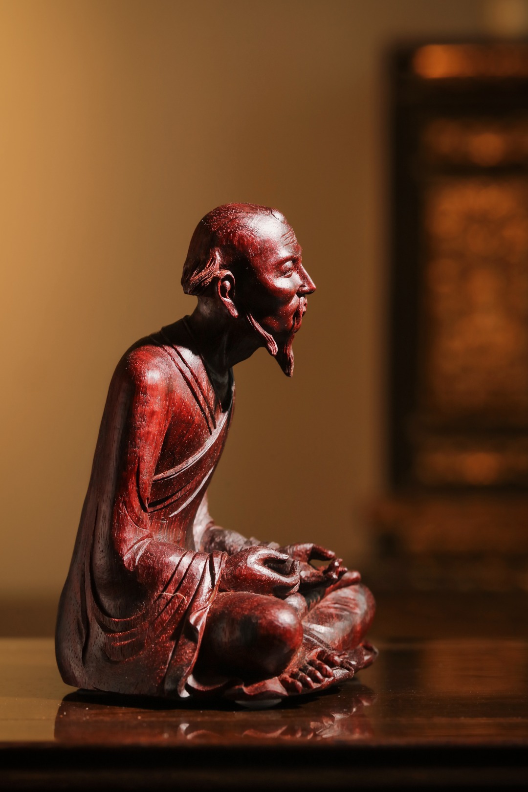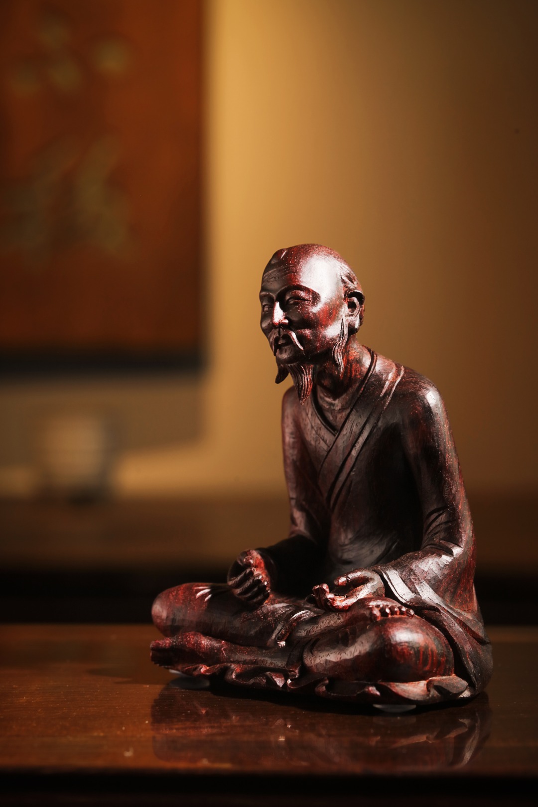 紫檀老料一木手工雕刻,达摩·禅宗呈盘腿坐姿,神态祥和,气貌如生。其禅法以“二入四行”为中心,强调“心”的清净。坚韧不拔的修行精神、直指人心见性成佛的禅法理。