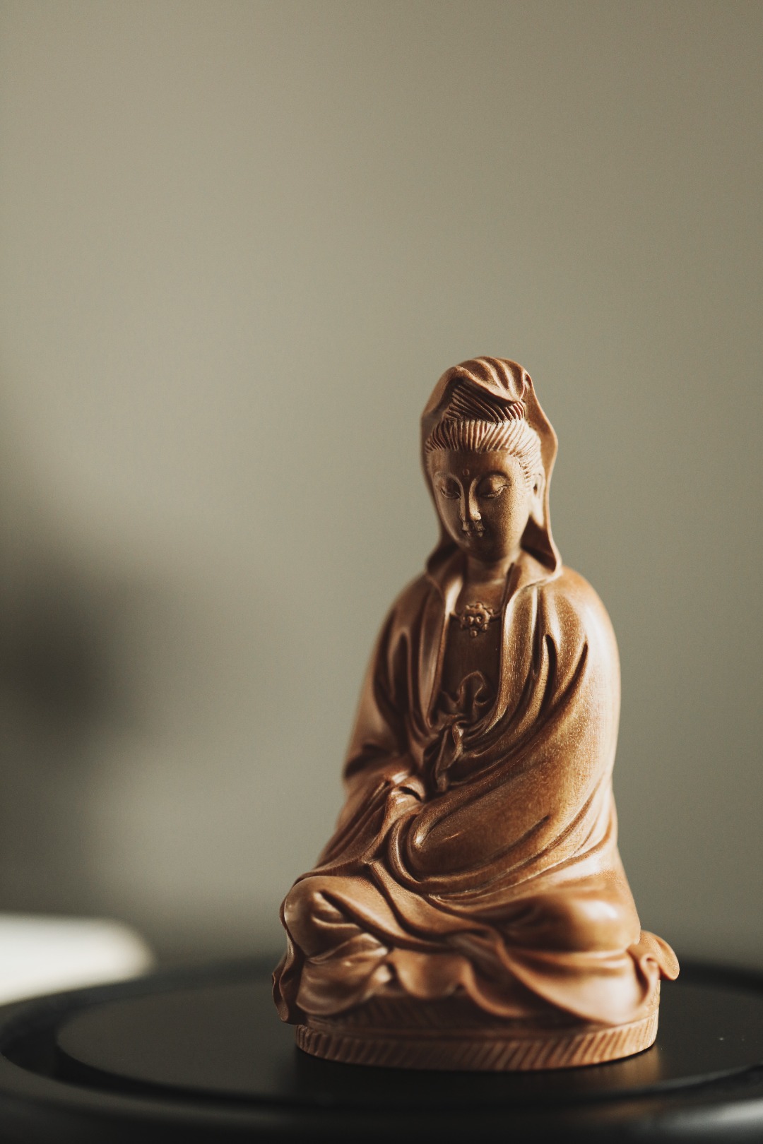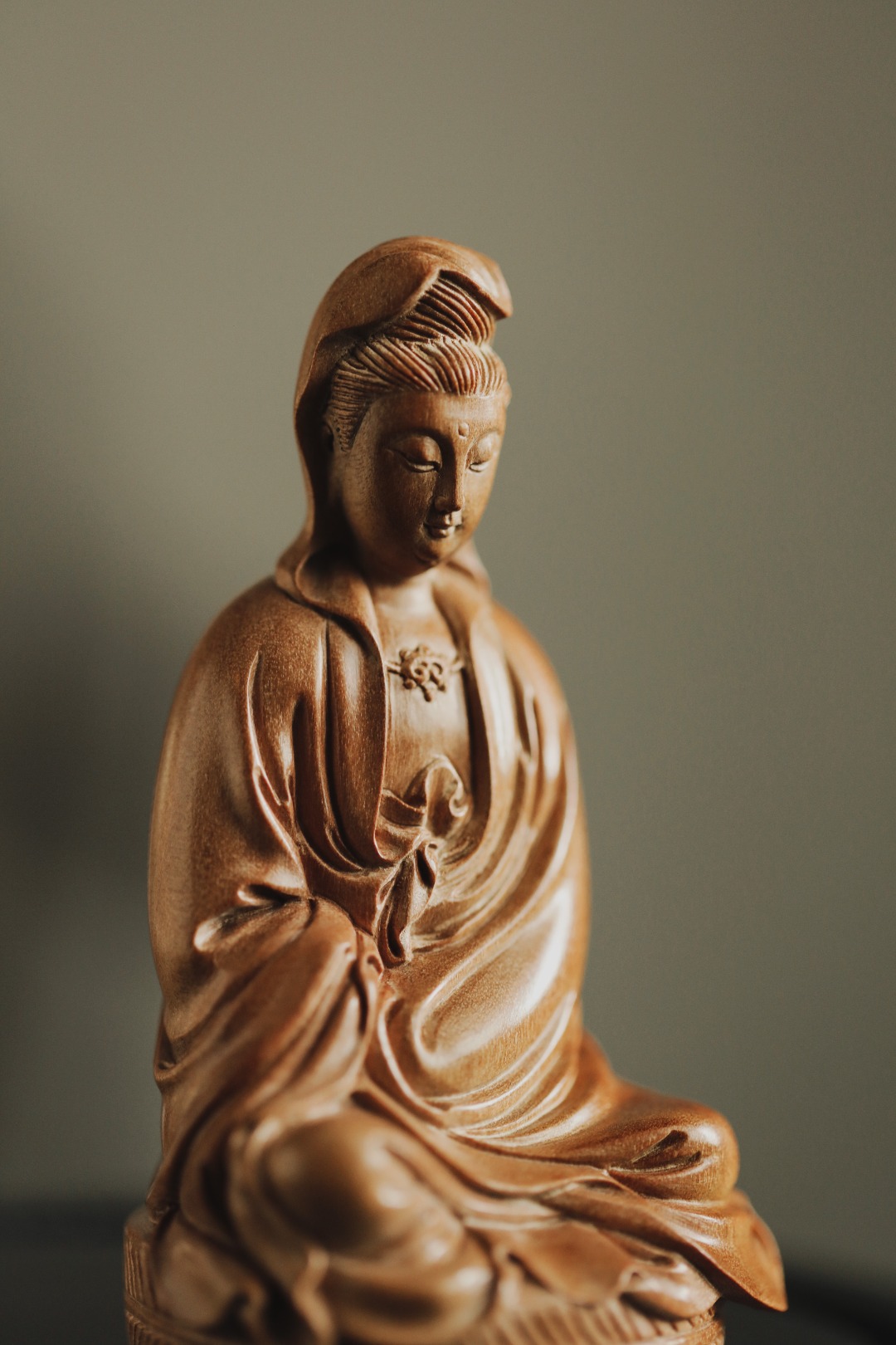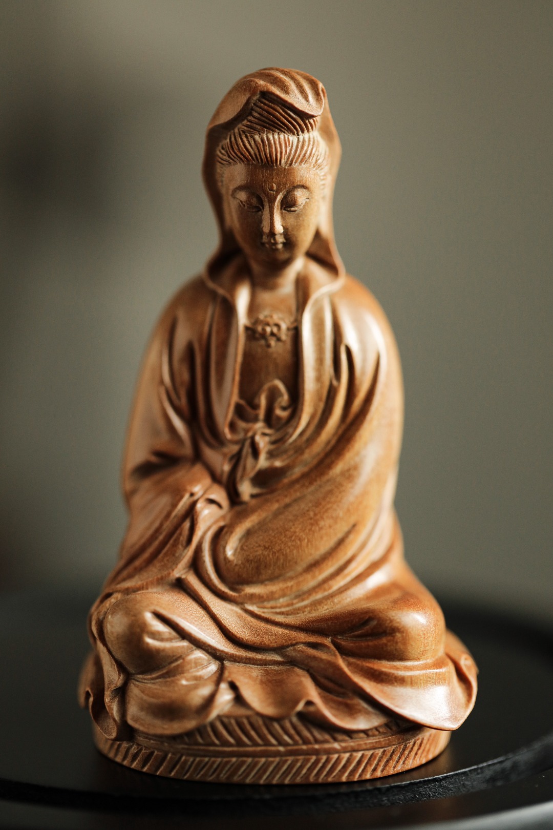 择取老料,油足香馥,雕工细致微妙,形神兼备。观音神情自在恬然,有似天成,心上无事,一切如意。
