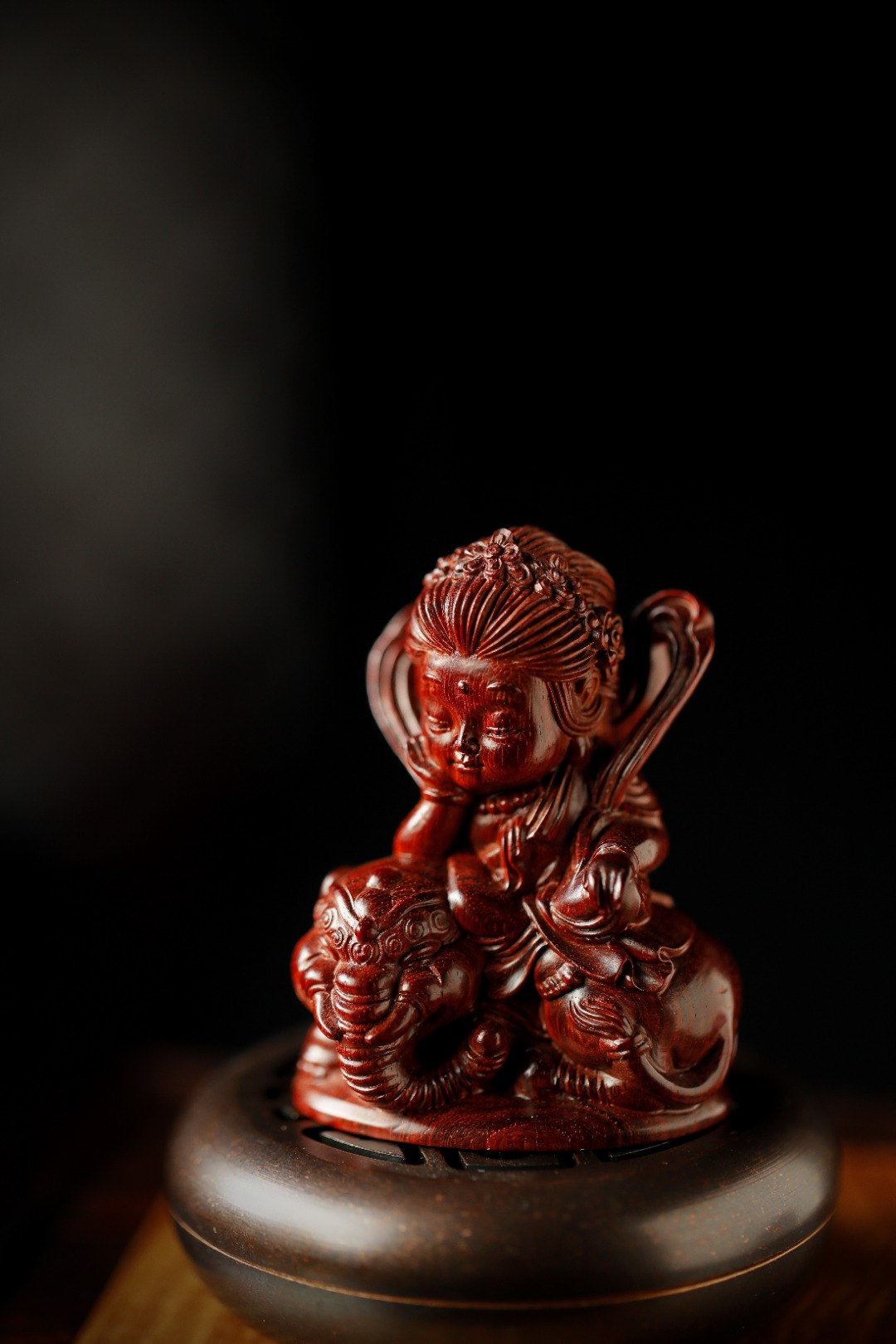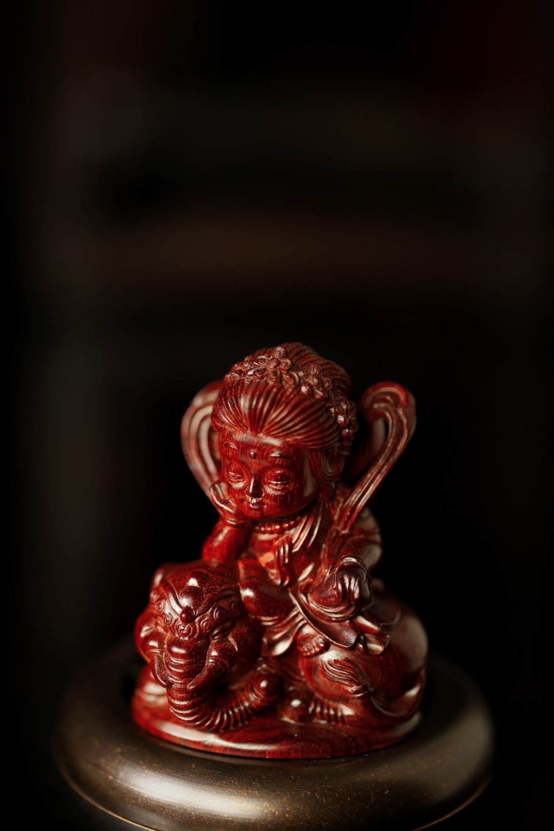 单腿盘膝端坐于白象坐骑上,