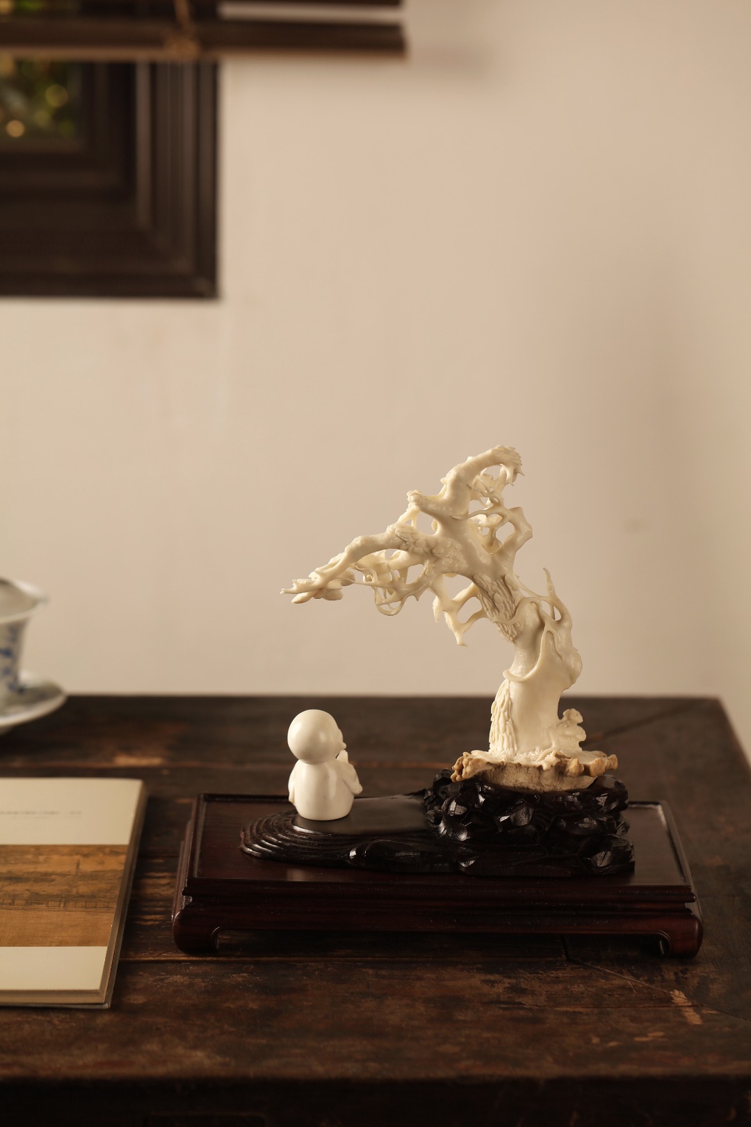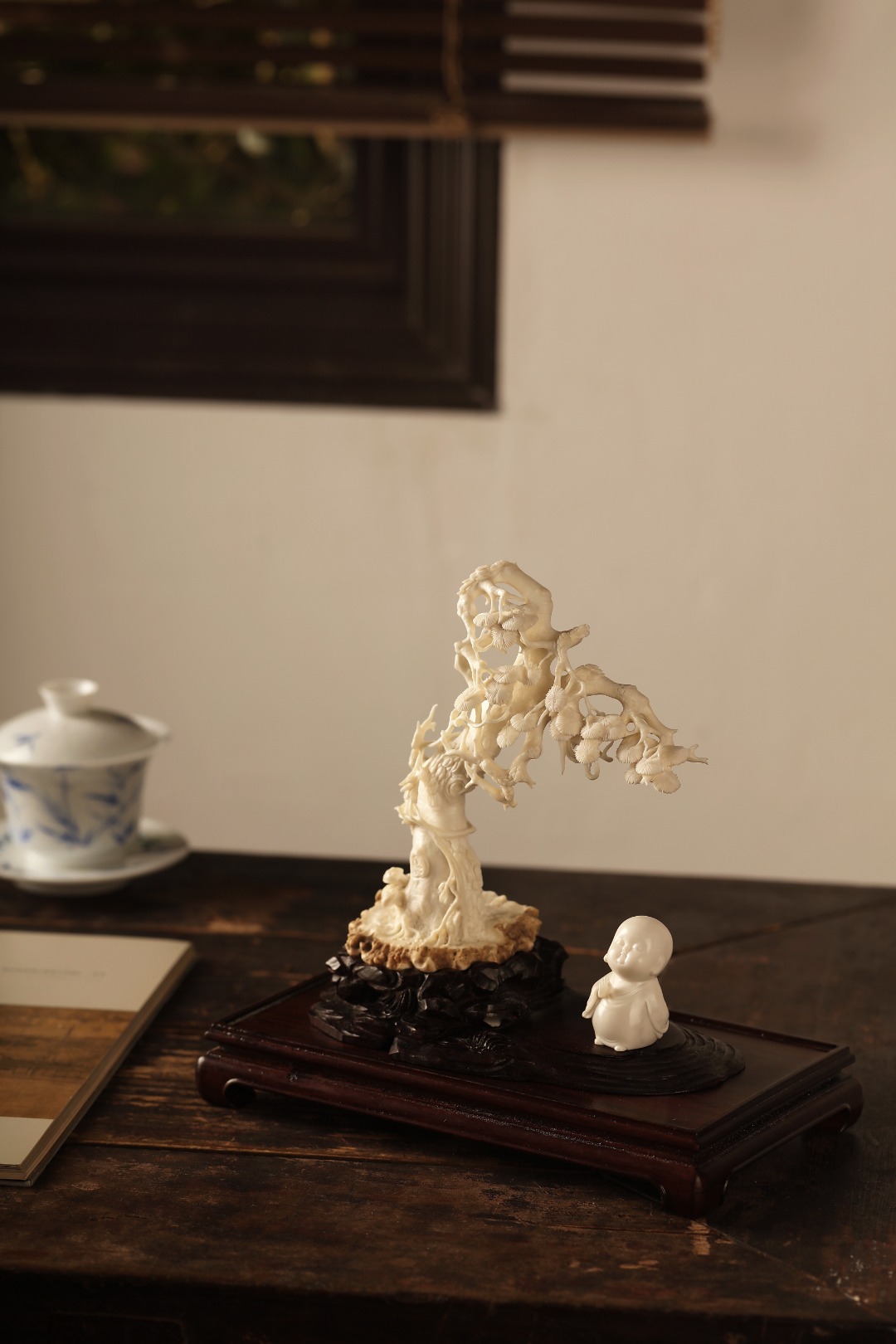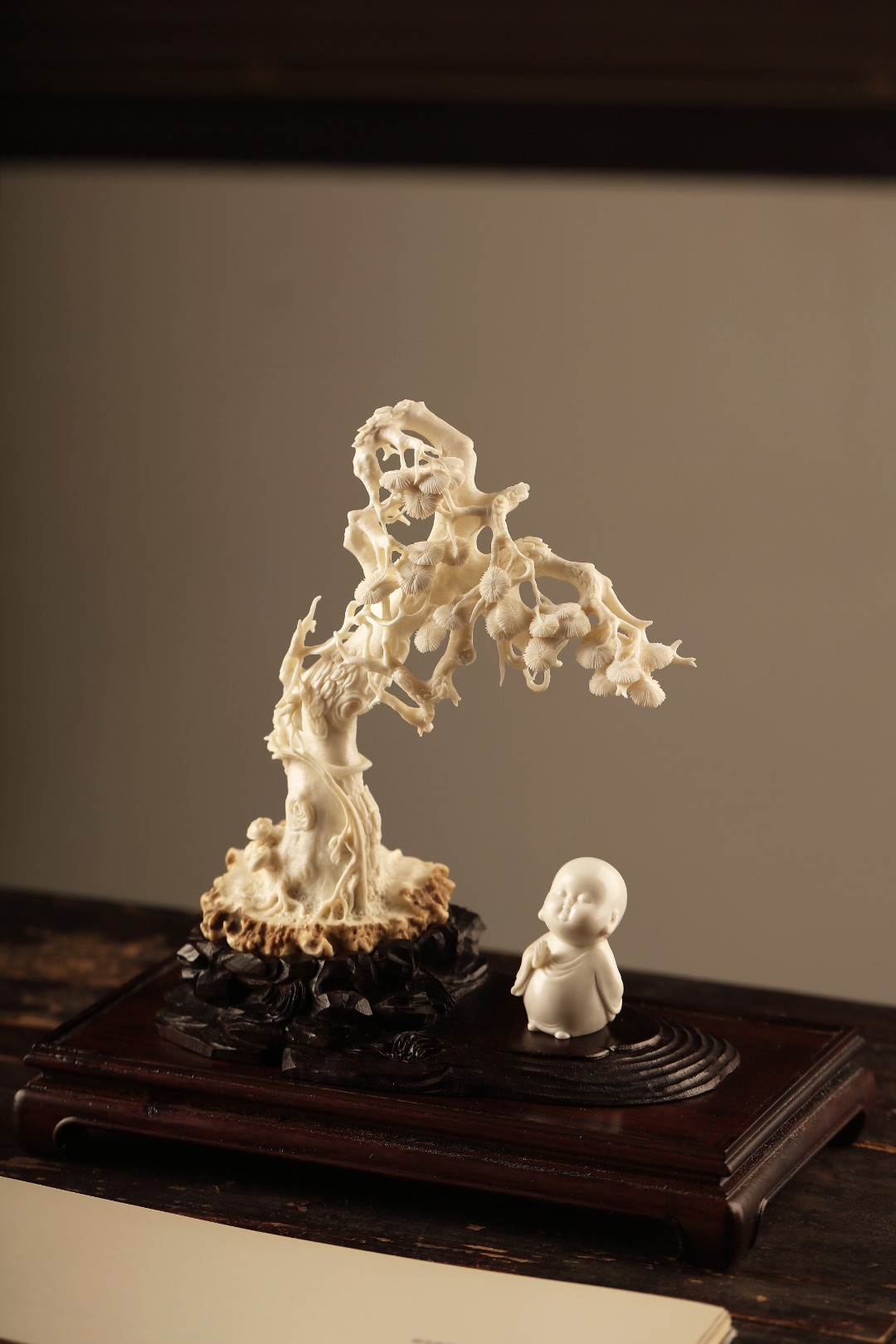 整料雕成,刀法气贯,出若天成松针郁郁葱葱,小和尚安态冥思,清雅非常。入雅室案头,自成清景。