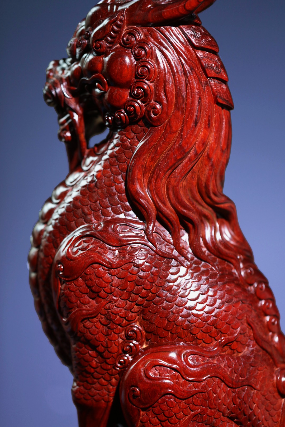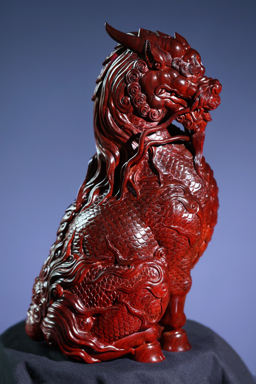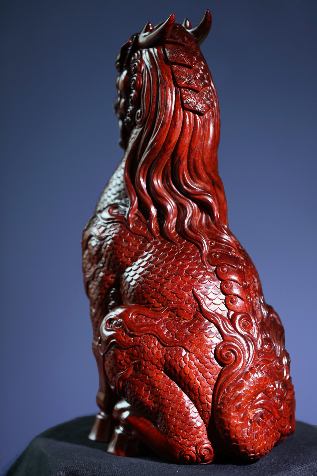 取材紫檀大口径老料,一木清刀雕成,刀法细致,密鳞层层,须毫舒卷逸动,麒麟蹲坐望远,神采奕奕;家有麒麟,招财纳福,贵气祥和,收藏精品!