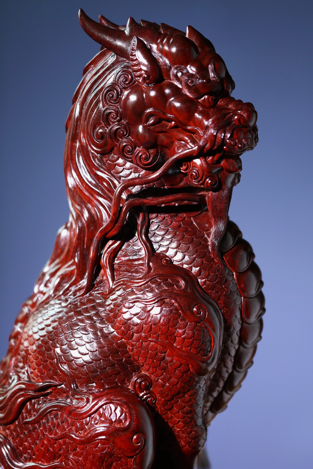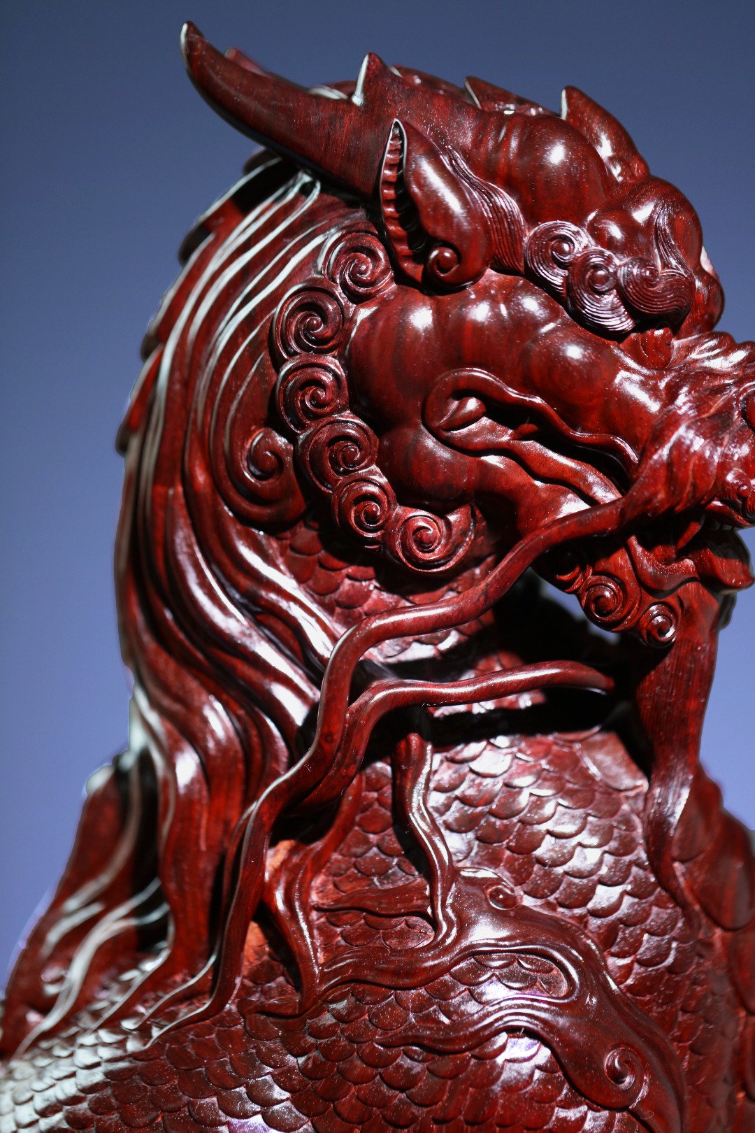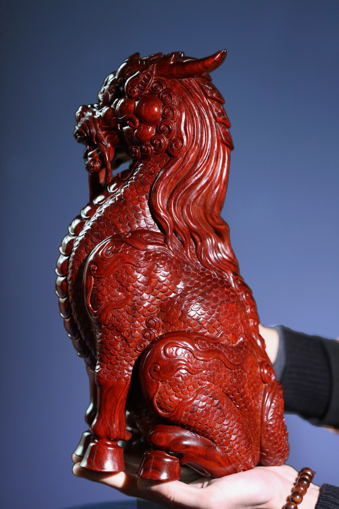 取材紫檀大口径老料,一木清刀雕成,刀法细致,密鳞层层,须毫舒卷逸动,麒麟蹲坐望远,神采奕奕;家有麒麟,招财纳福,贵气祥和,收藏精品!