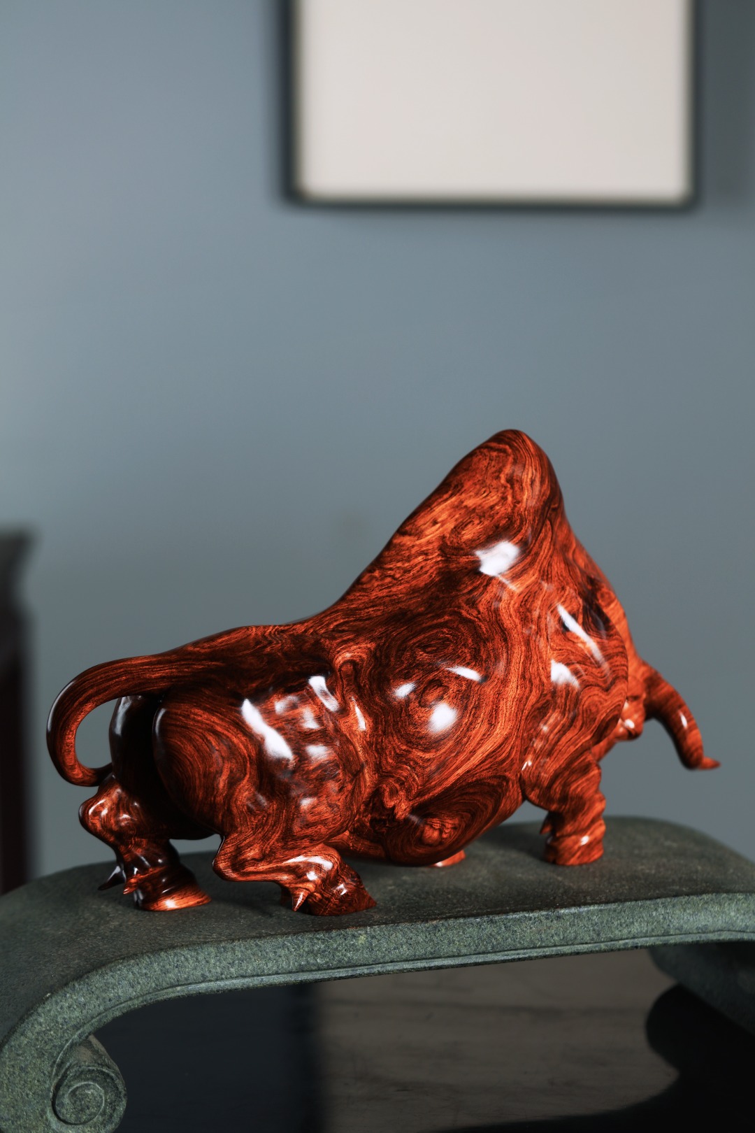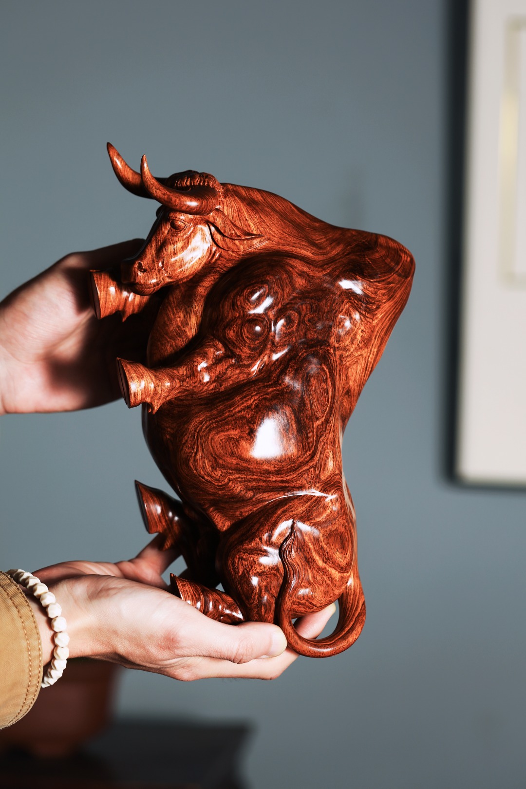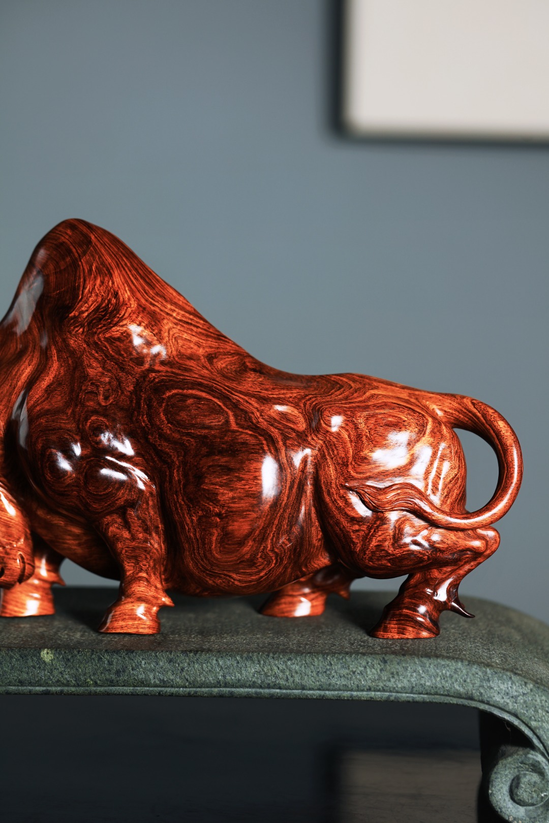 择取油梨老料,材质温润细腻,纹理清晰张扬,循其木性雕刻,瑞牛形髓具备,力劲出透,可谓神盈气足。陈置摆放,有牛转乾坤、大获丰收之意。
