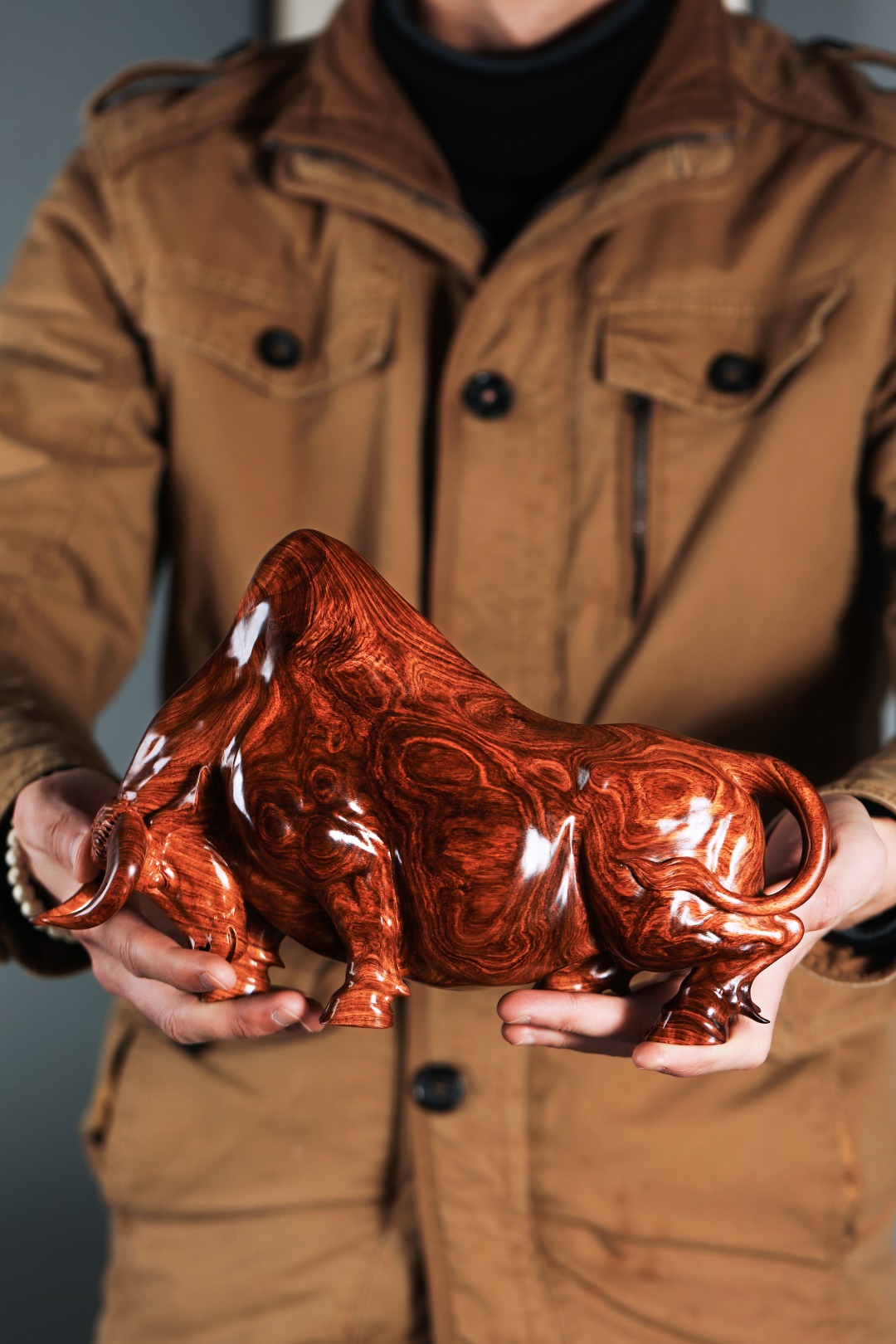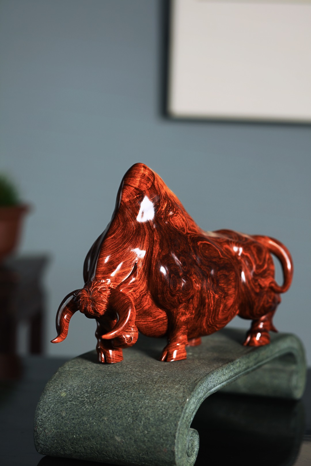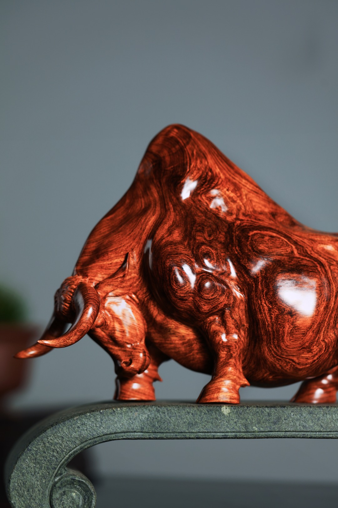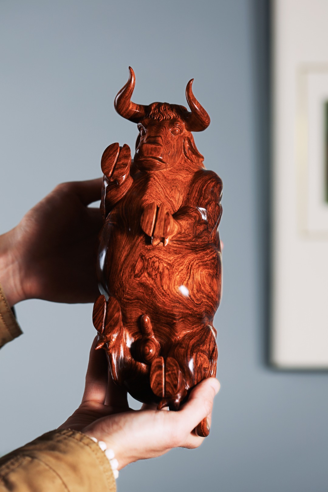 择取油梨老料,材质温润细腻,纹理清晰张扬,循其木性雕刻,瑞牛形髓具备,力劲出透,可谓神盈气足。陈置摆放,有牛转乾坤、大获丰收之意。