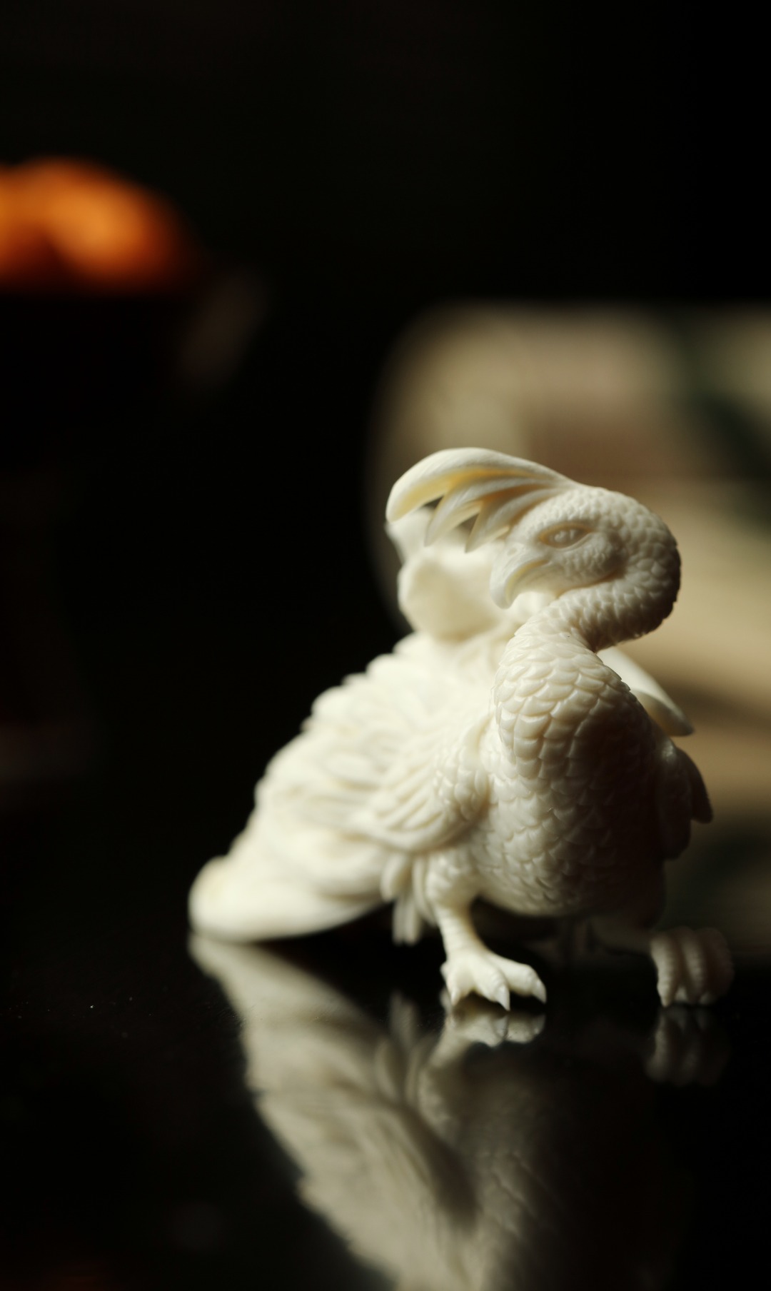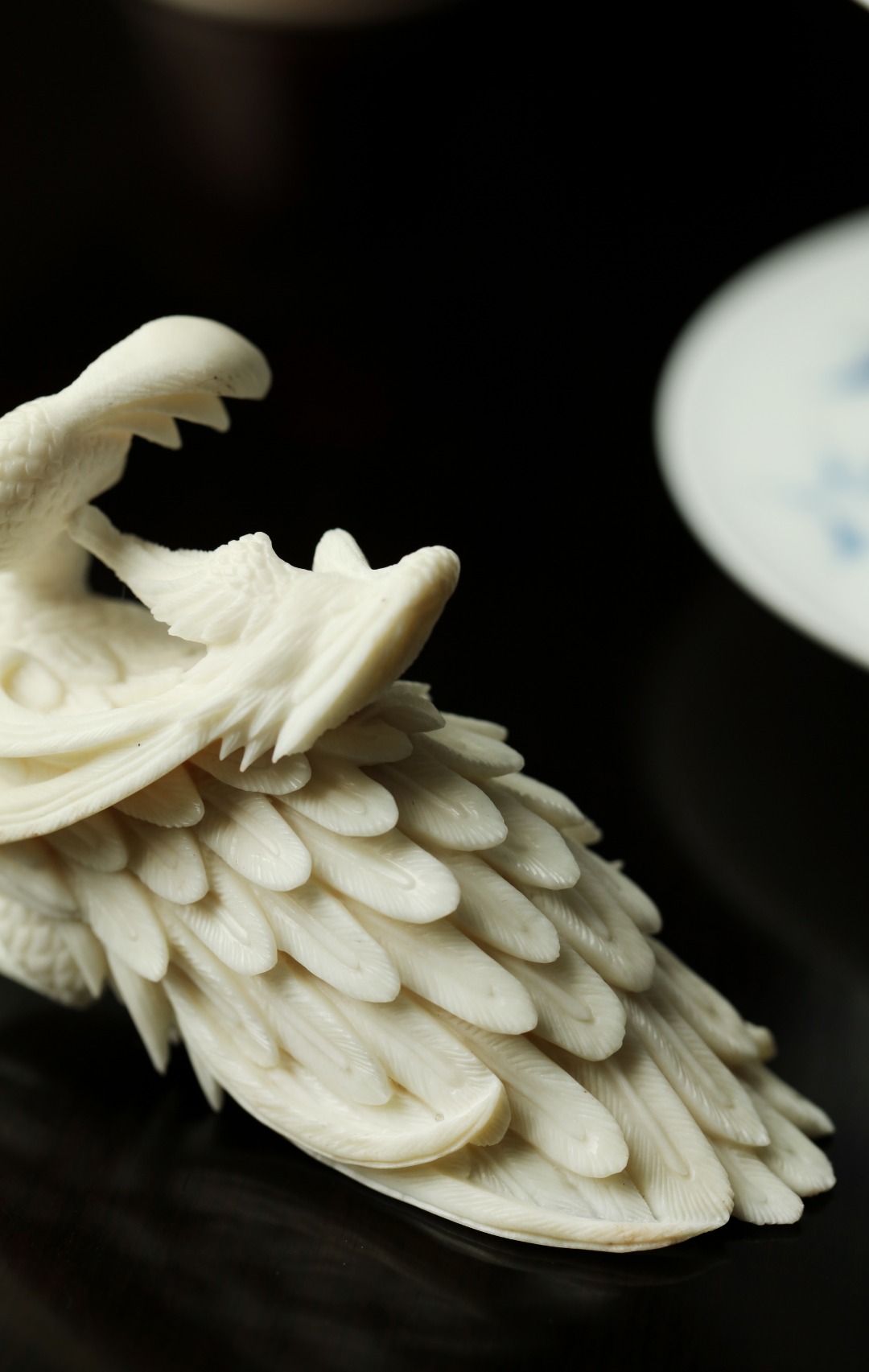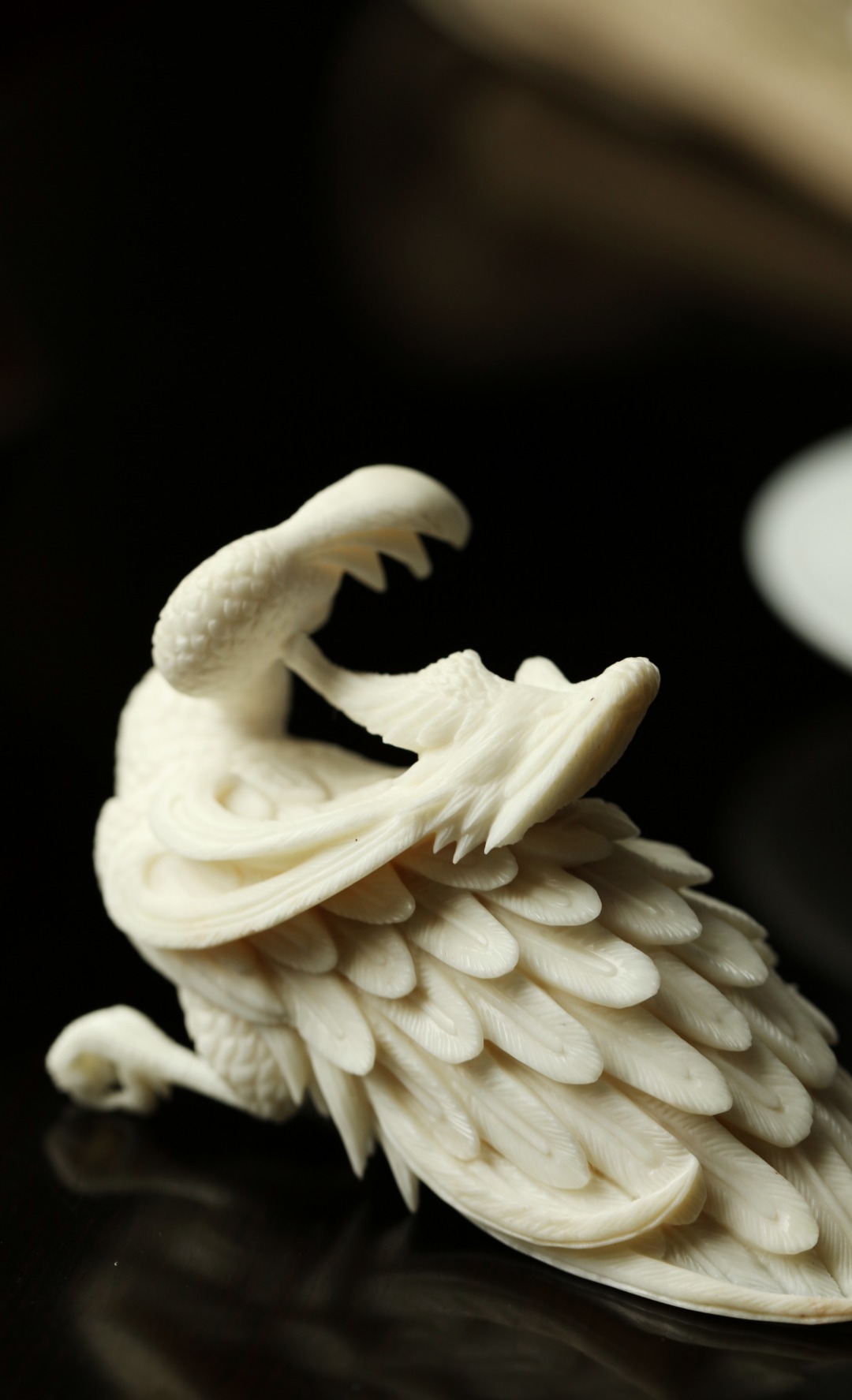 原材精工,料质细腻洁白,孔雀头顶花翎,喜鹊探身如嗅,技法运用自如,案头造景空灵唯美。