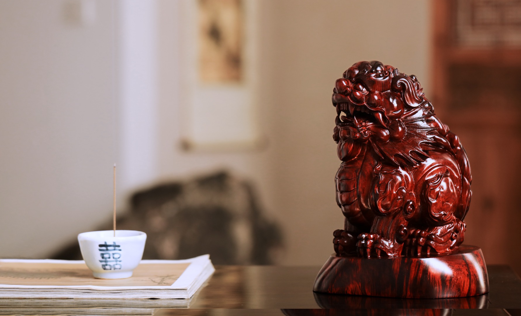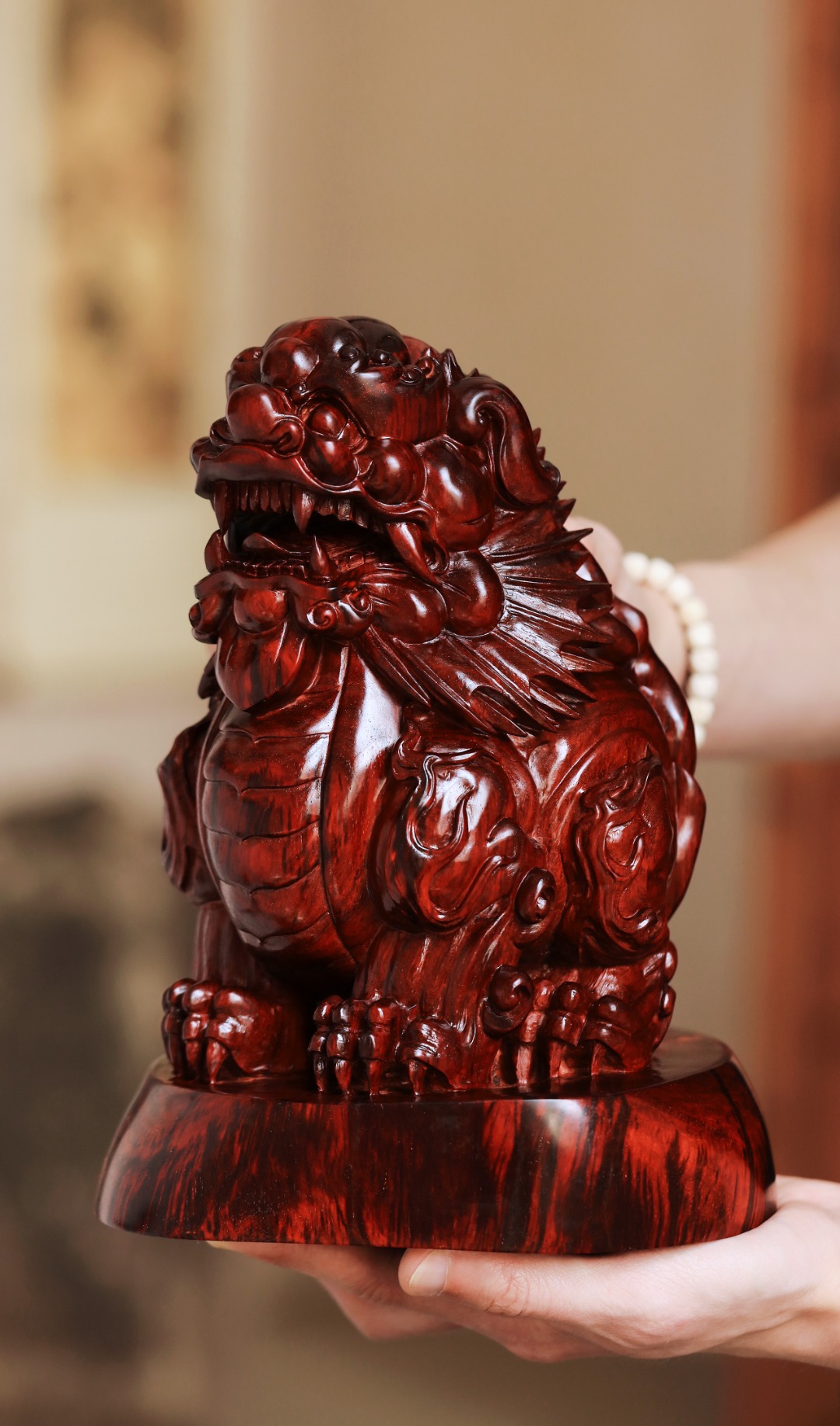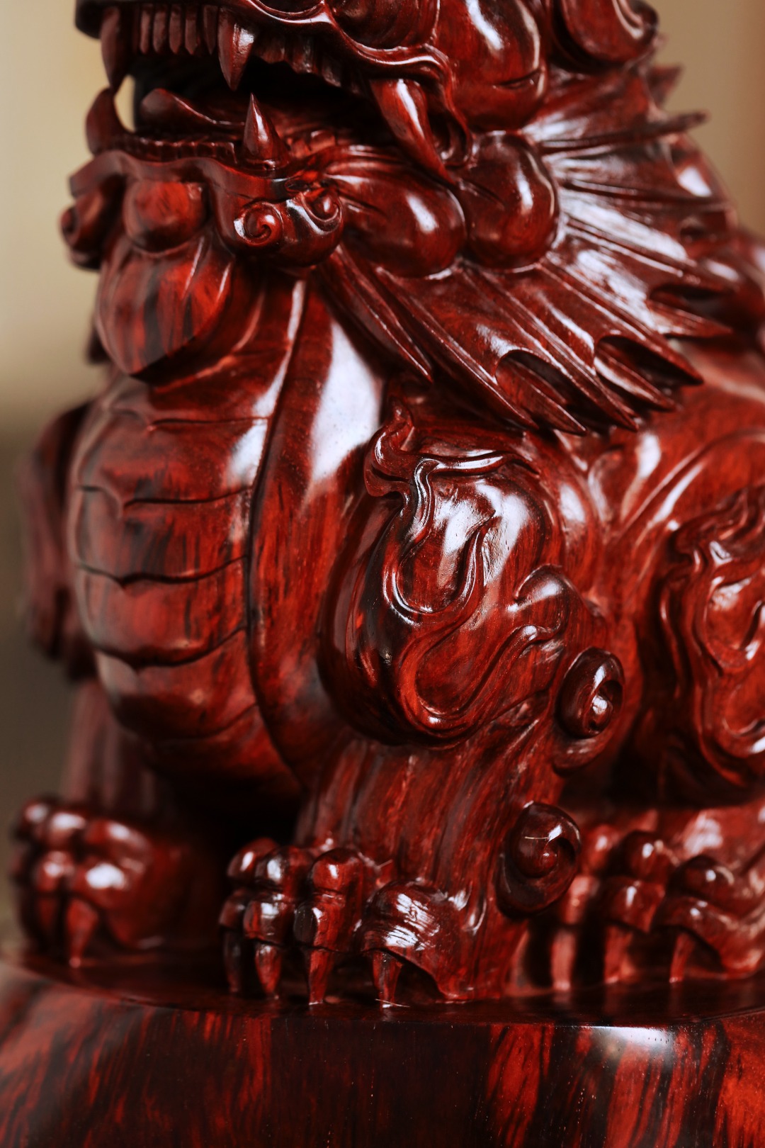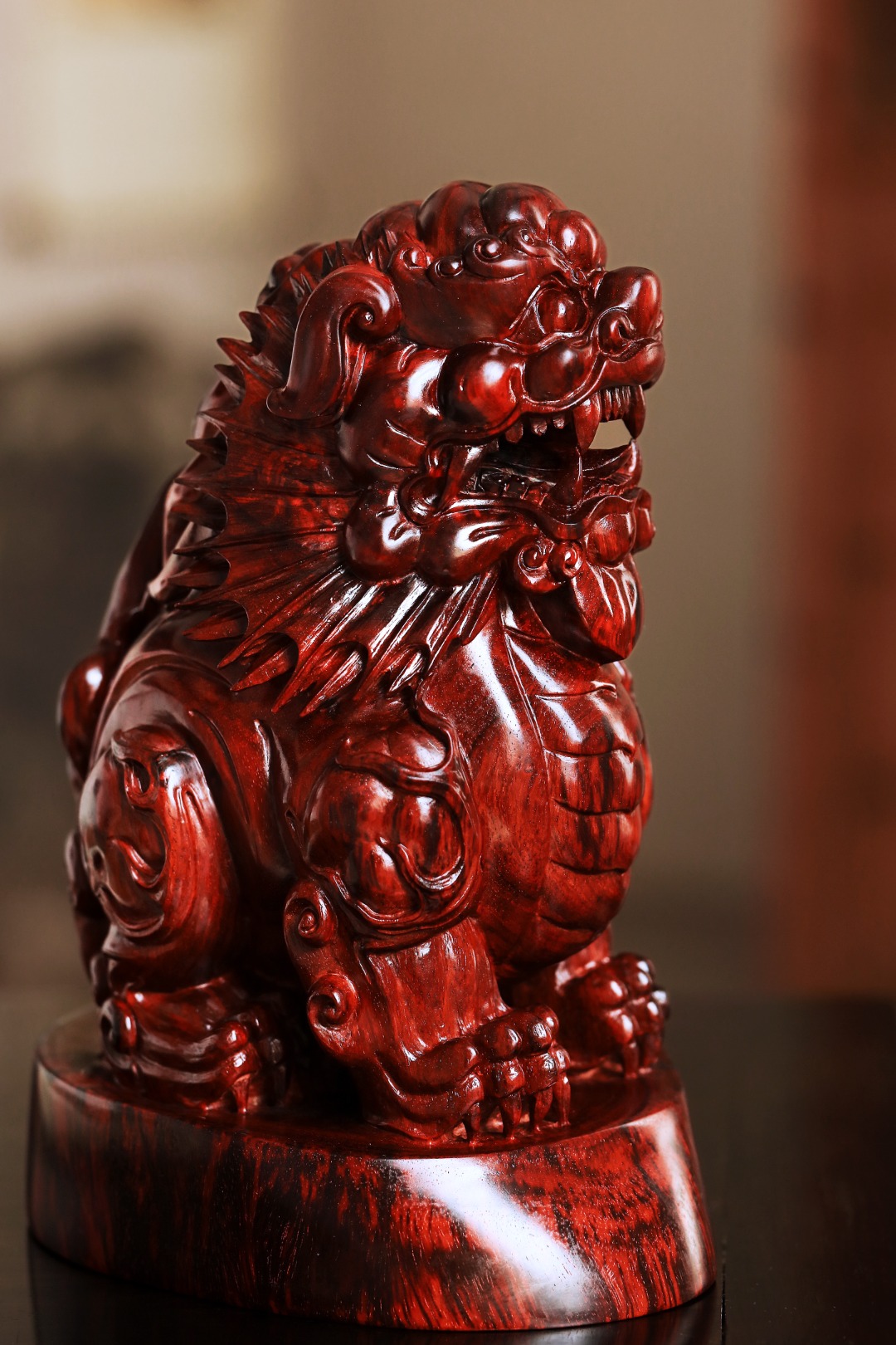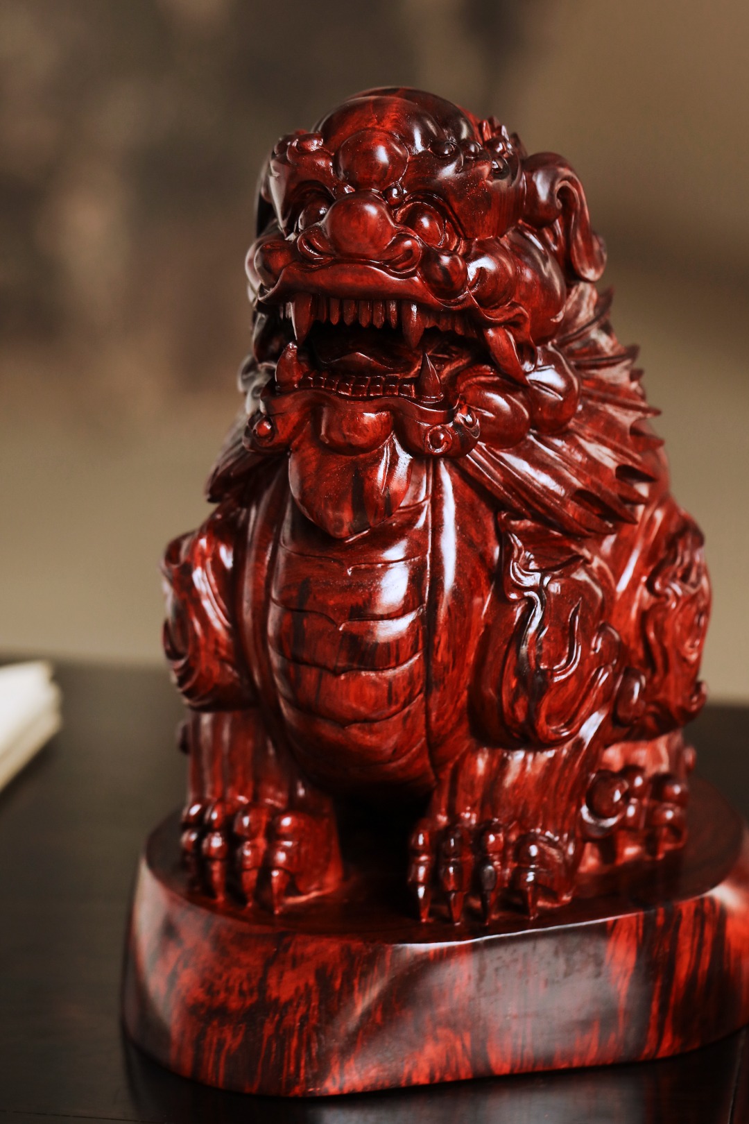 择紫檀大口径老料雕刻,百兽之王,姿态威严,灵气十足,置案头添生趣,增古韵,显吉祥。