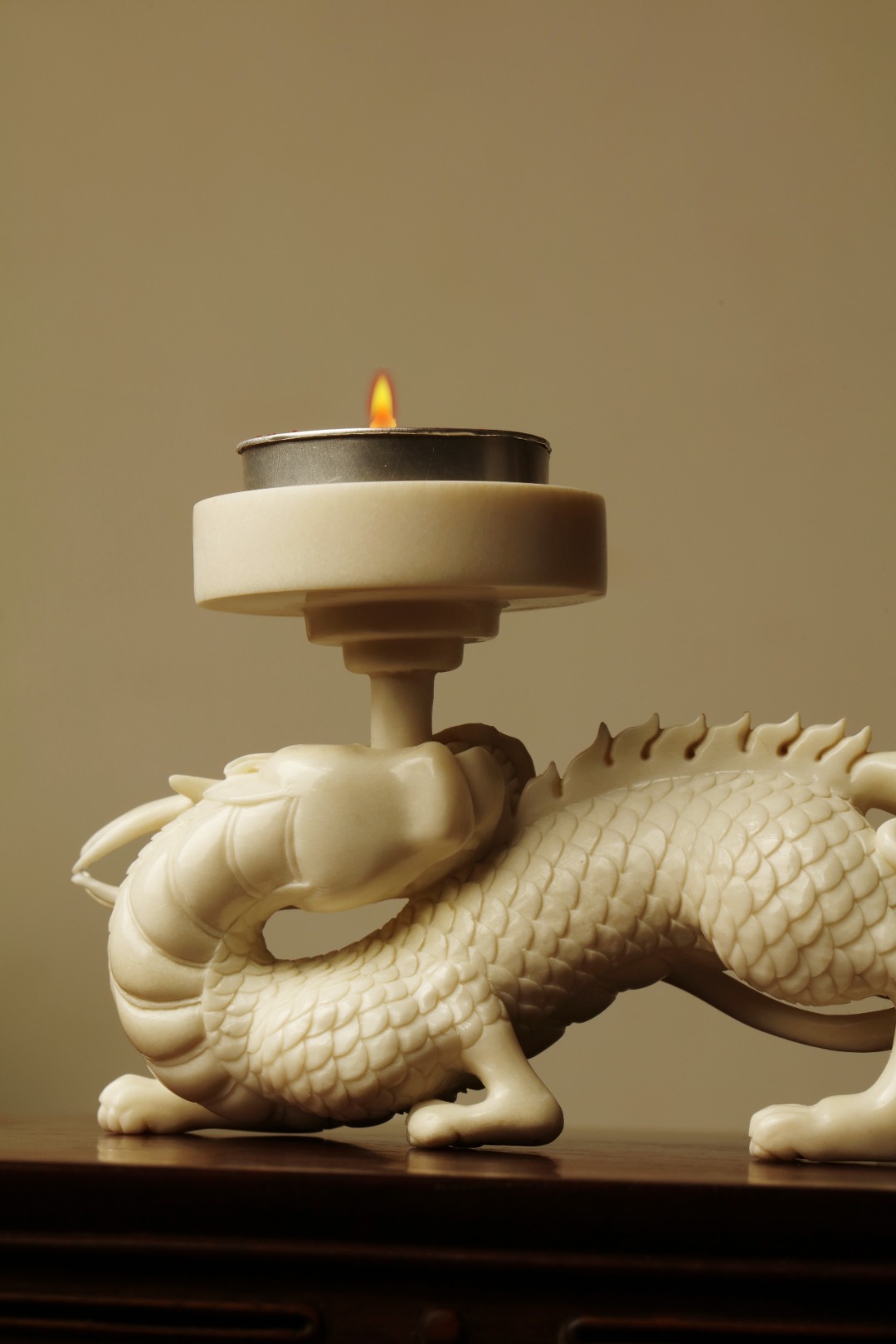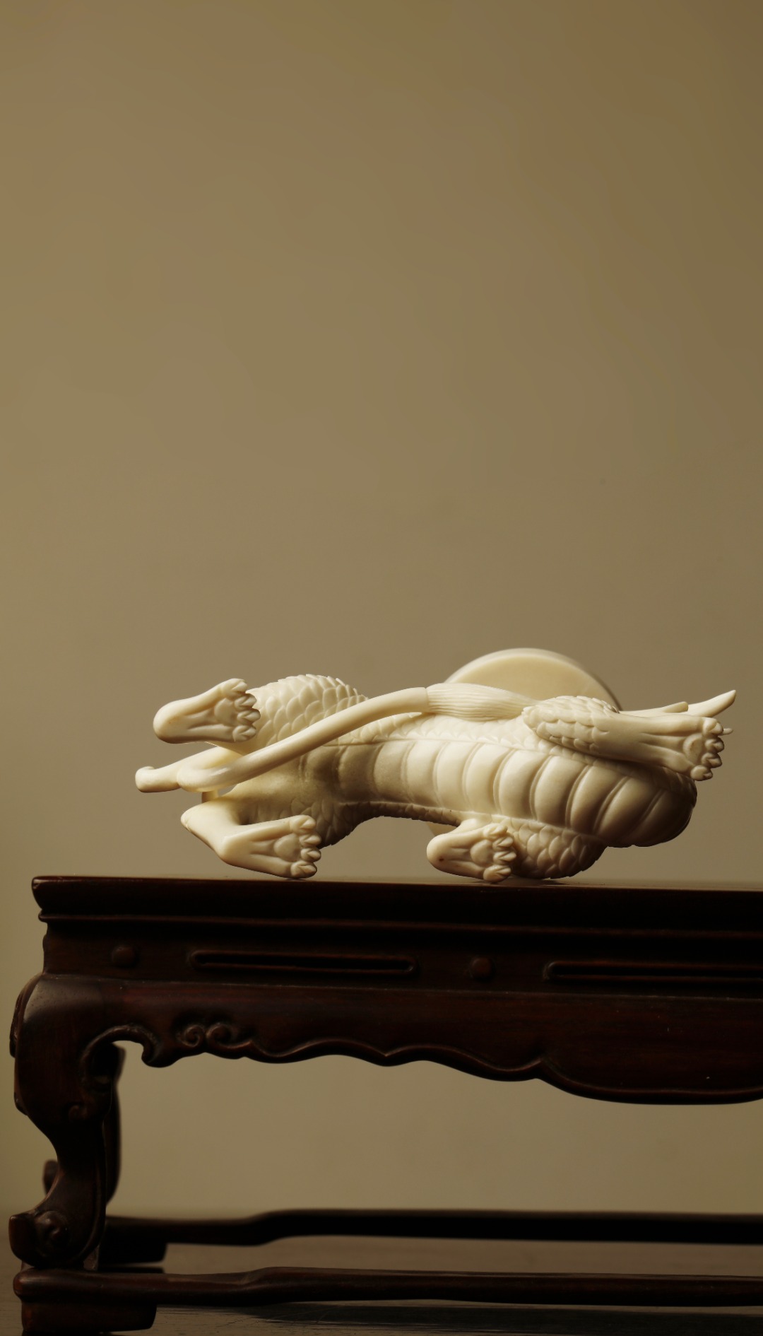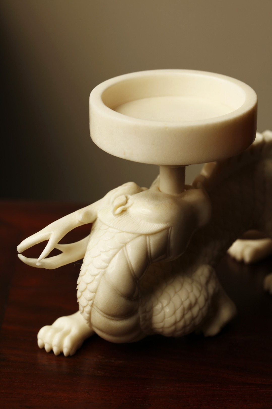 整料手雕,技法洗练畅达,整材雕成,首尾贯连一气,神兽灵动有神。案几陈置茶烛,意境优雅,清新不俗。