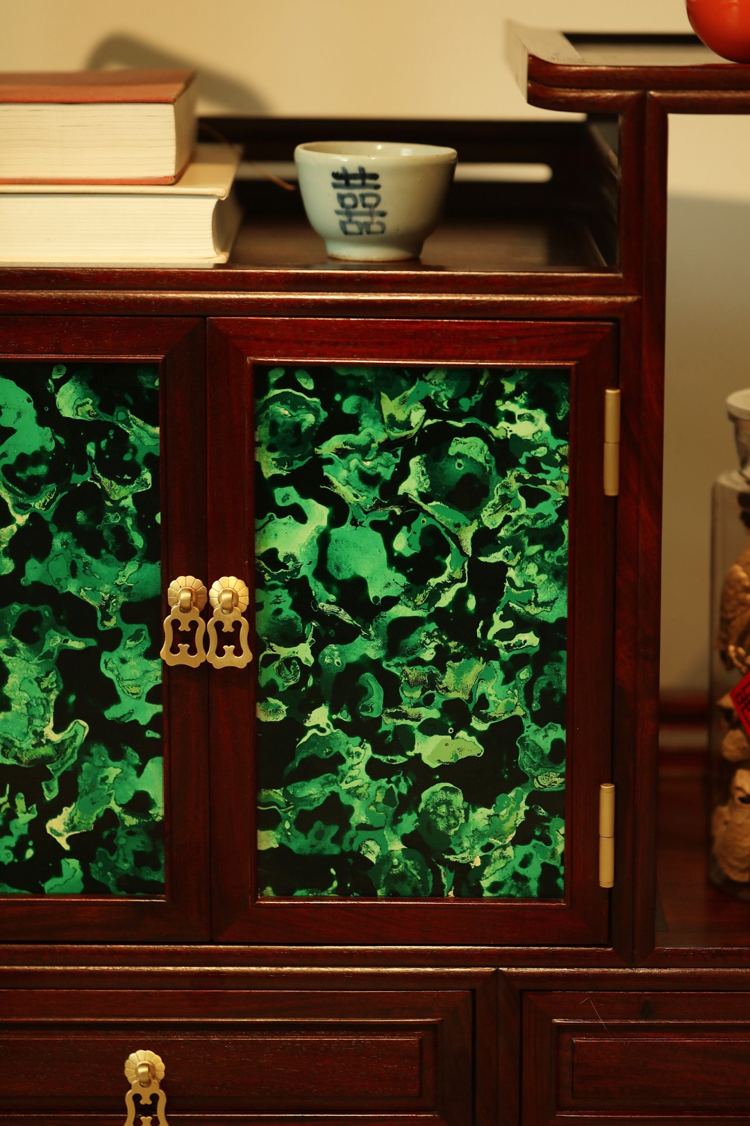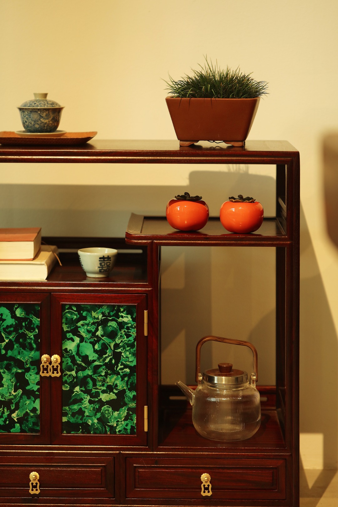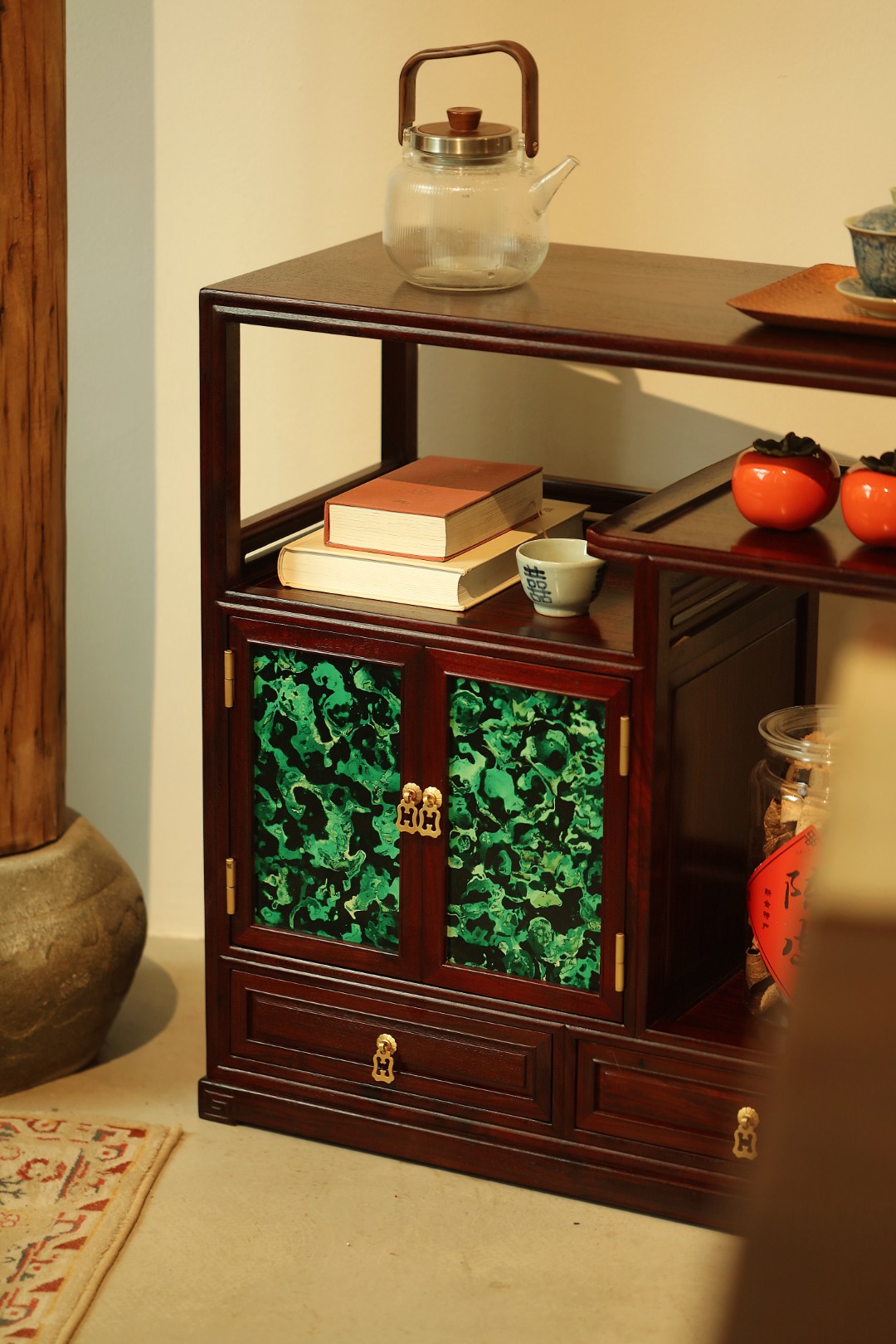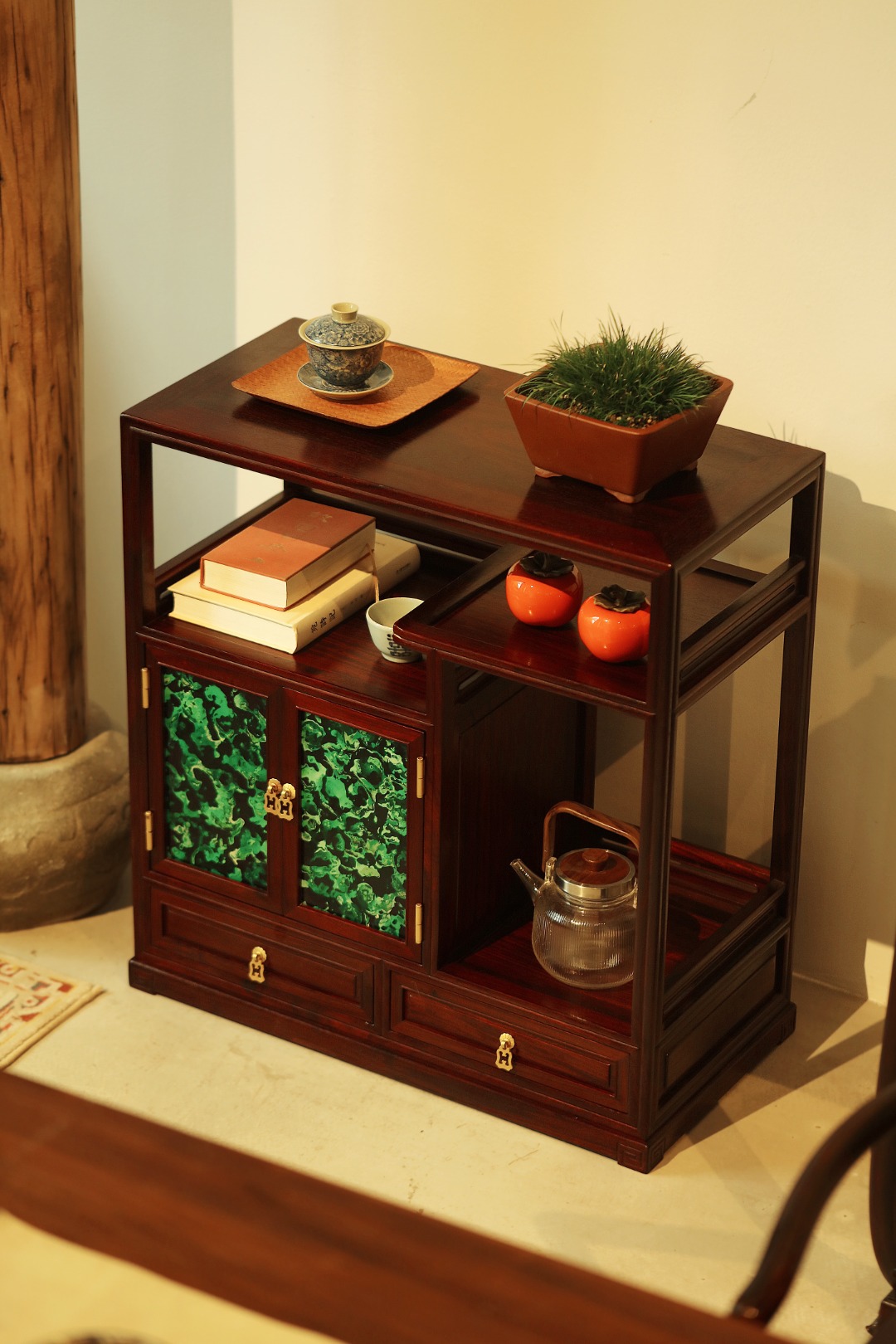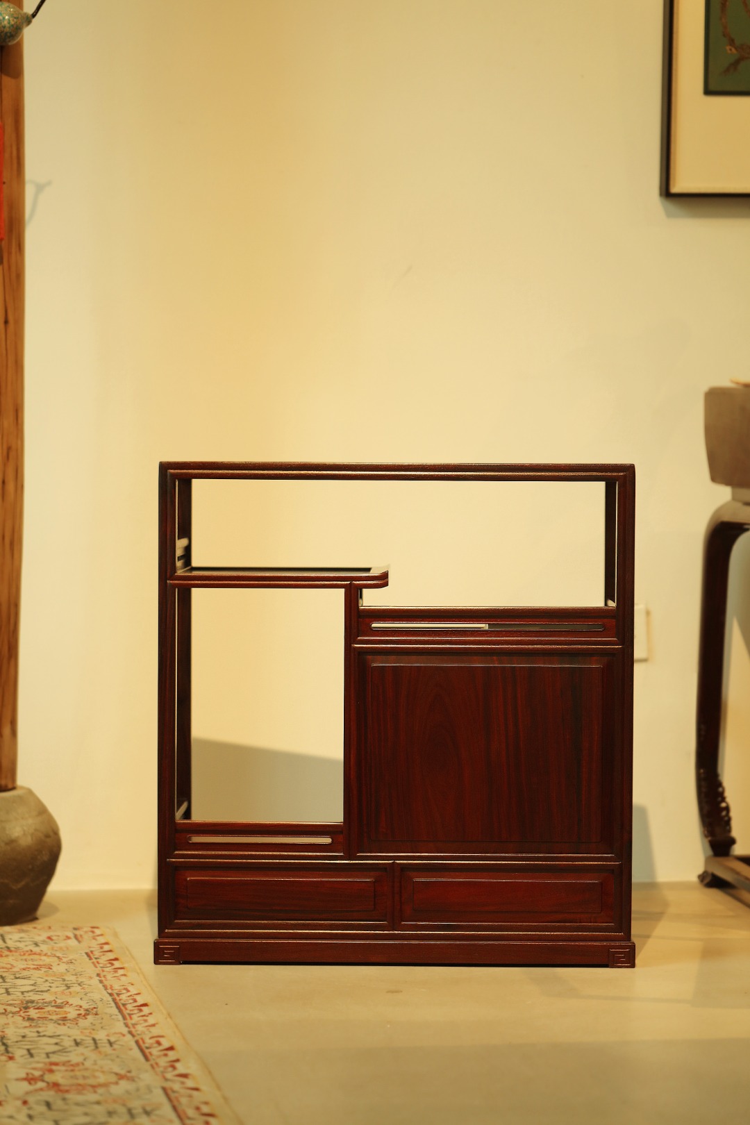 茶水柜设三层层板,一二层可放置茶饼茶具,三层可放置5L桶装水。柜体门板做非遗大漆工艺、历经数月打造,料质极佳,精工细作,榫卯结构。茶室置器,皆宜大雅。