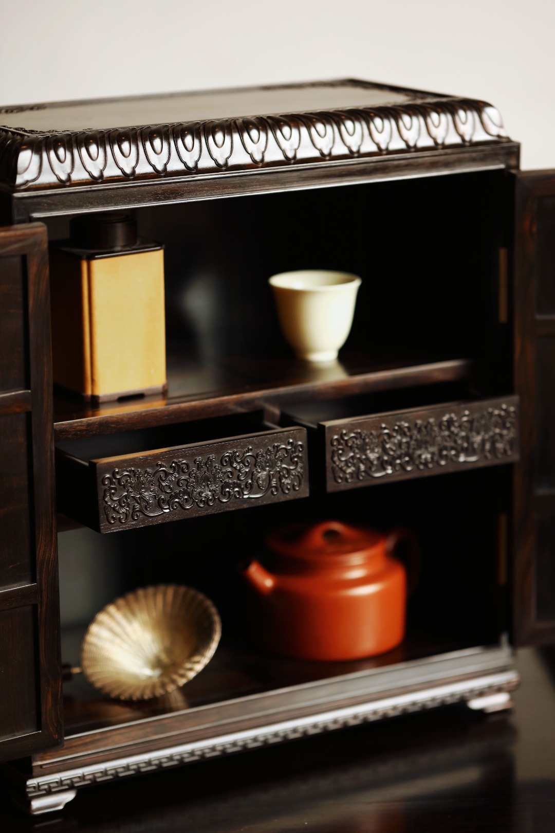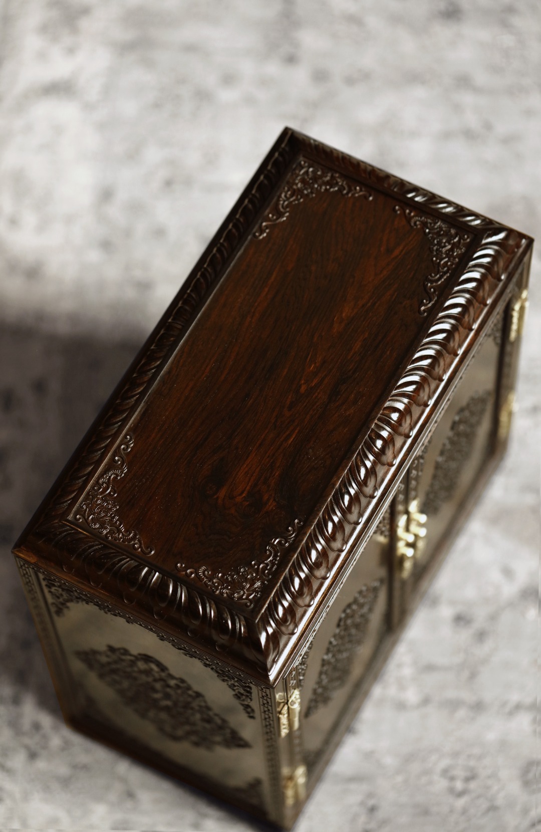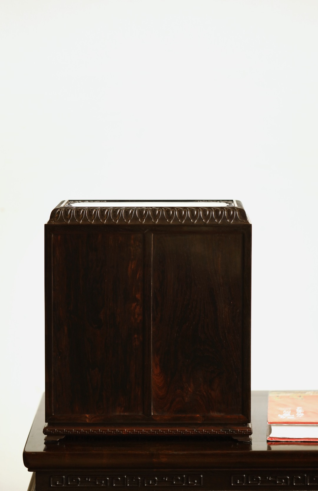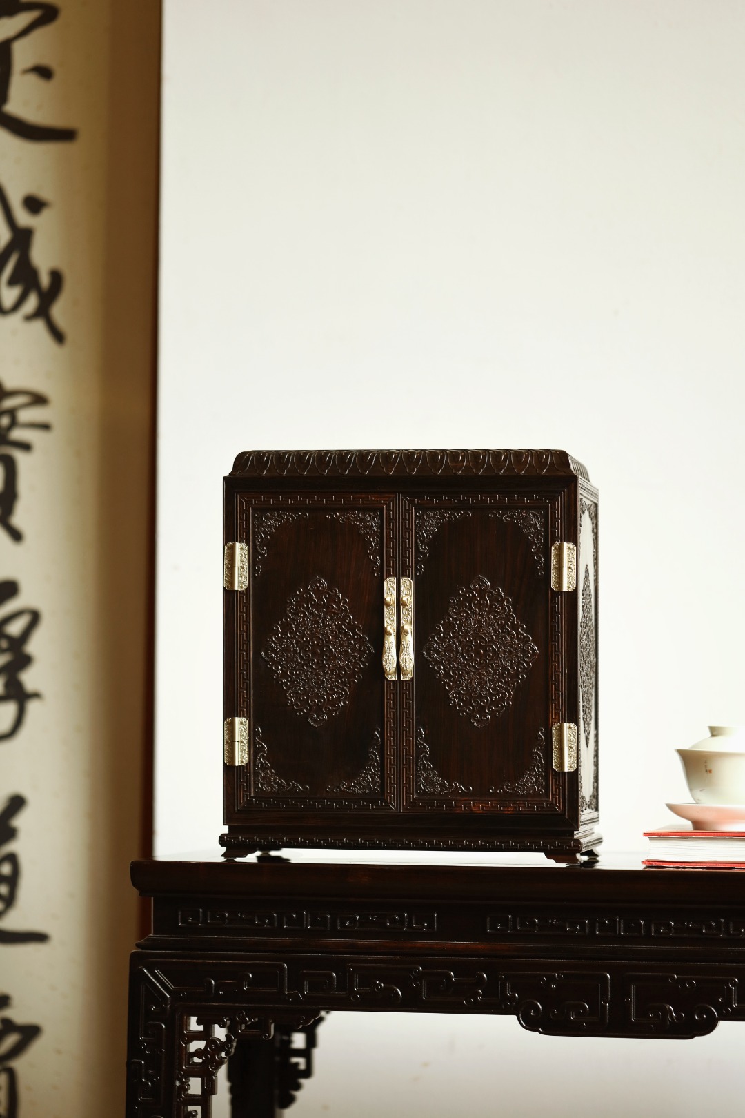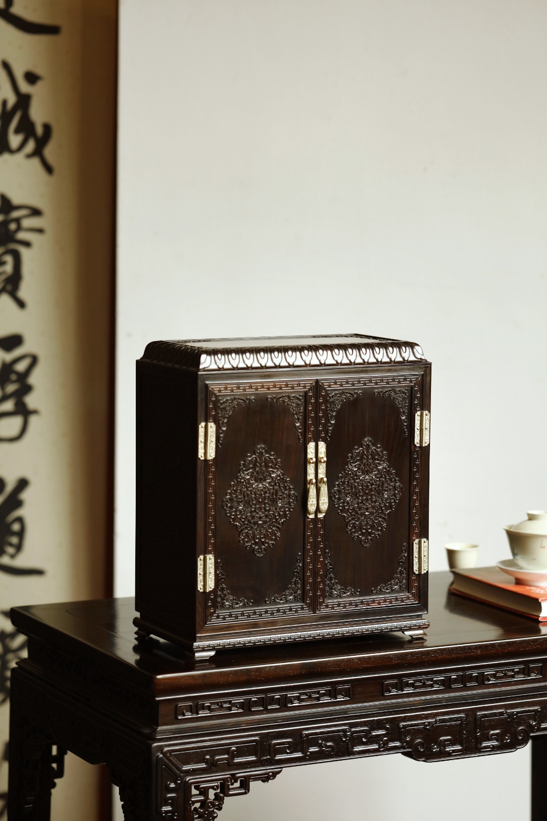 经典款 故宫典藏 ‼️ 取紫光檀高密高油老料,周身满工满雕西番莲纹、芍药花纹、如意回纹、莲花瓣纹等传统纹饰,内设两层两屉,可藏可用。