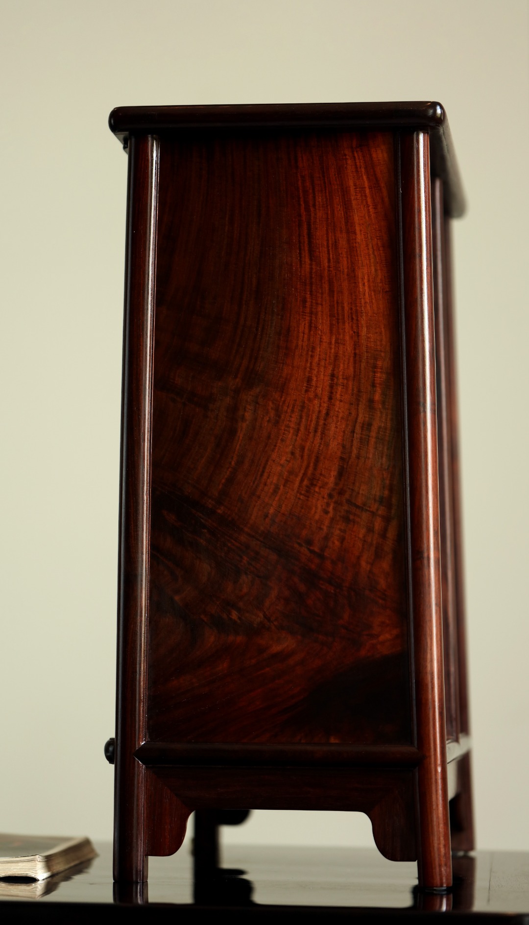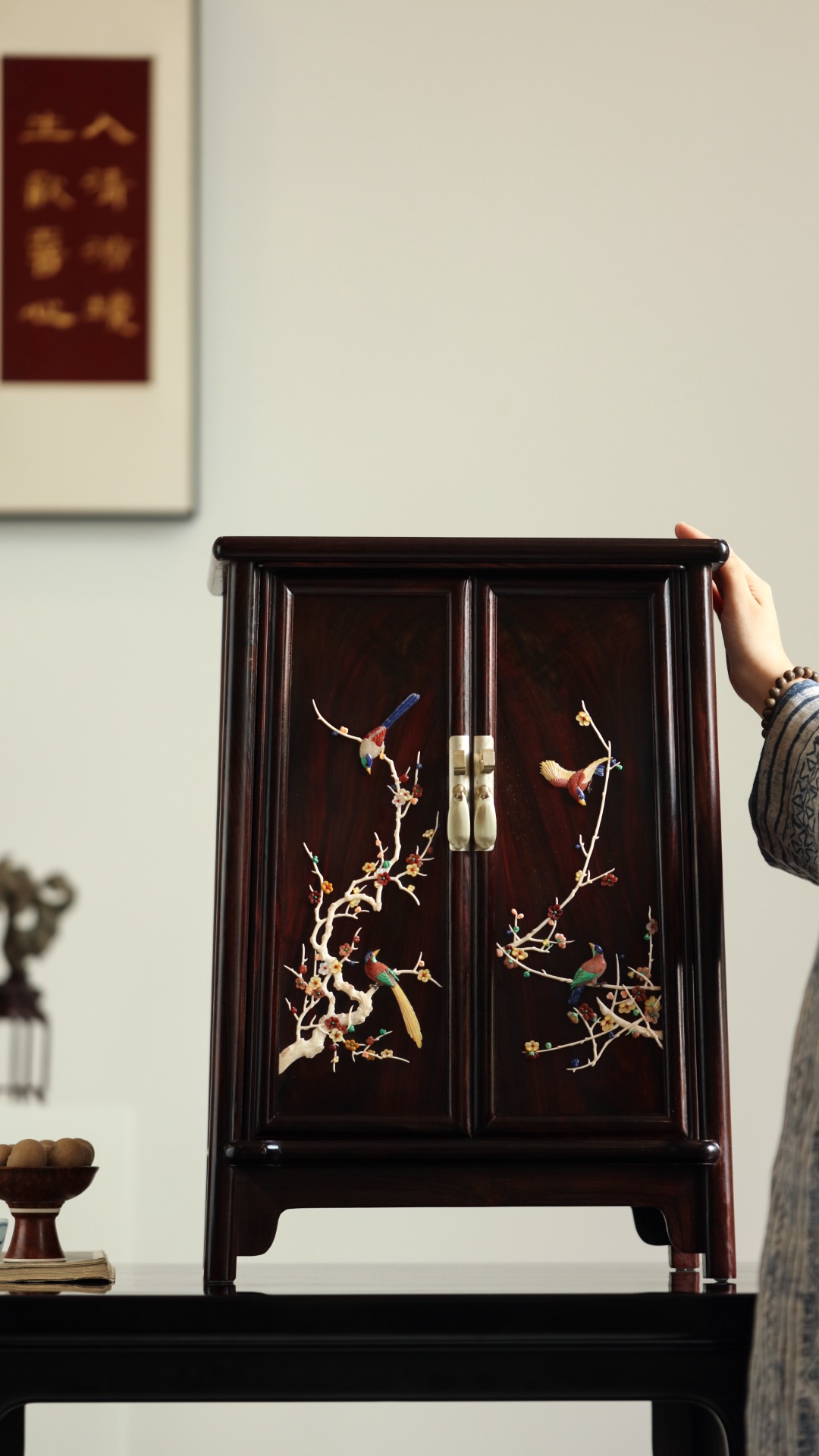 择取精品老料制作,工艺考究,全独板,柜门对开端庄大方,柜门以百宝嵌,图案精美,门内共双层两屉,可放置文玩、茶具,百搭大气!