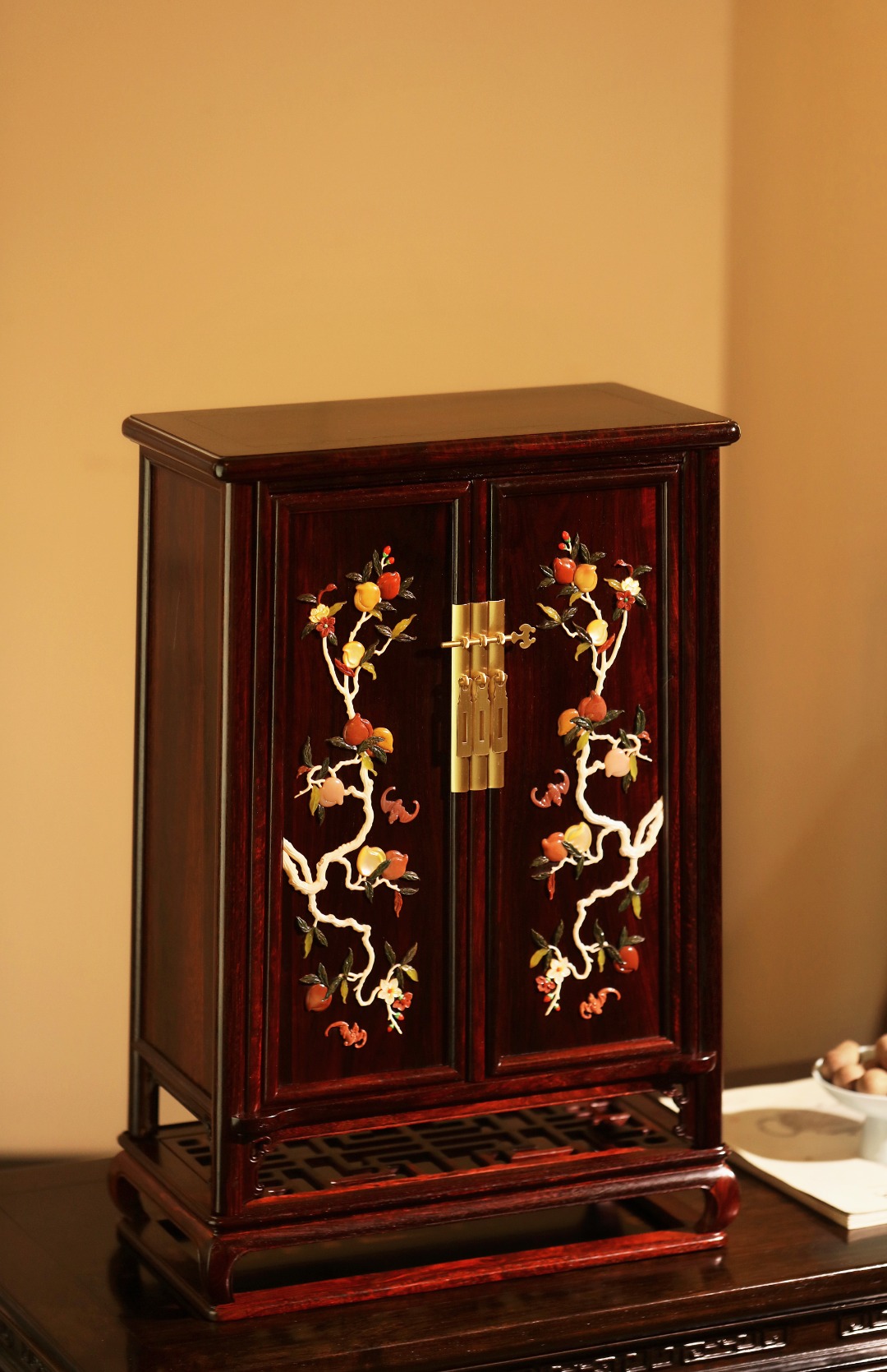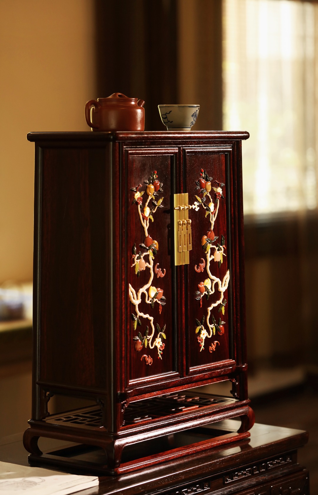 精选小叶紫檀老料制器,器型考究,柜门百宝嵌寿桃、蝙蝠,寓福寿如意,文房藏物,茶室置器,皆宜大雅。