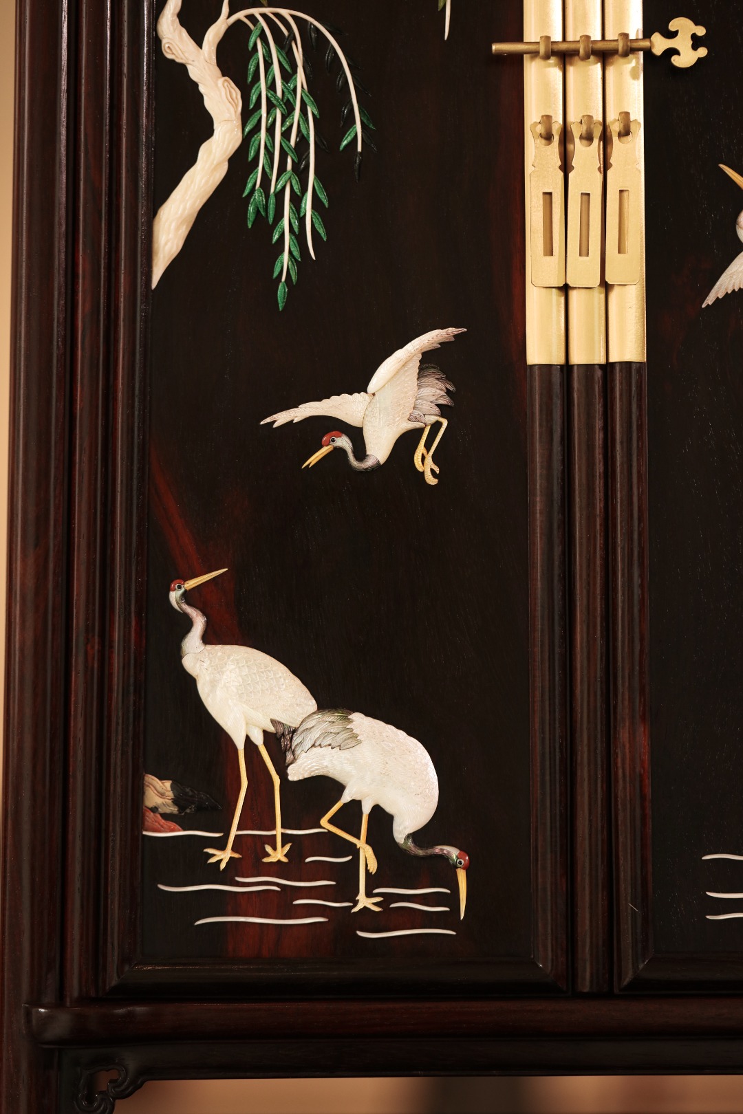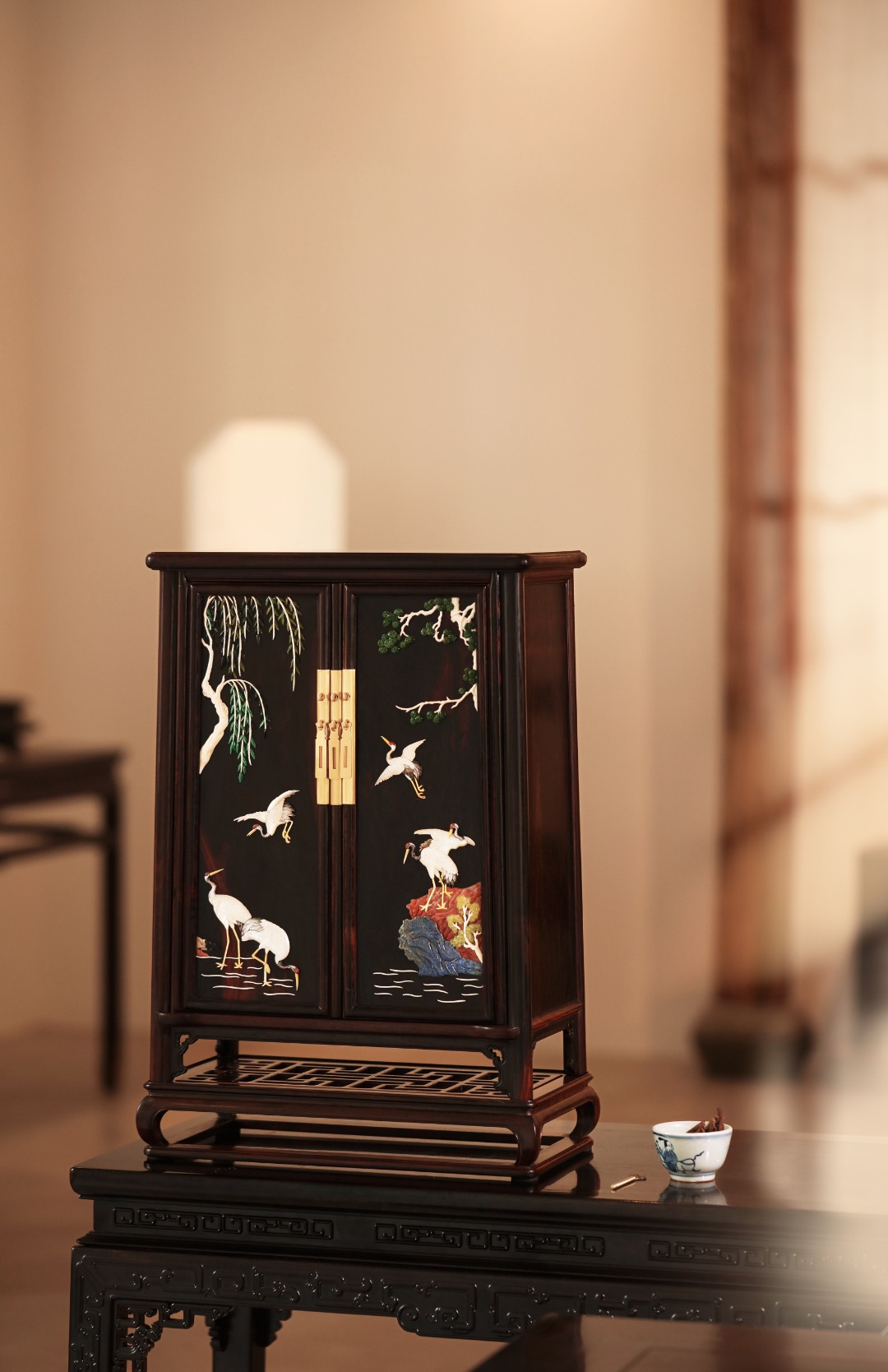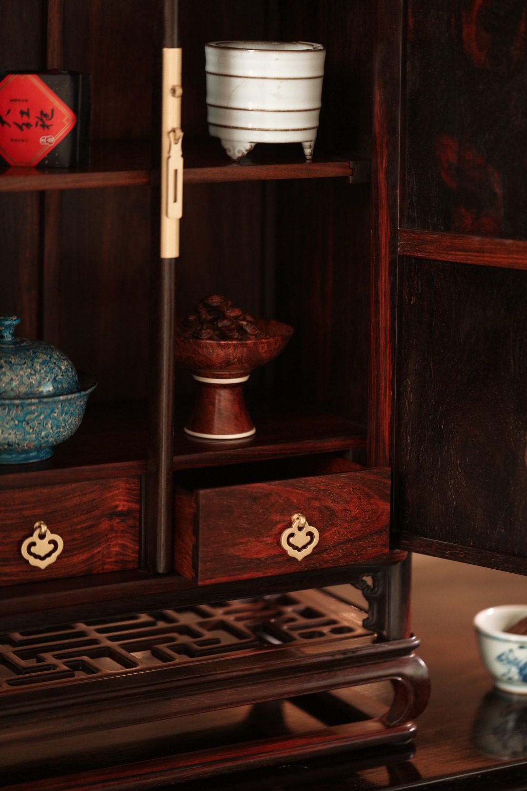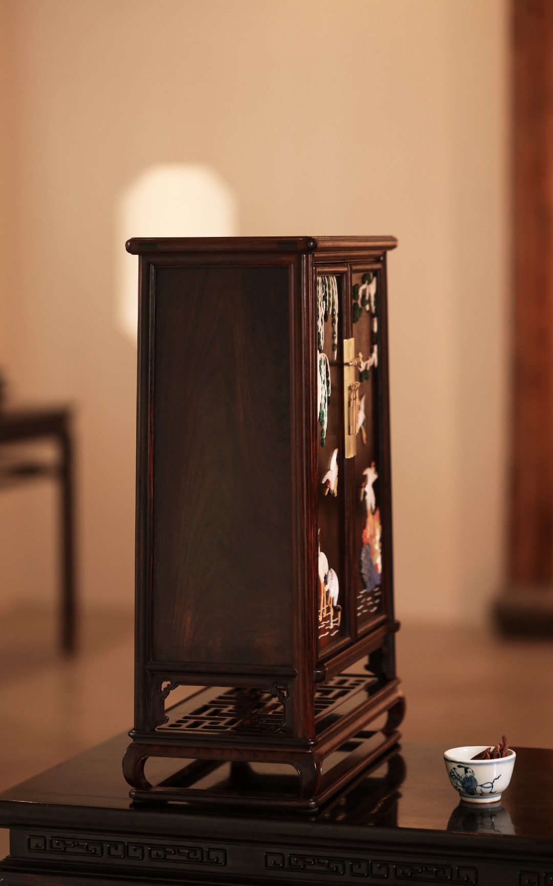 择精品老挝大红酸枝老料,全独板制,选材制作考究,柜门百宝嵌饰,斑斓雅致;文房藏物,茶室置器,皆宜大雅。
