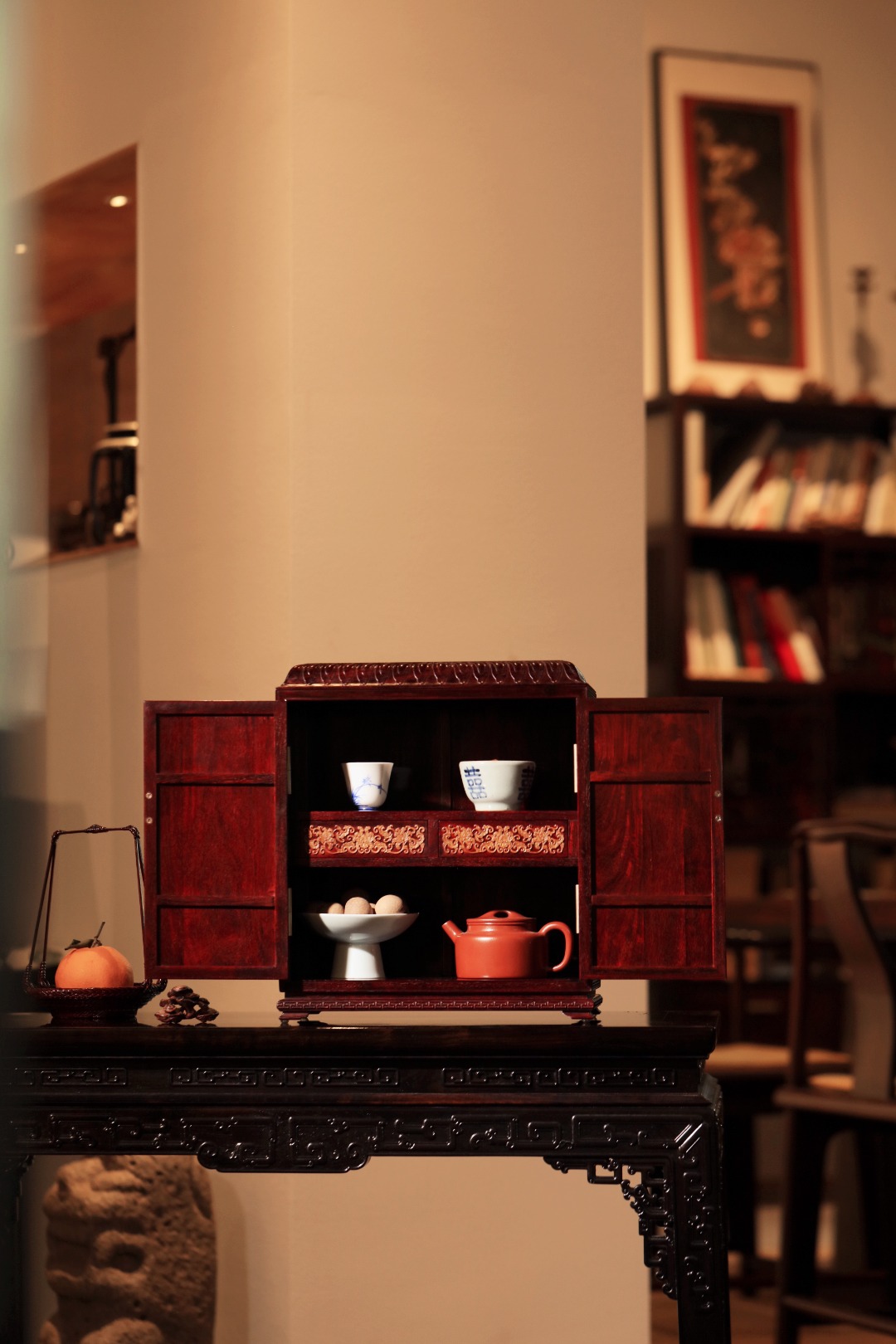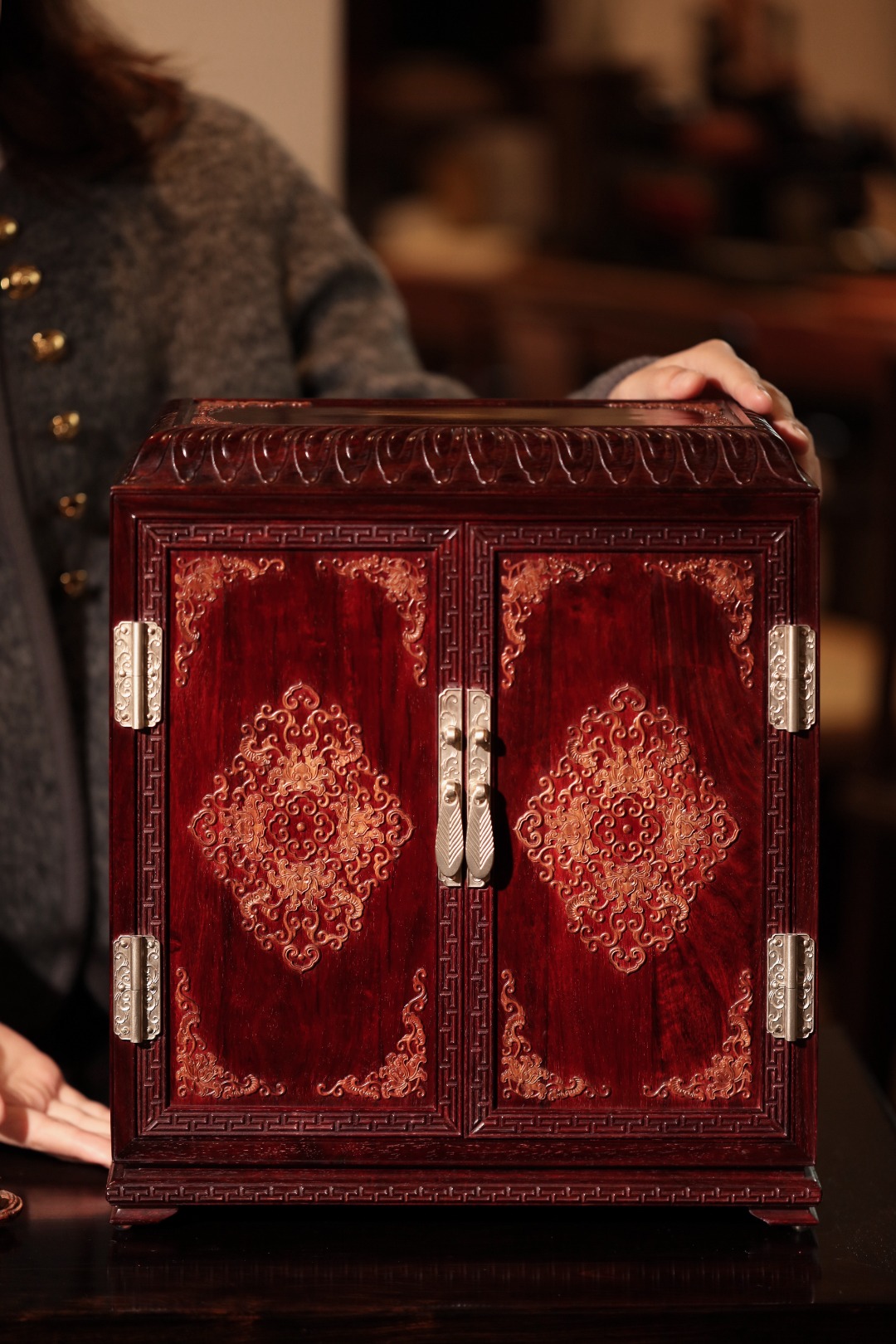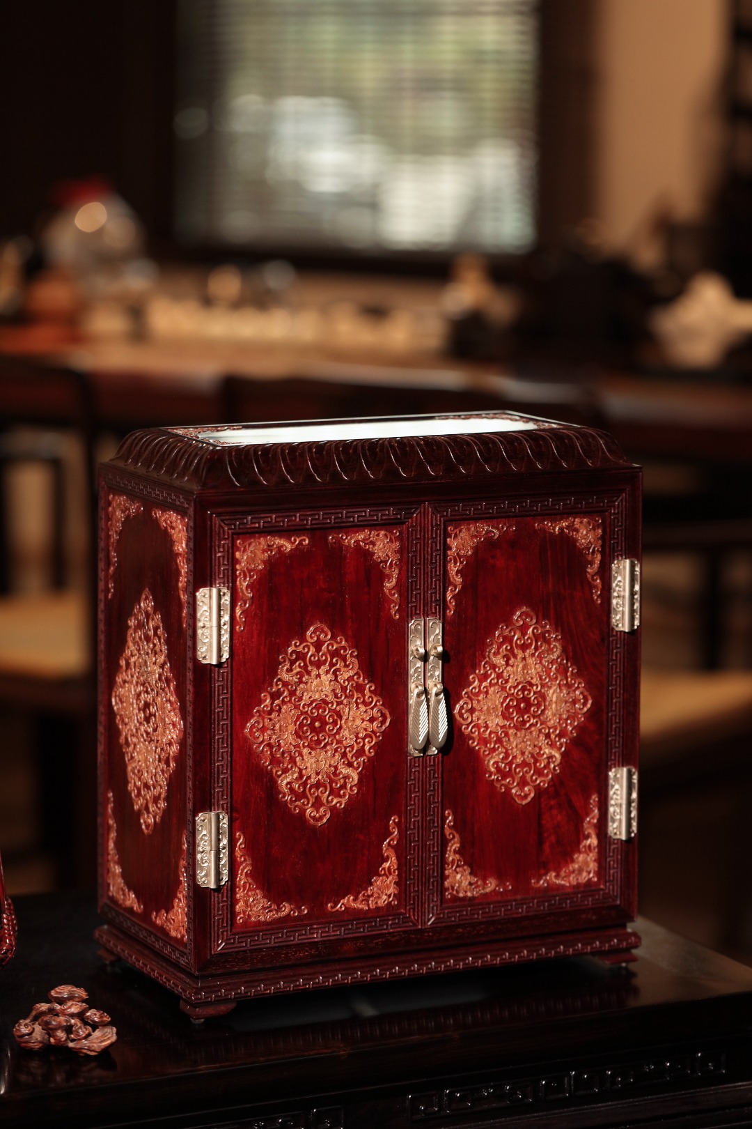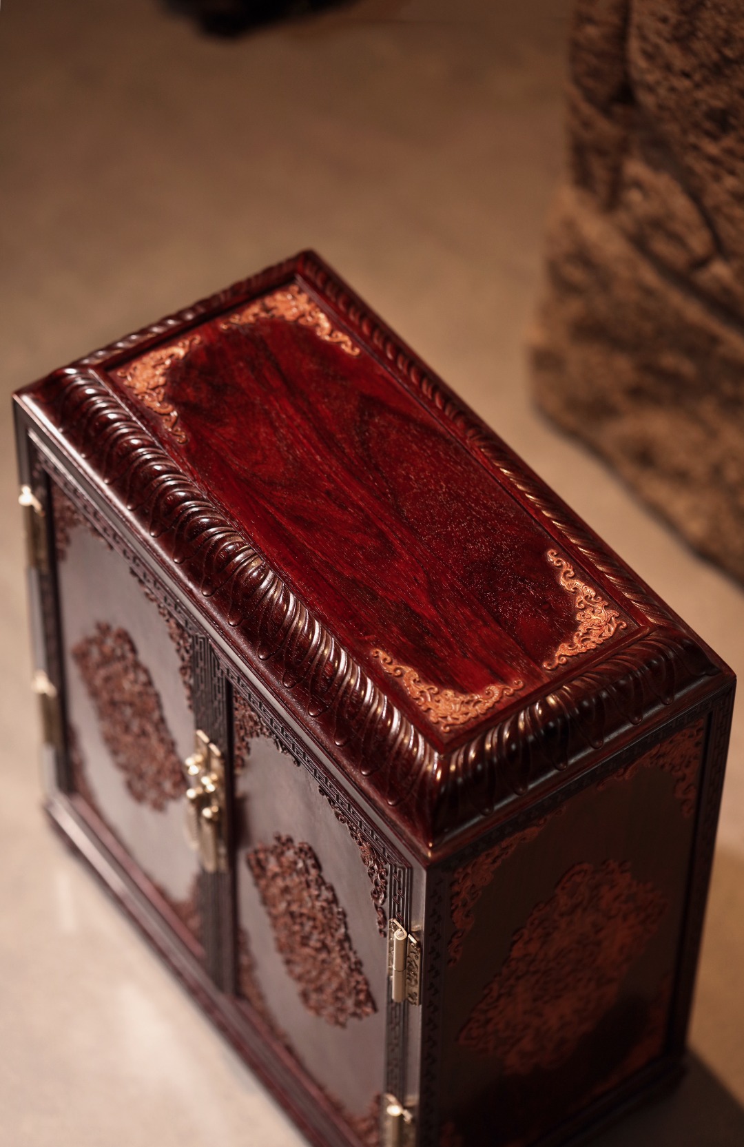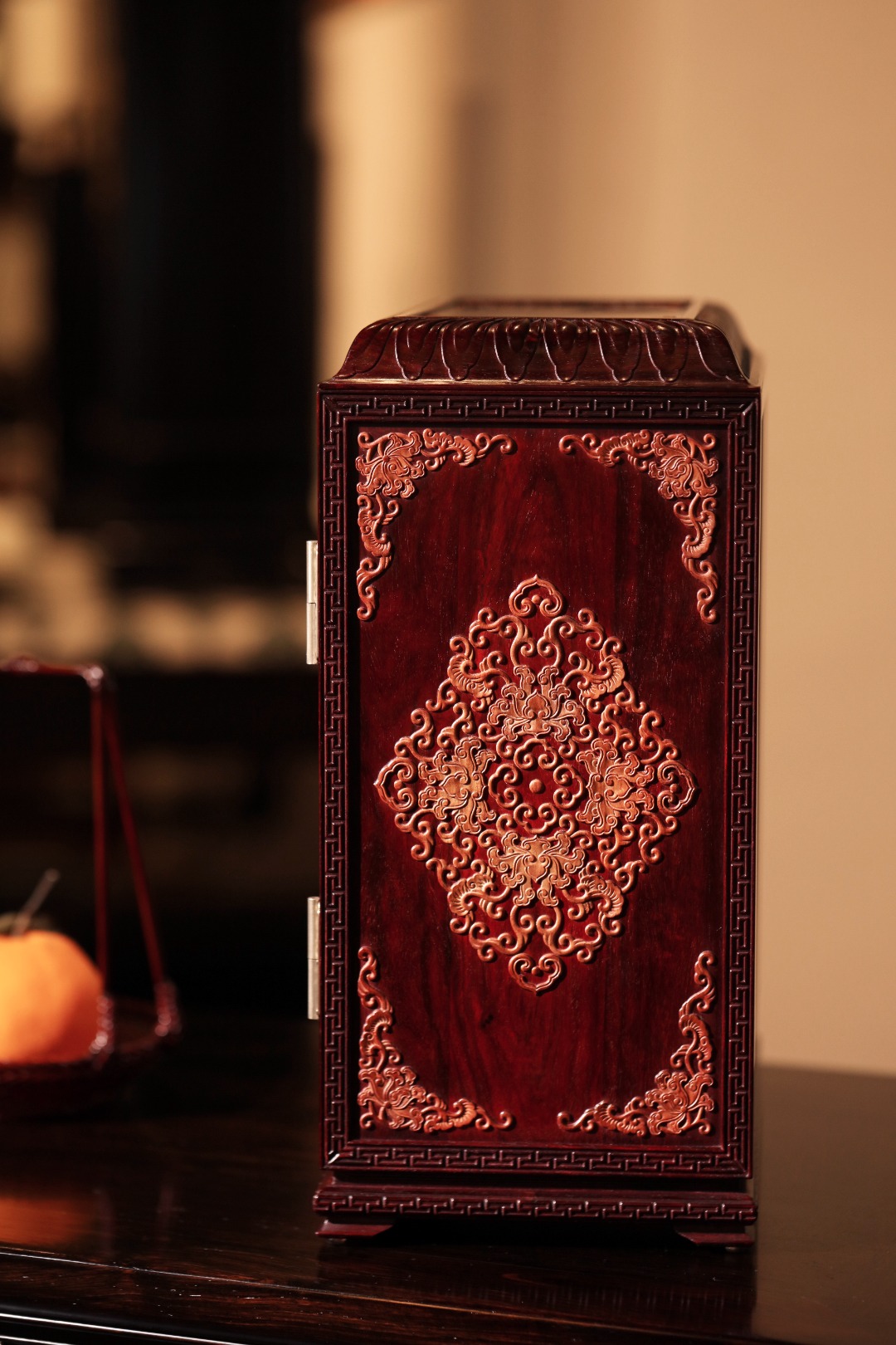 选材制作精良,比例优美端庄,箱门、两侧、顶镶嵌勺药花如意纹 ,内设两层两屉,可置雅物。整器端庄稳重,皇家贵族风范。