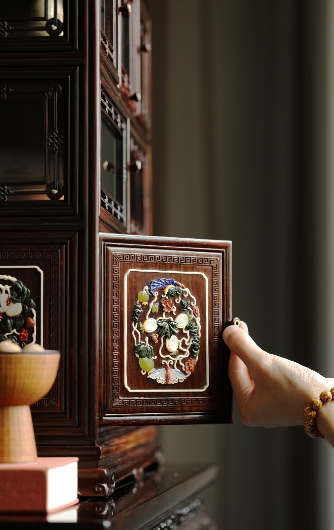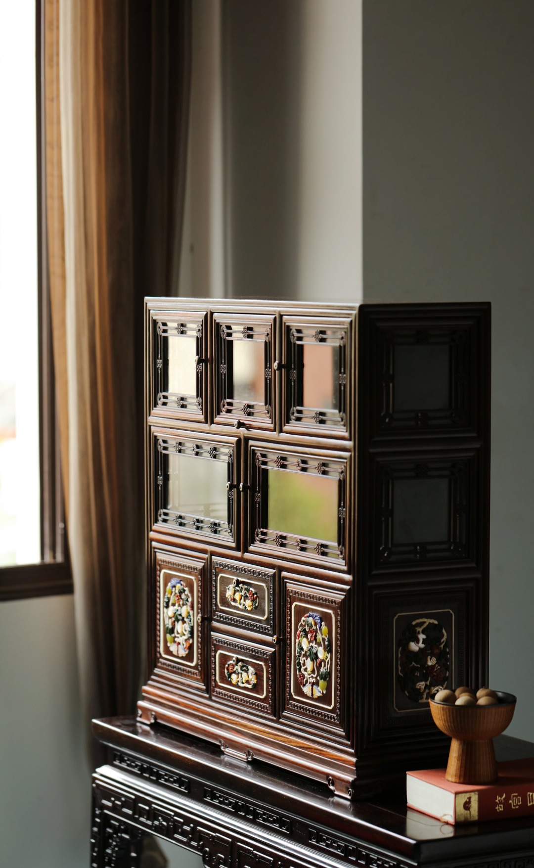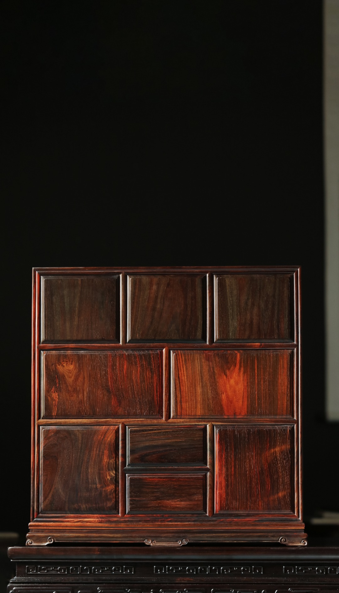 老挝大红酸枝制,上层通透明朗,展博清玩,下层含蓄内敛,藏纳茗香。又以百宝镶嵌,周身纹饰优美。制作繁复精微,颇费功夫。存纳雅玩珍茗,贵气而不俗,可谓精品。