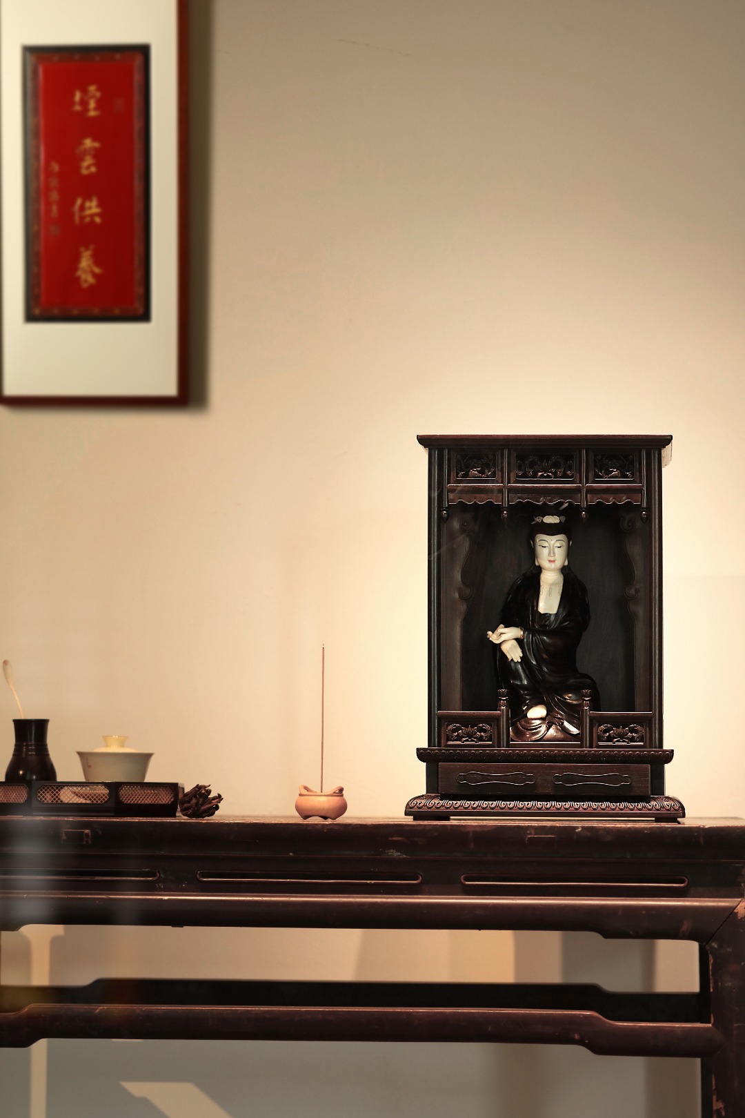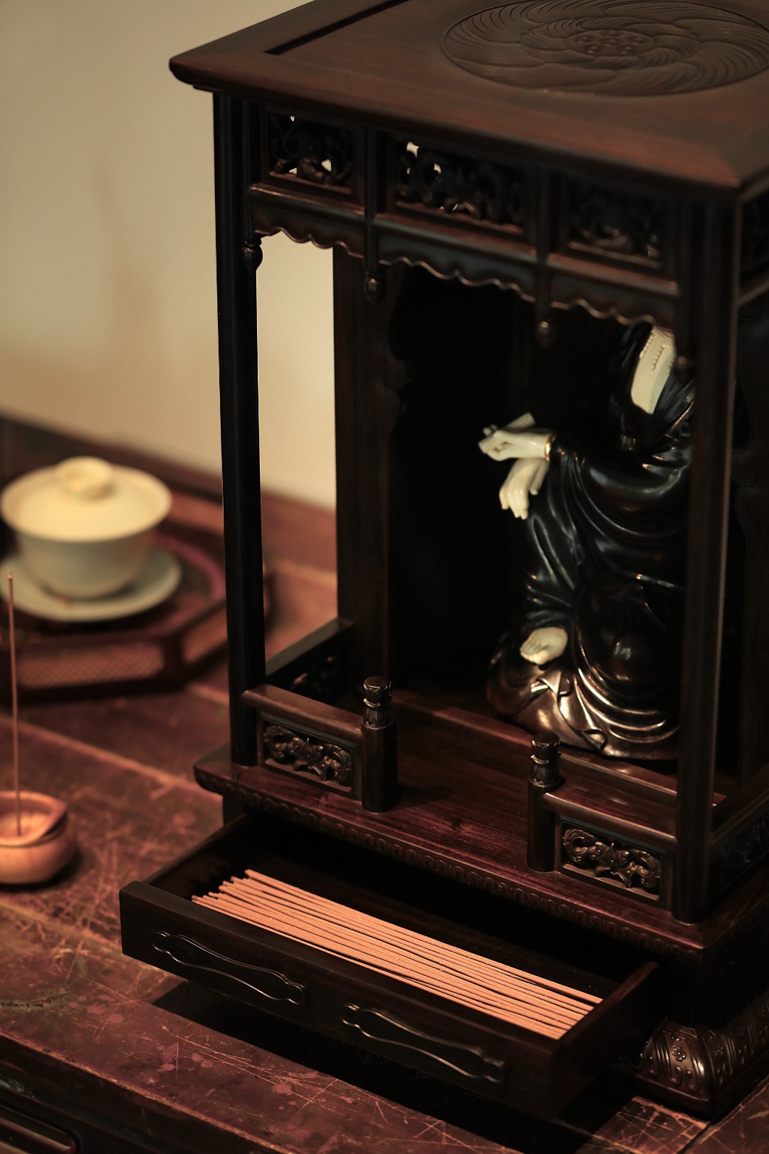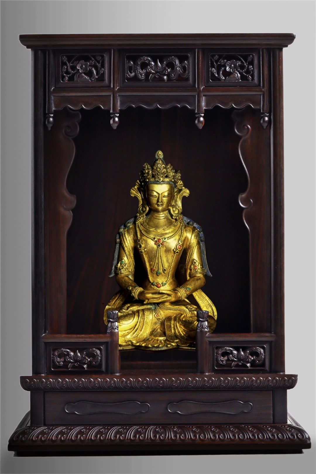 佛龛是专用供奉佛像、神位之所,一般为木制,也有少量石质者。最早以岩崖凿成洞窟以安置佛像,后来逐渐演化为室内以木材制作,其结构也由最初的洞窟演化为寺庙等传统建筑式样,造型较小,将佛像置于其内焚香供奉。