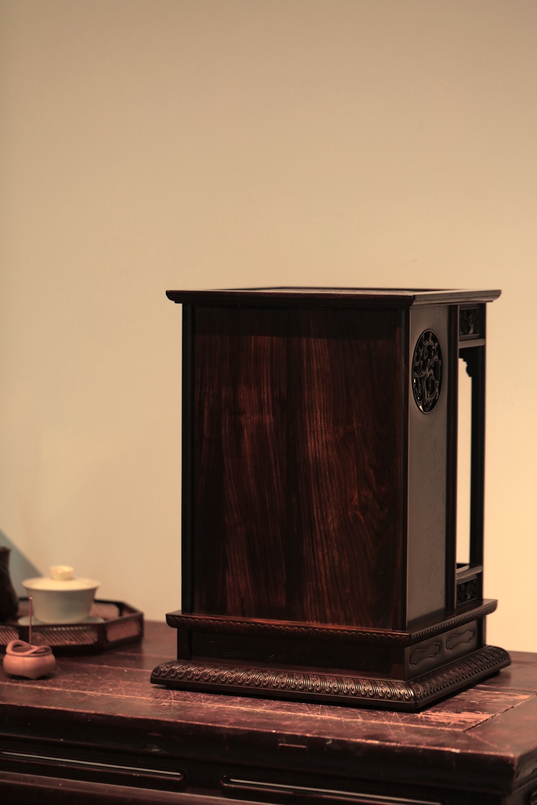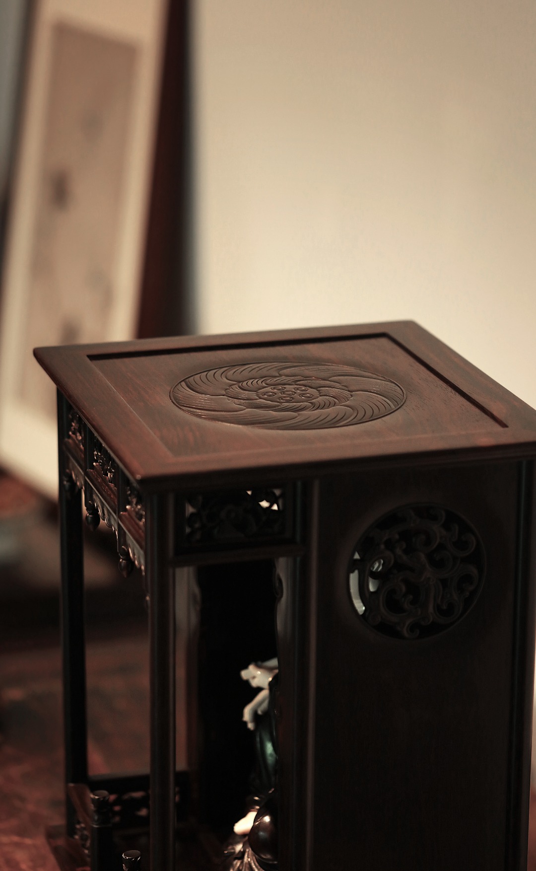 这件佛龛整体是上格下屉的型制,用材和做工皆考究,上半部形如寺庙式样,设有廊檐、垂花、立柱及围栏,顶部浮雕以及透雕西番莲卷草纹使整个佛龛显得庄严肃穆而又不失灵巧。