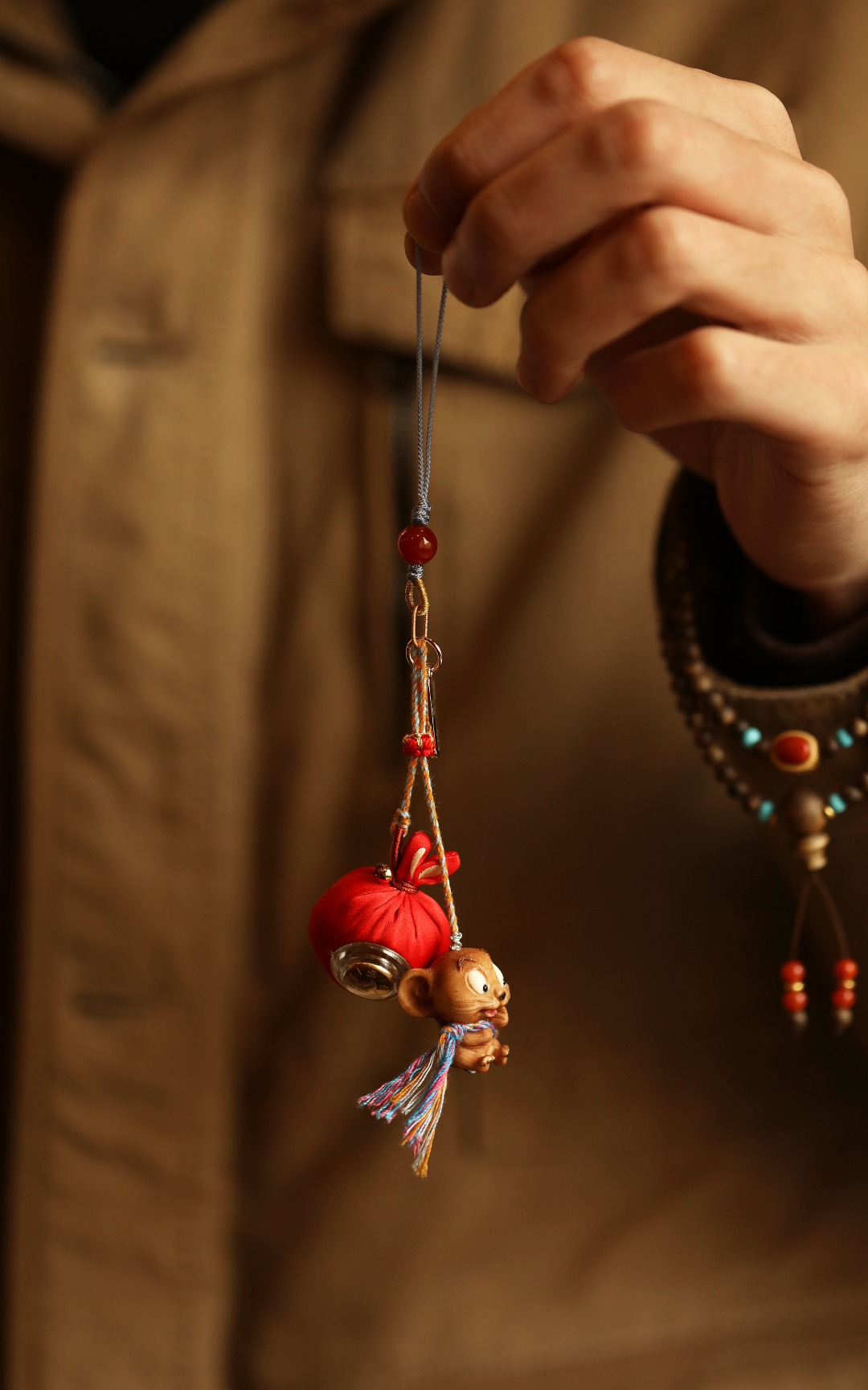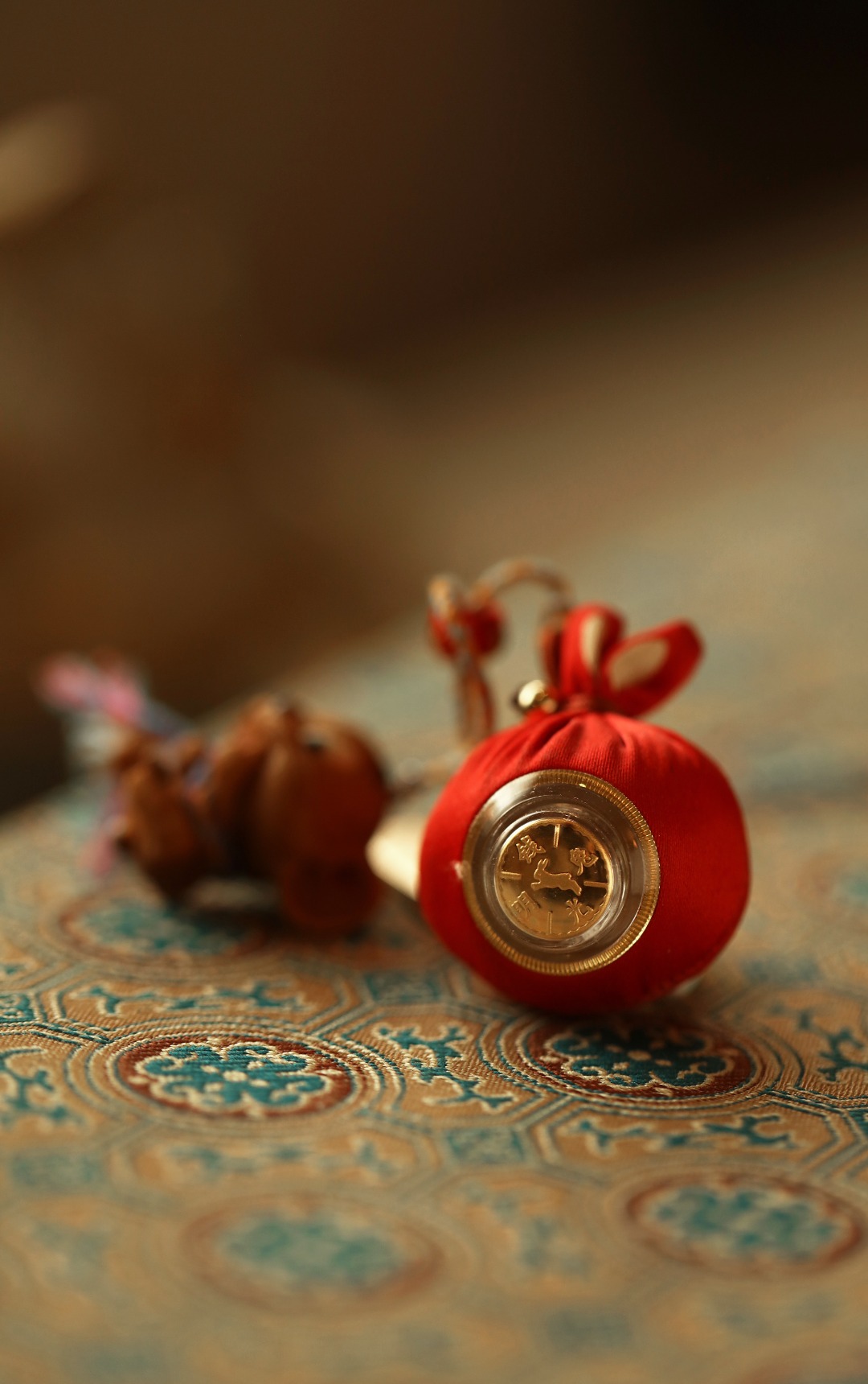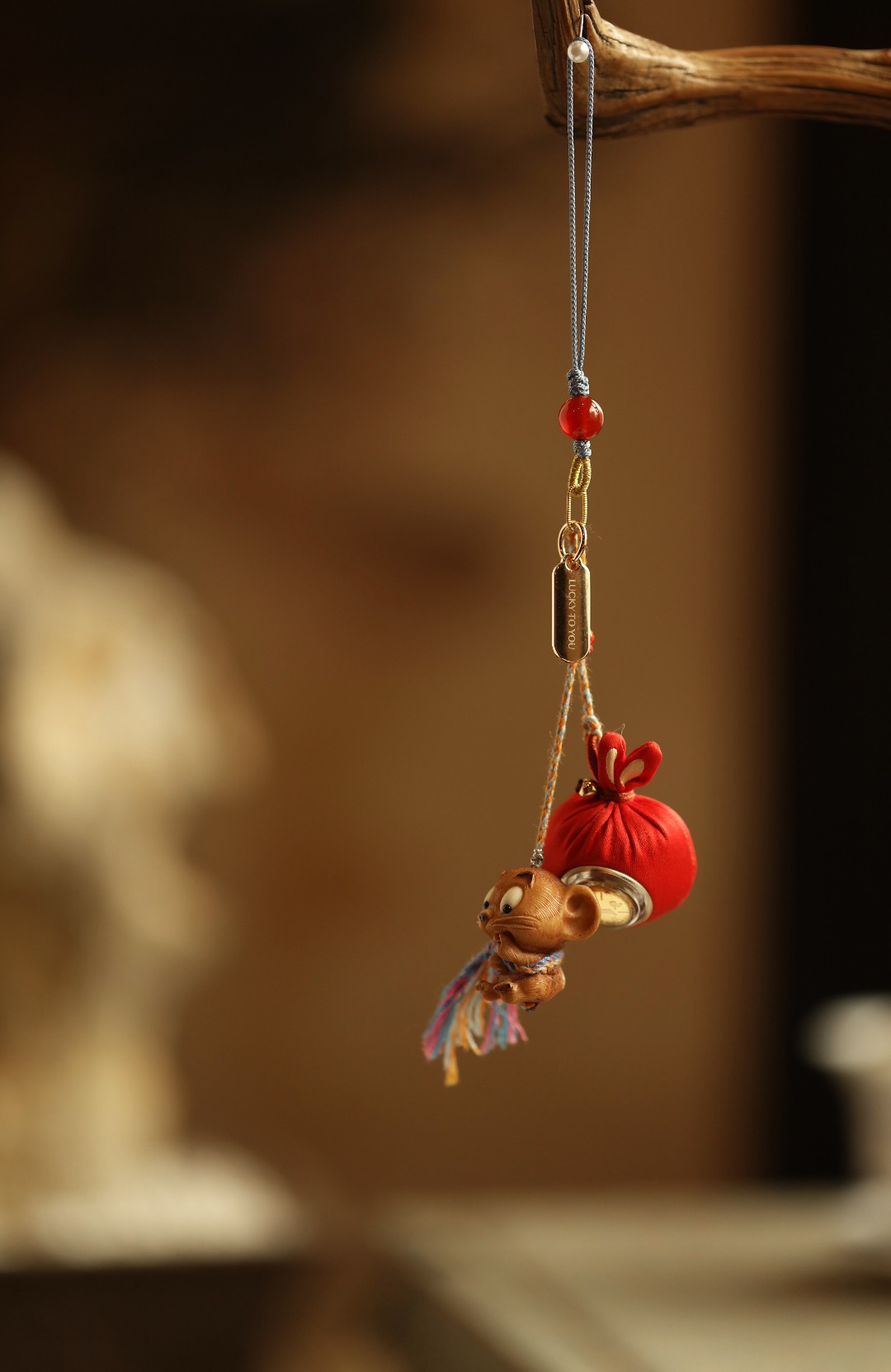 鹿角天然植物着色,多遍去留俏色 还原本真,不掉色。整体俏皮可爱,鼠(数)你聪明,锦缎福袋嵌字前途光明,寓招财纳福。