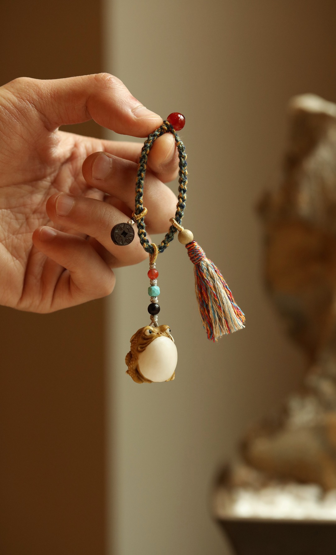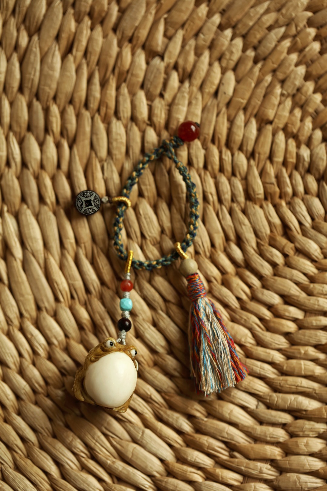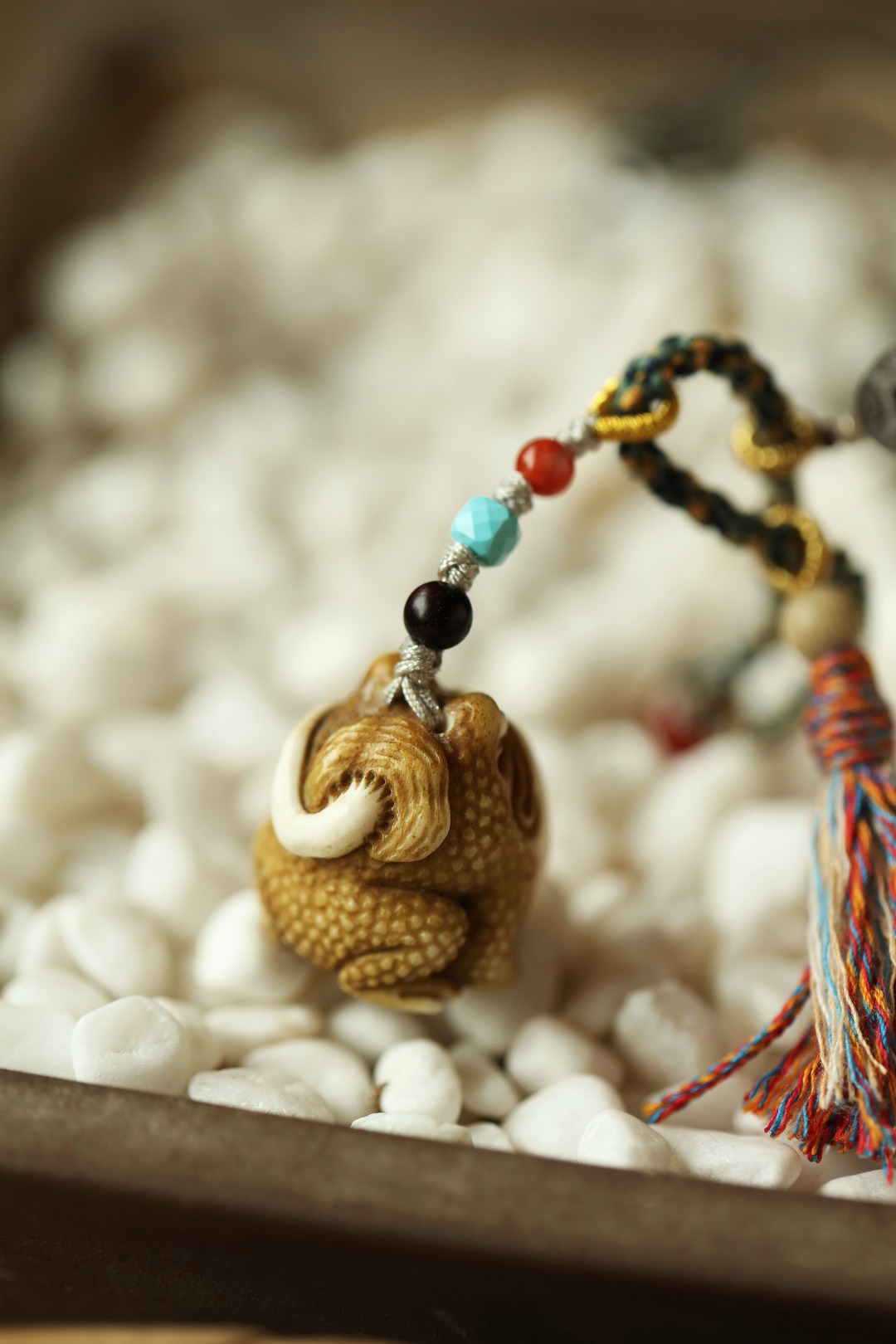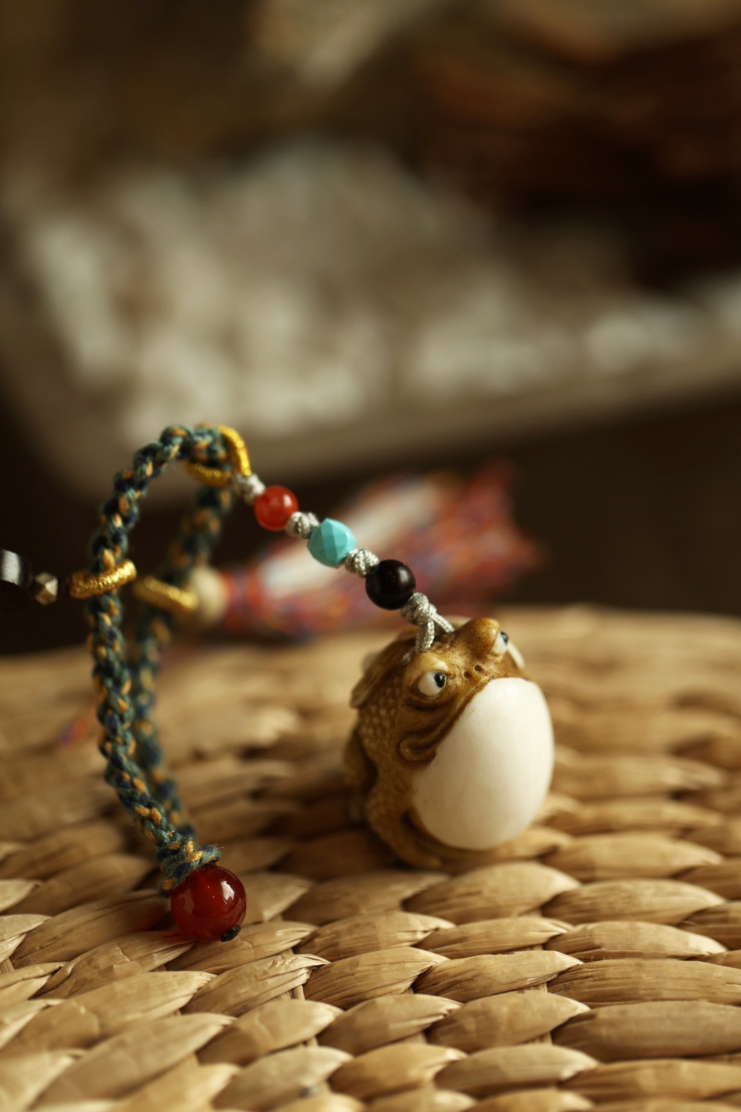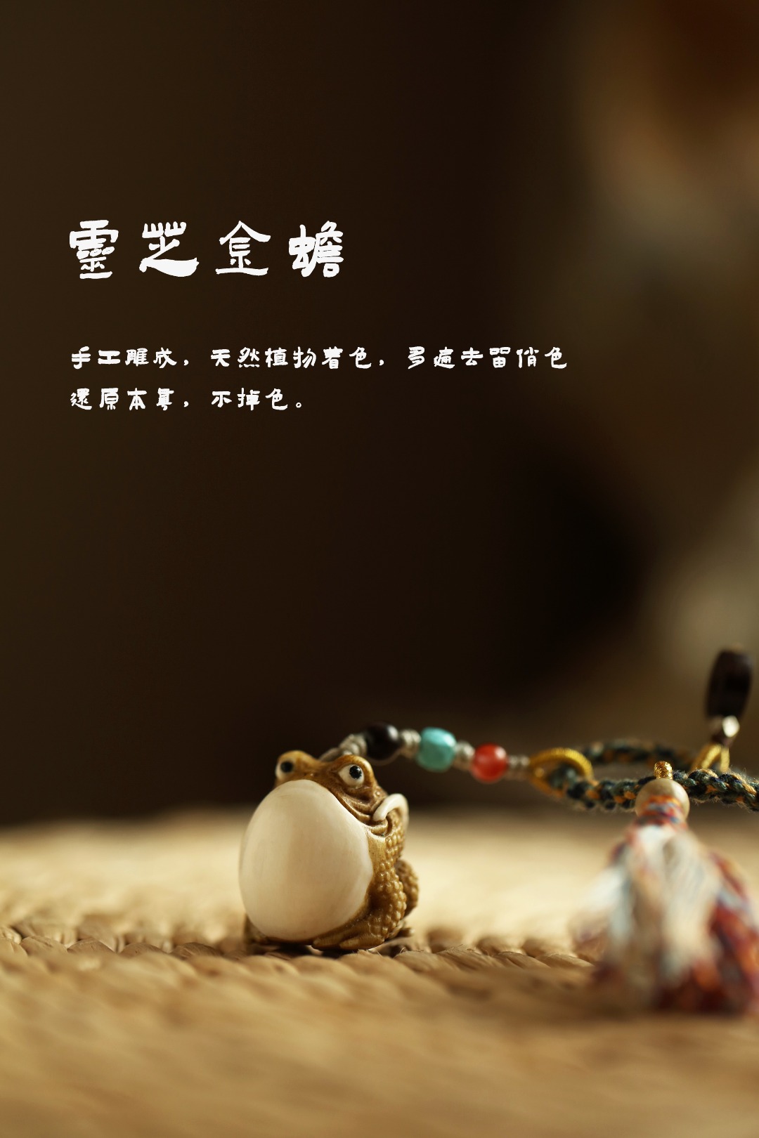 手工雕成,天然植物着色,多遍去留俏色 还原本真,不掉色。手刻灵芝金蟾,盎然灵气,饱满圆润,呱呱来财!