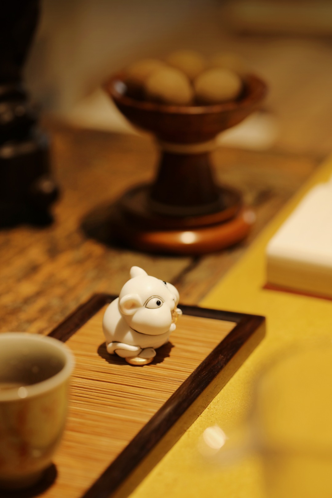 原材雕刻,手感饱满,瑞鼠神情俏皮,手抱铜钱,置茶席案头,寓招财纳福!