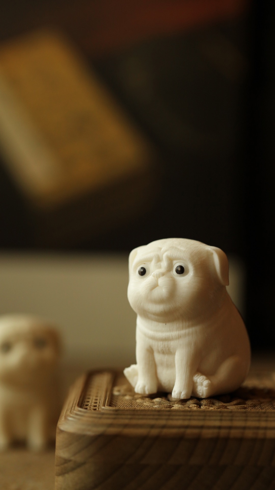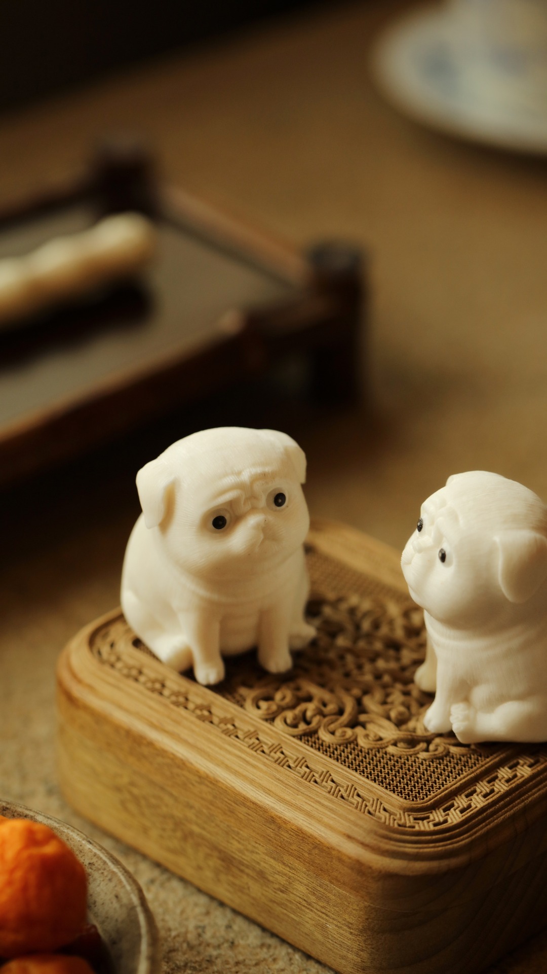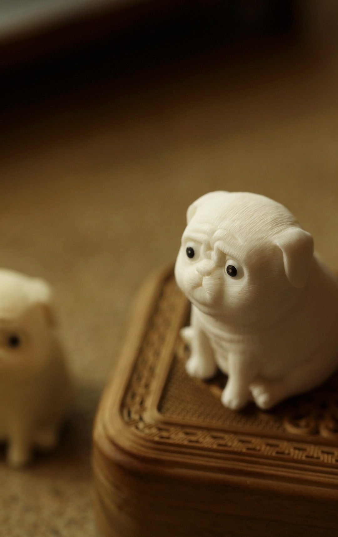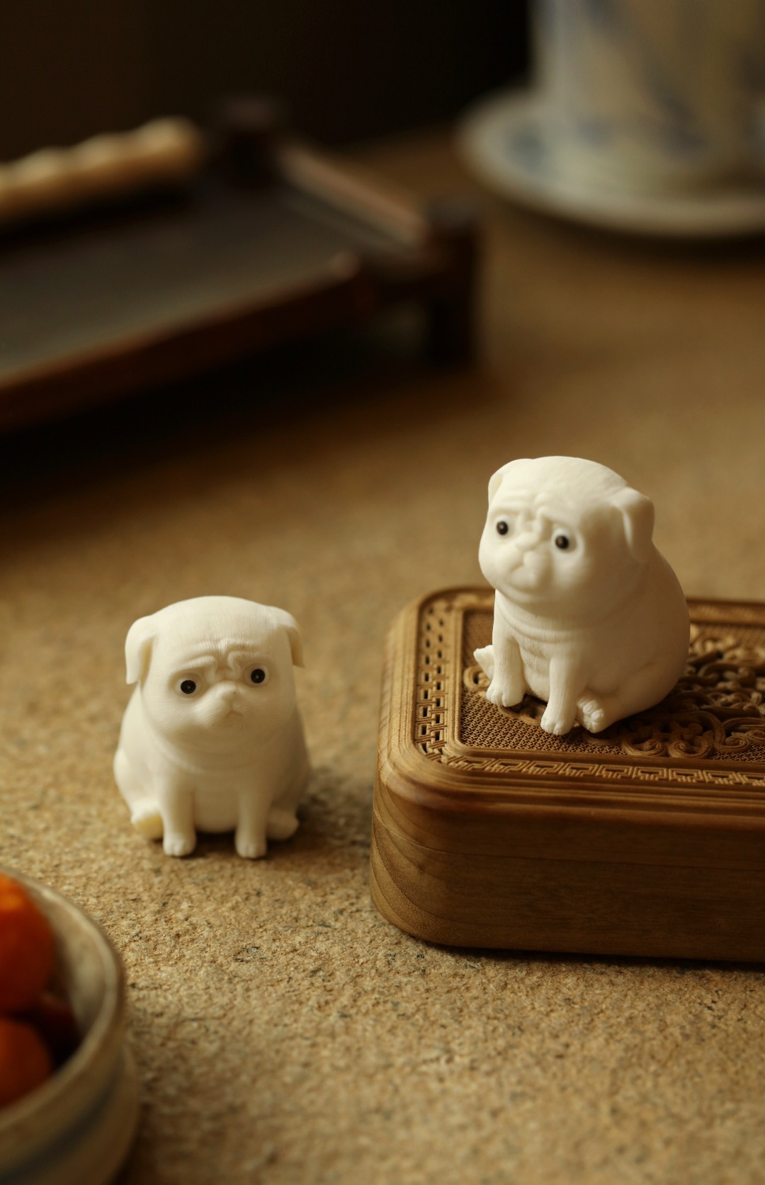鹿角手工雕刻,开丝丰富细密,体态浑圆可喜,神情萌趣生动。置放茶席案头,雅趣横生。
