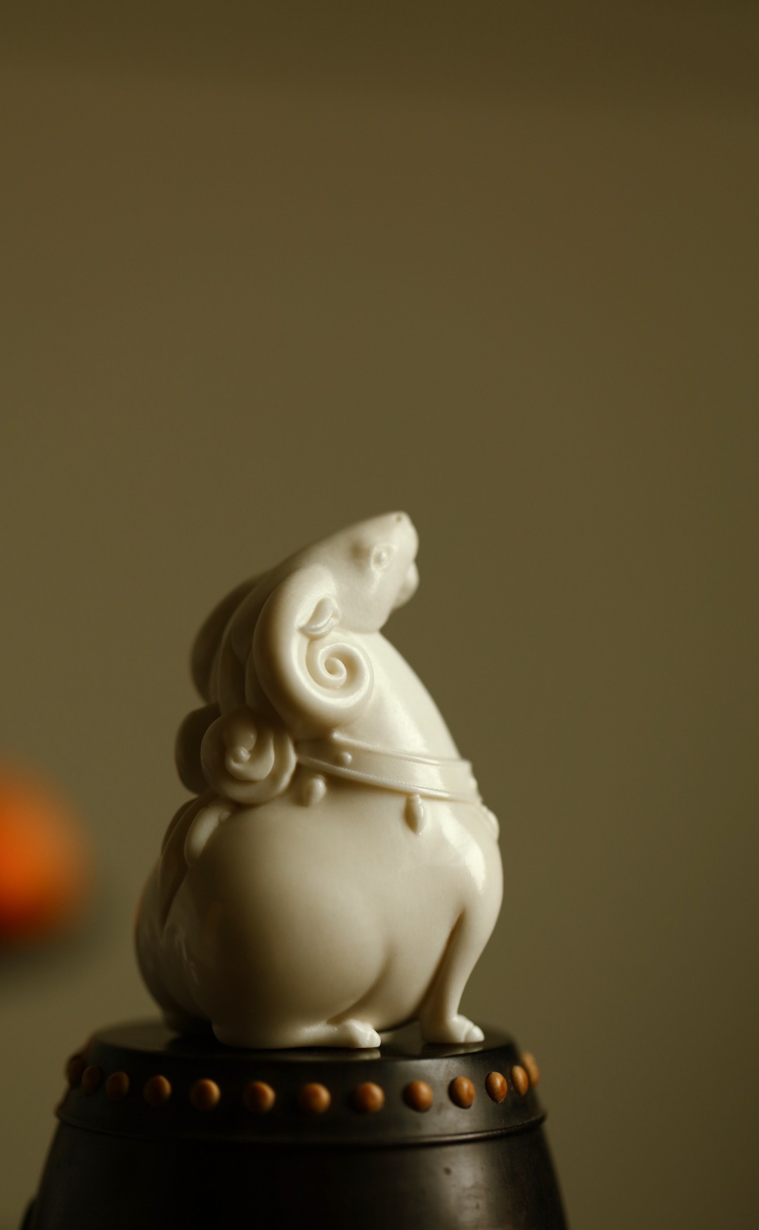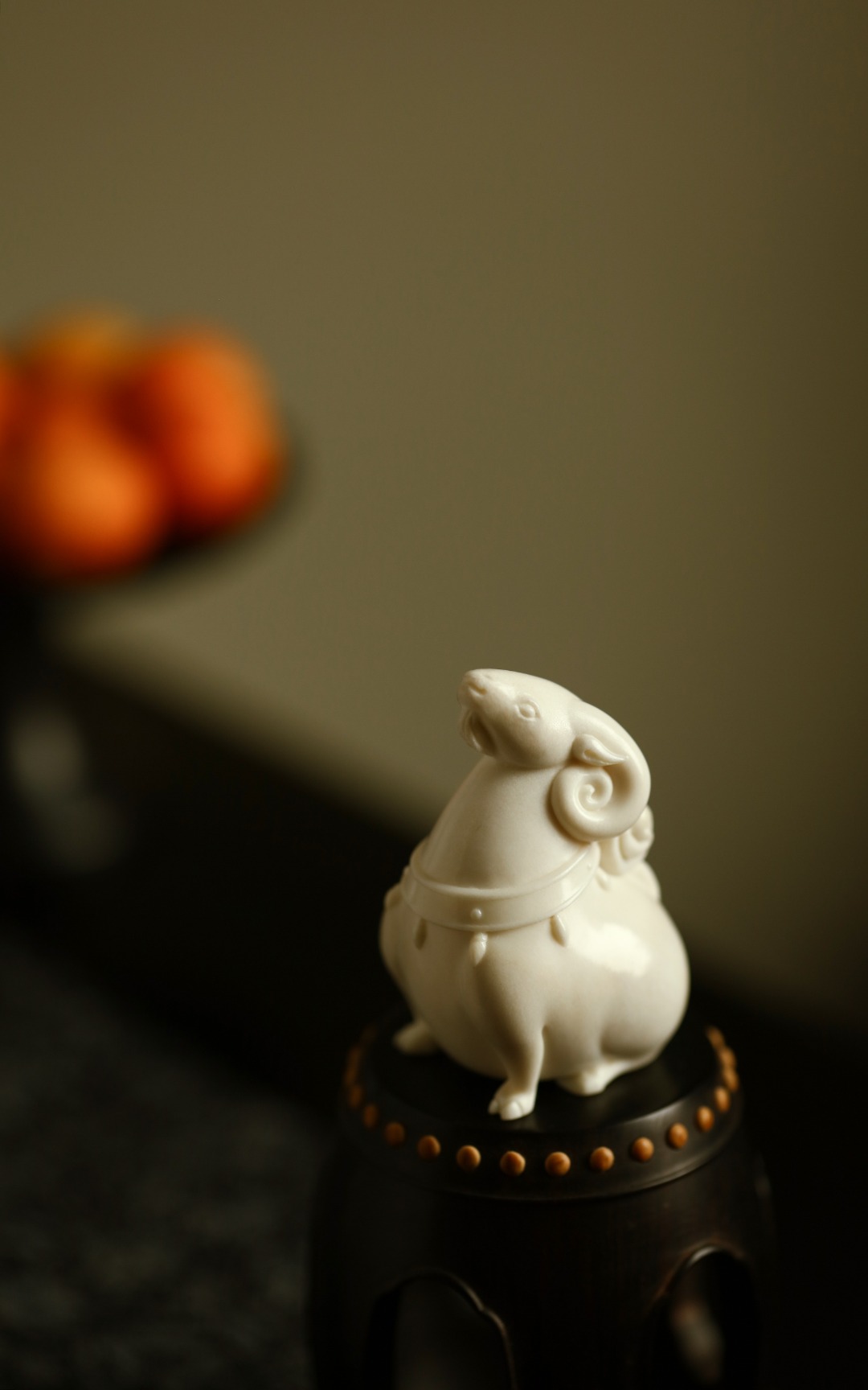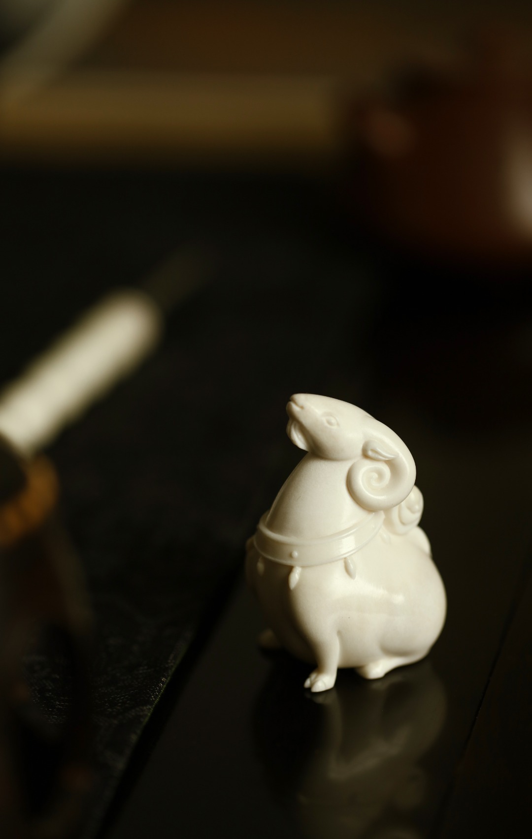 择料洁白如玉,案头陈设把玩,羊谐音“祥”“阳”有三阳开泰、喜气洋洋、吉祥和美之意。