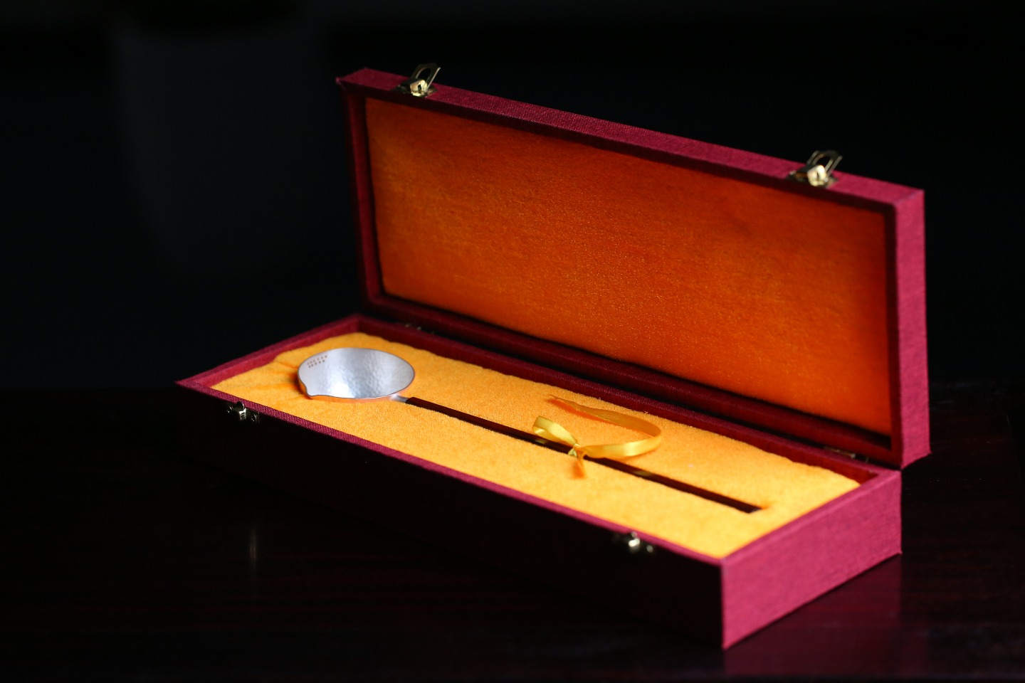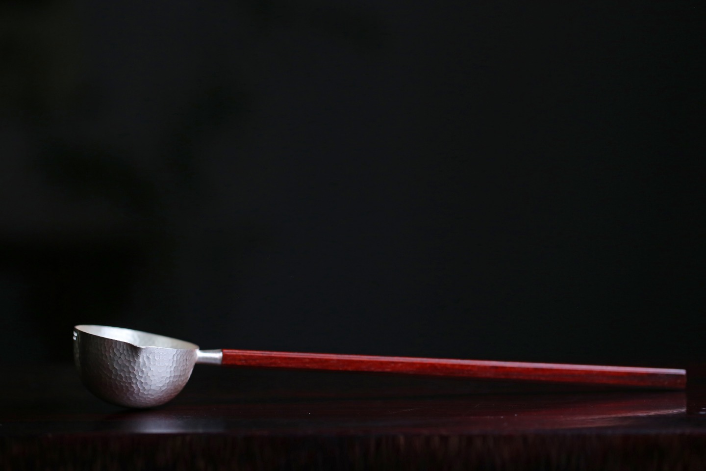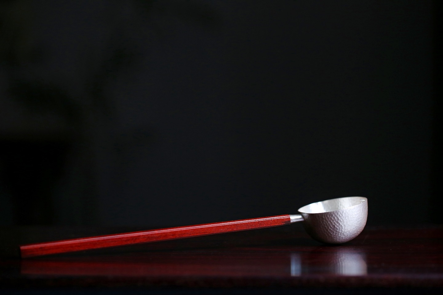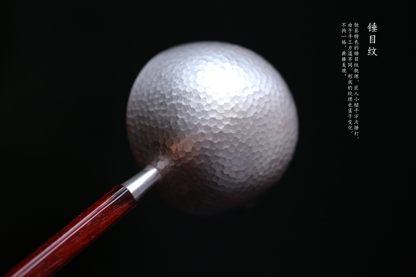 【工艺】手的温度、匠心打造,手工一锤一打锻造精致锤目纹茶勺,静雅的紫檀长手柄,雅致美观是它的基调,整器更具艺术感及奢华需求。