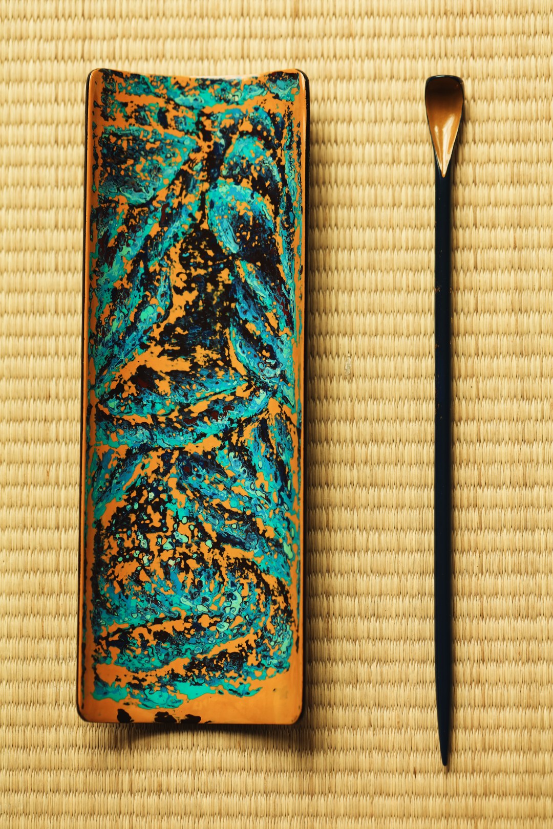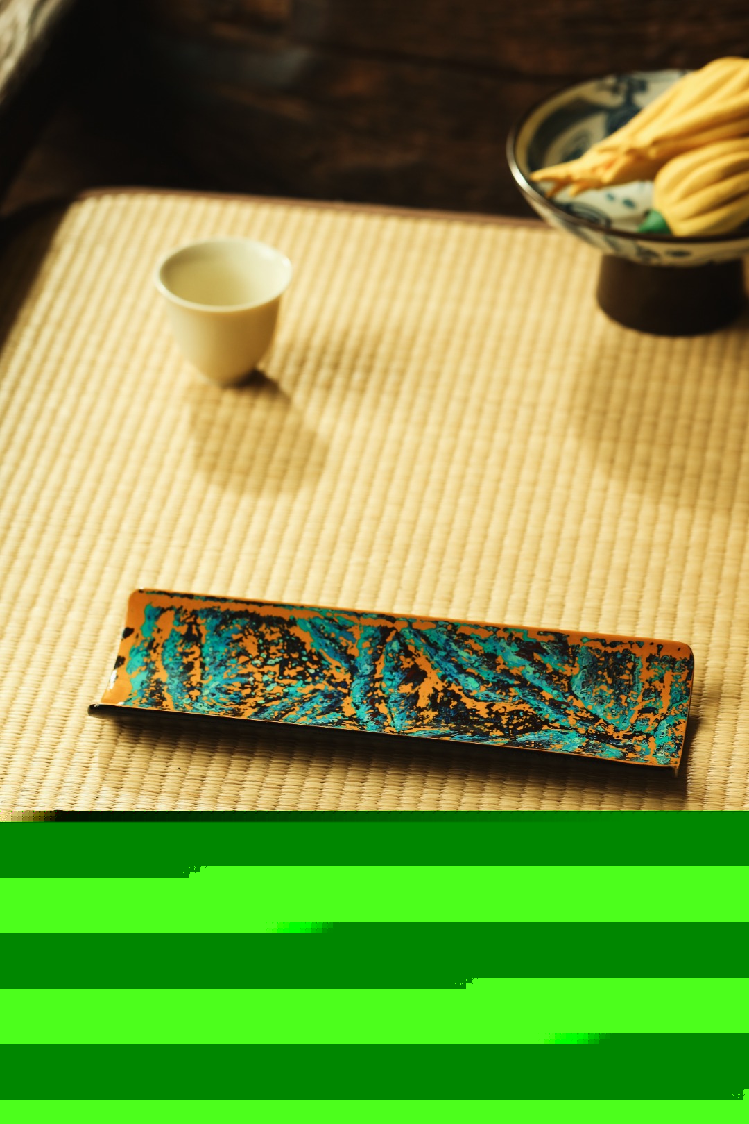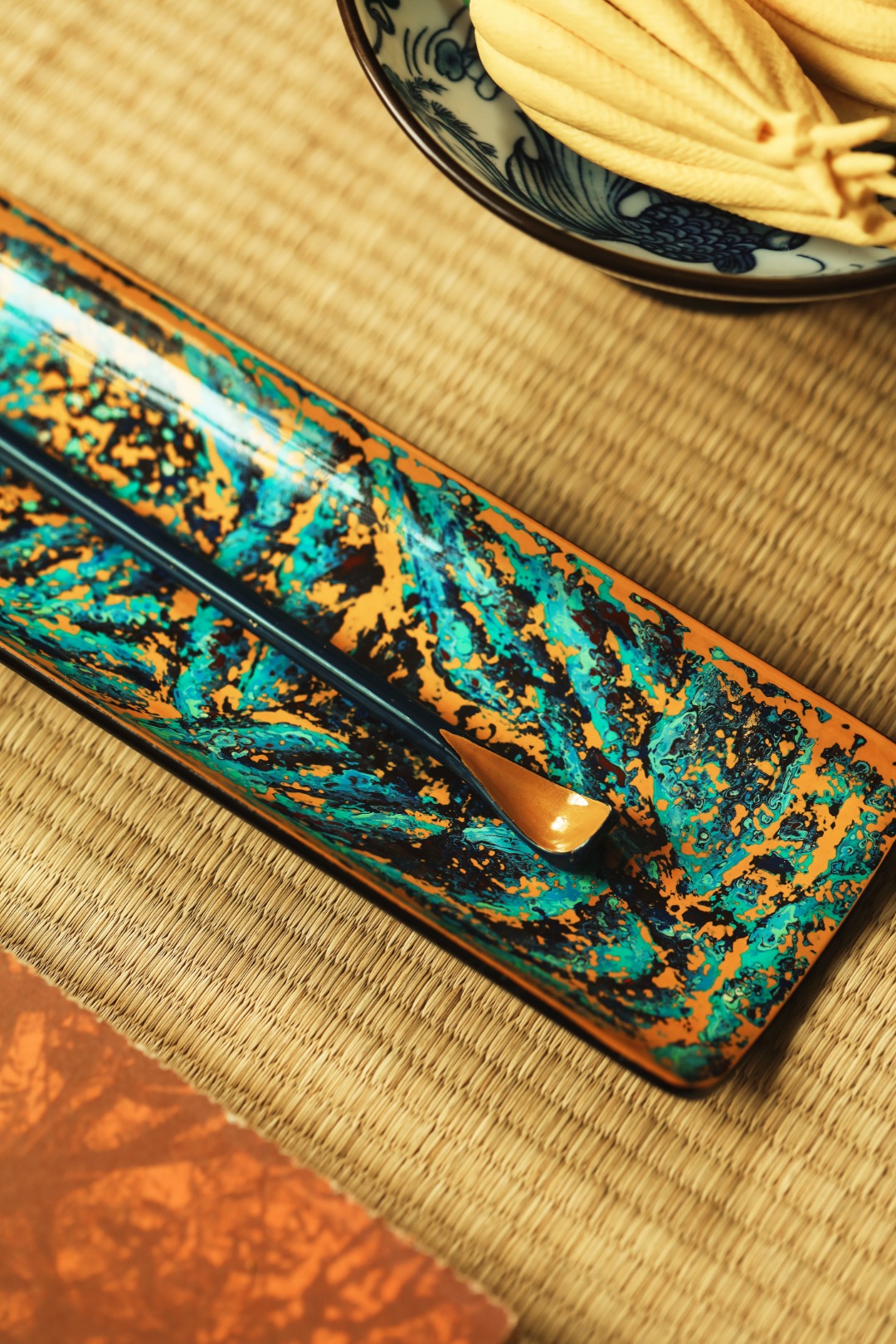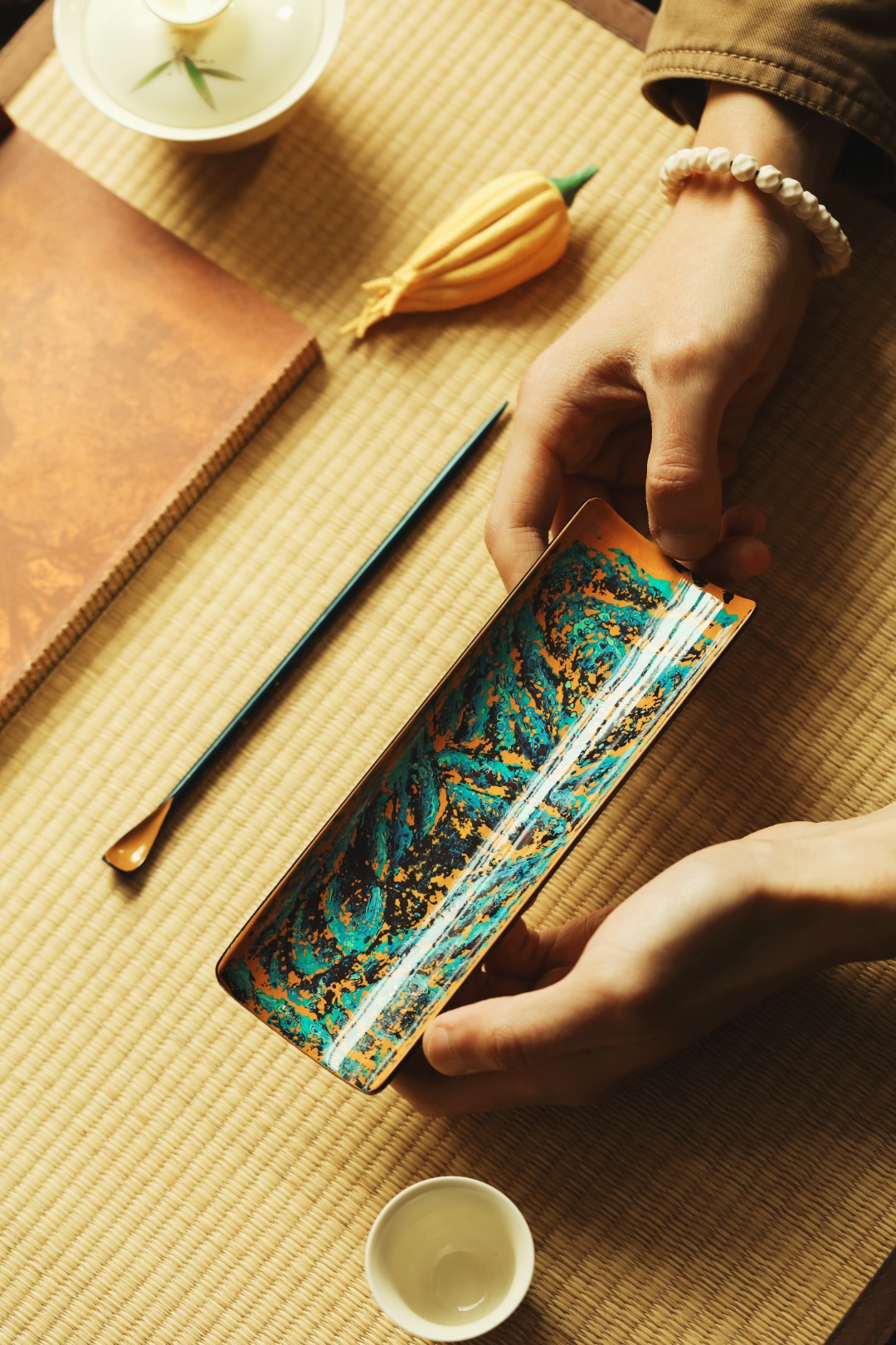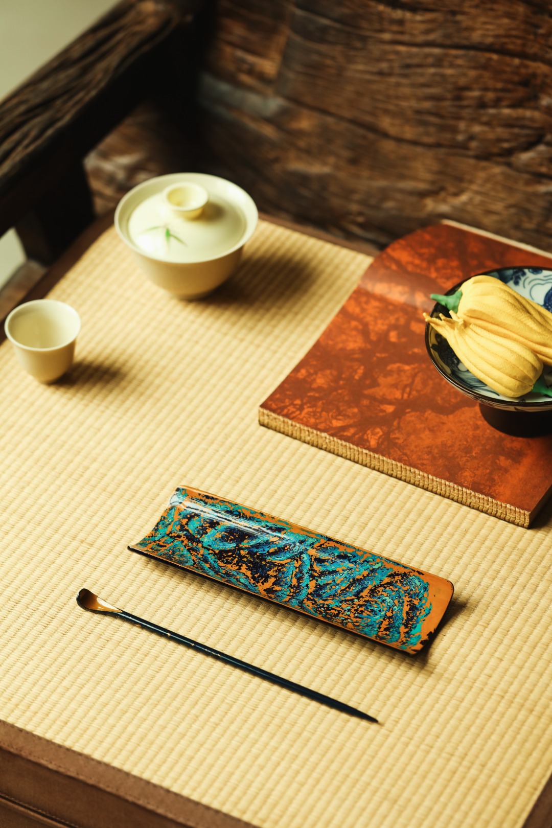 循传统工艺,逐层髹漆,斑斓多彩,宛若星空、山河,反复推光打磨,触手温润细腻。入茶席之间,辅以茶事,百观不厌。