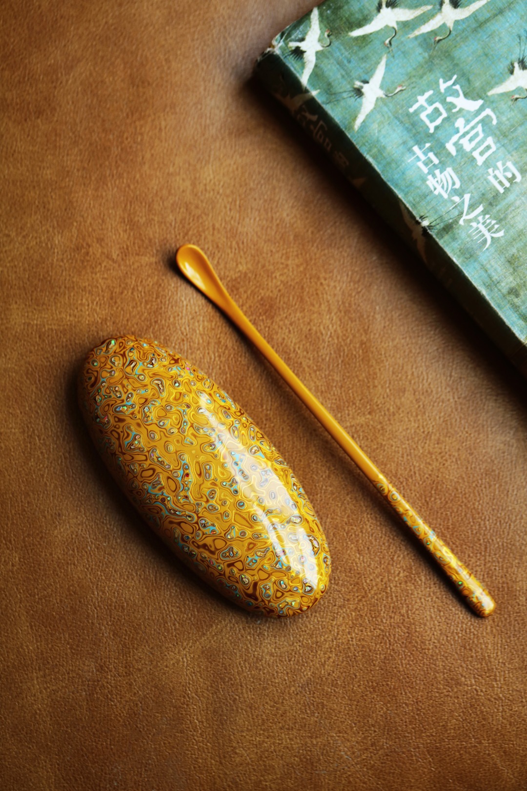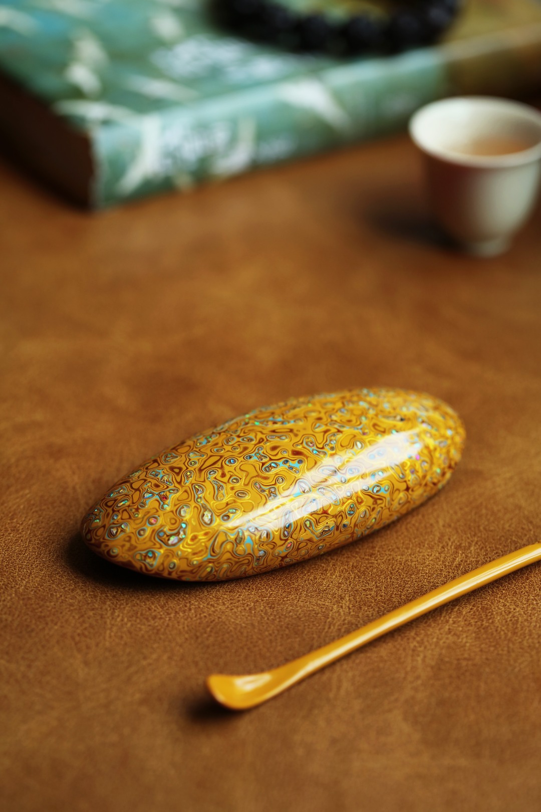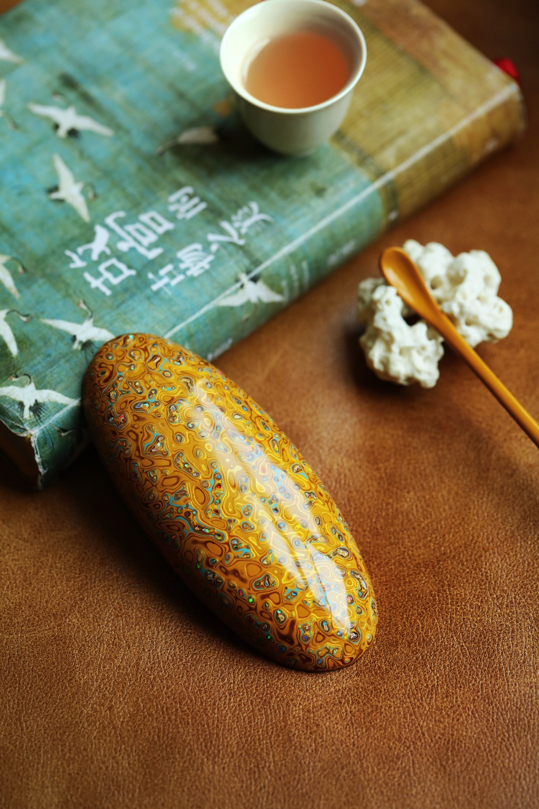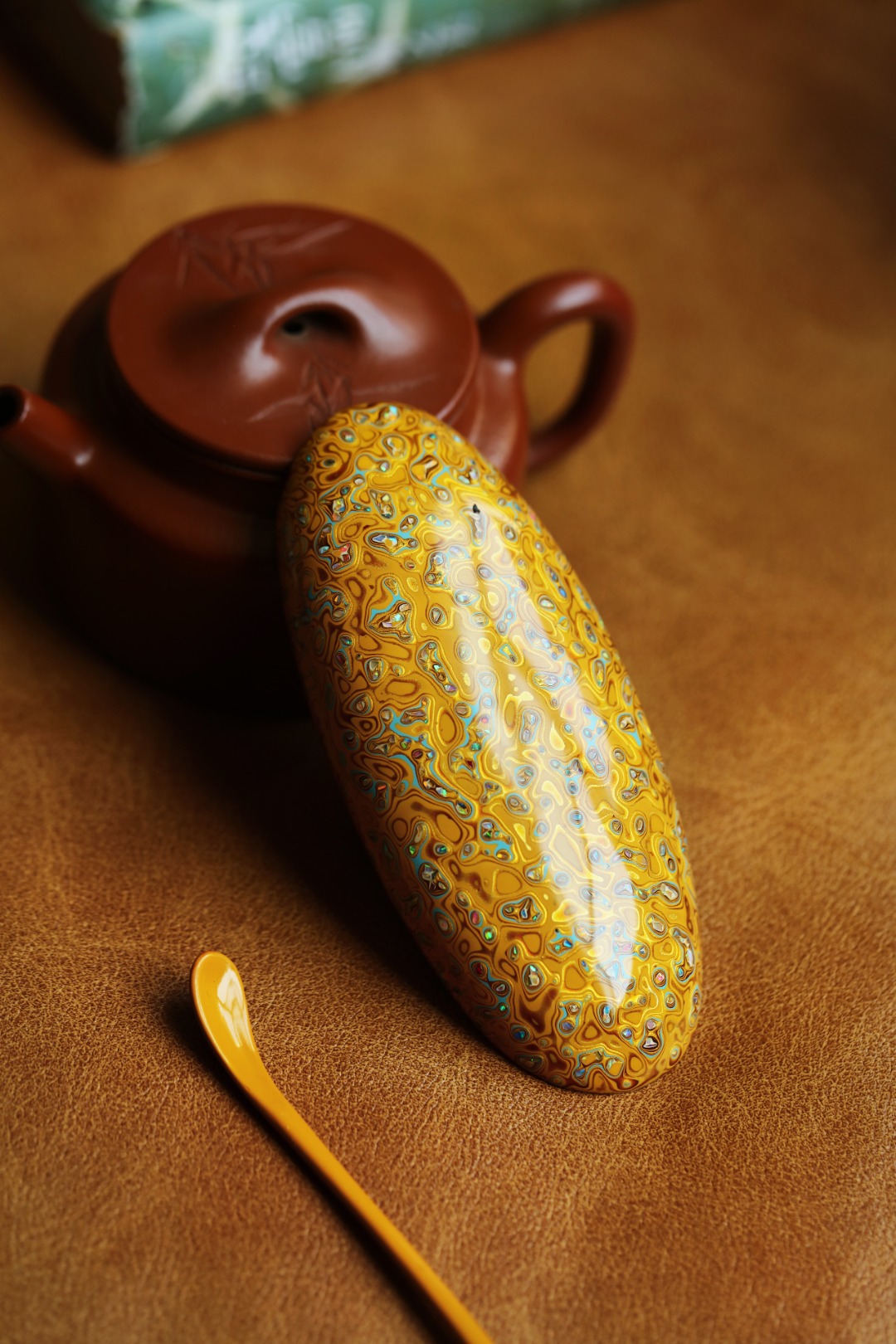 紫光檀为胎底,逐层髹漆,镶嵌多彩螺钿,斑斓多彩,反复推光打磨,触手温润细腻。入茶席之间,辅以茶事,百观不厌。