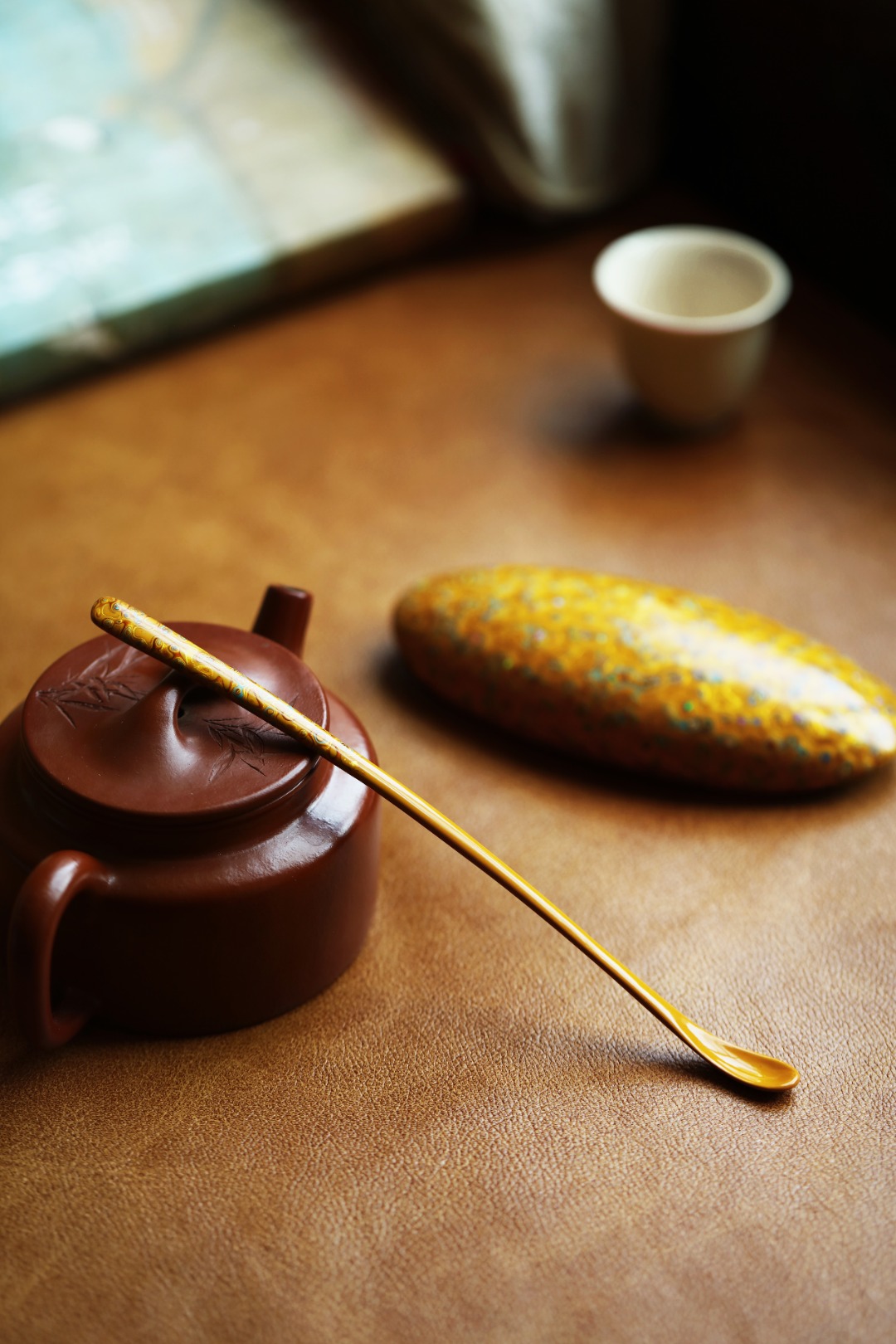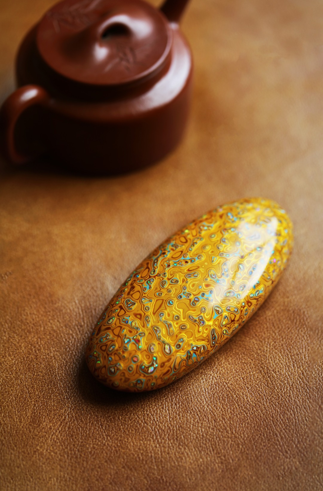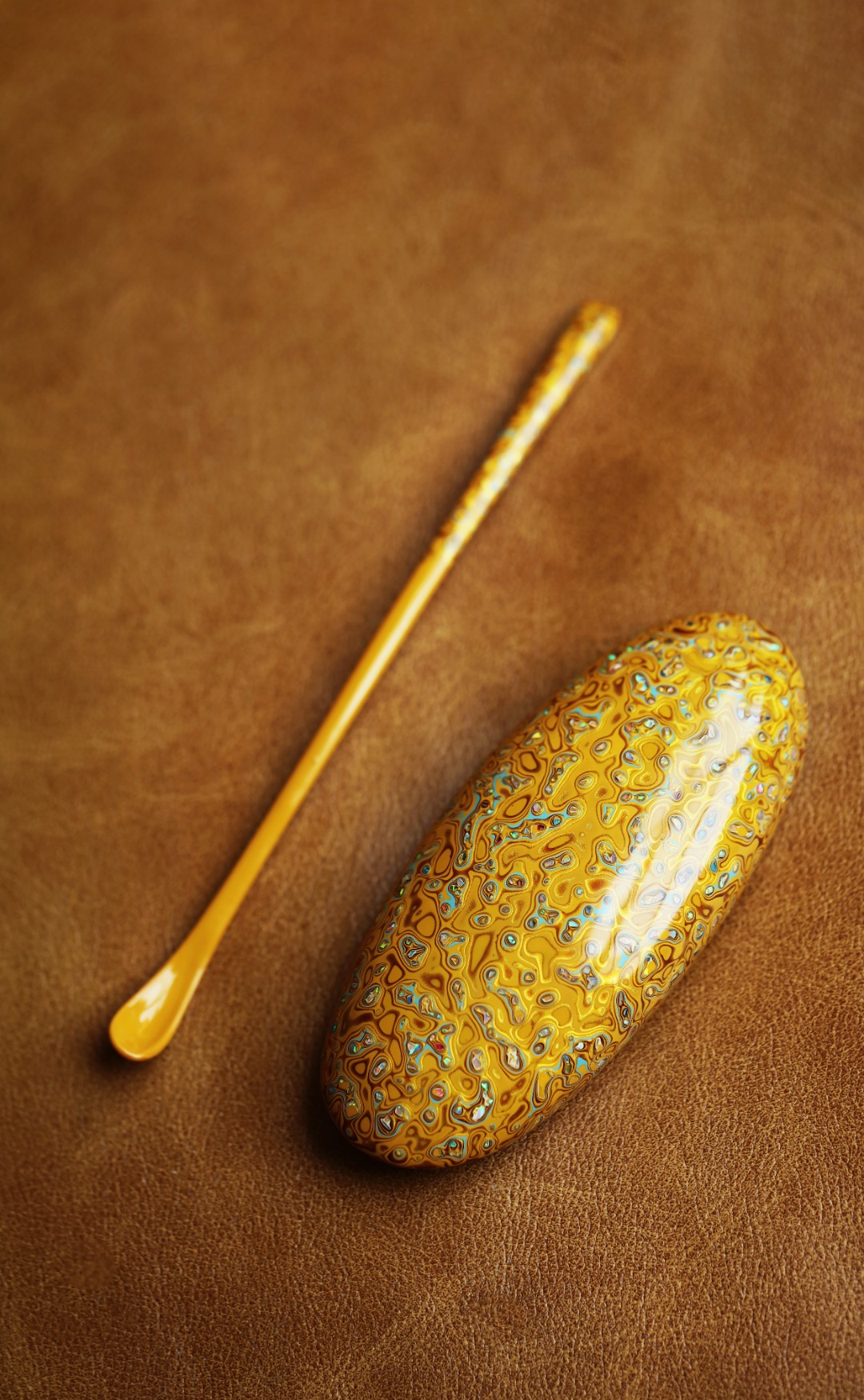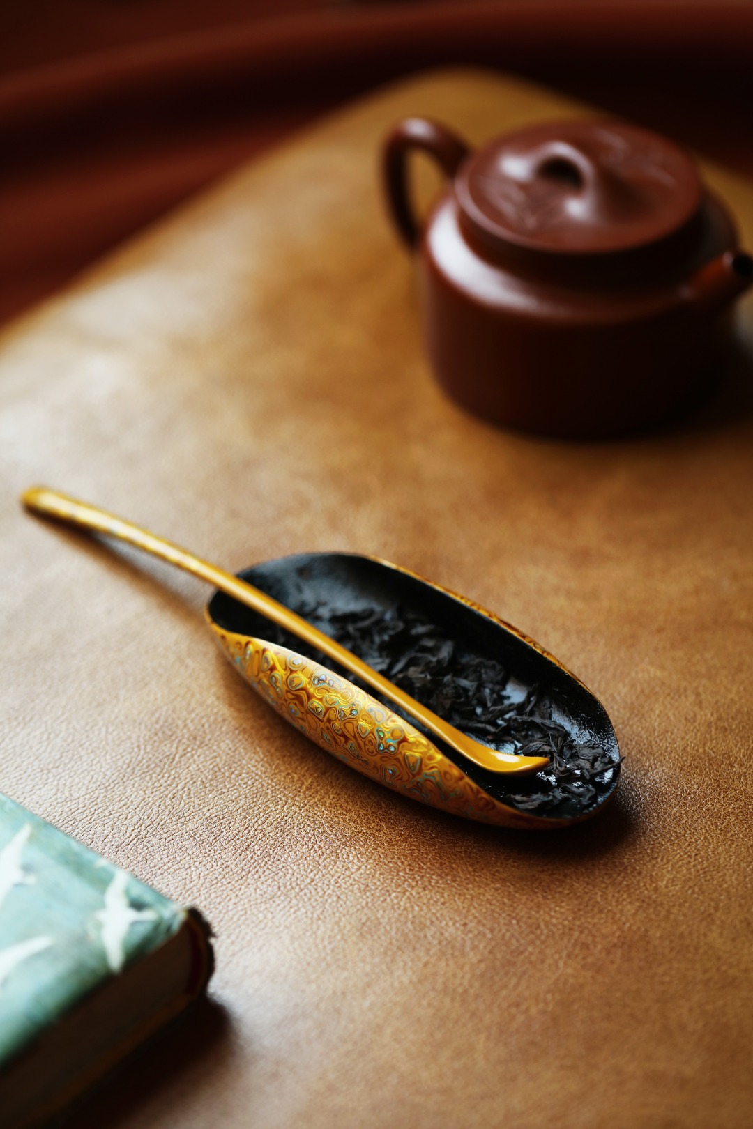 紫光檀为胎底,逐层髹漆,镶嵌多彩螺钿,斑斓多彩,反复推光打磨,触手温润细腻。入茶席之间,辅以茶事,百观不厌。